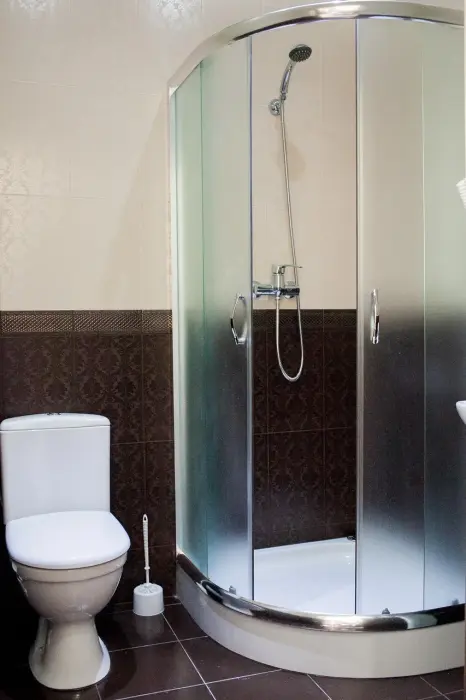 В ванной комнате: душевая кабина, туалет, туалетное зеркало, фен, предметы гигиены.