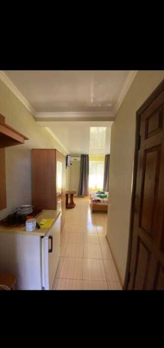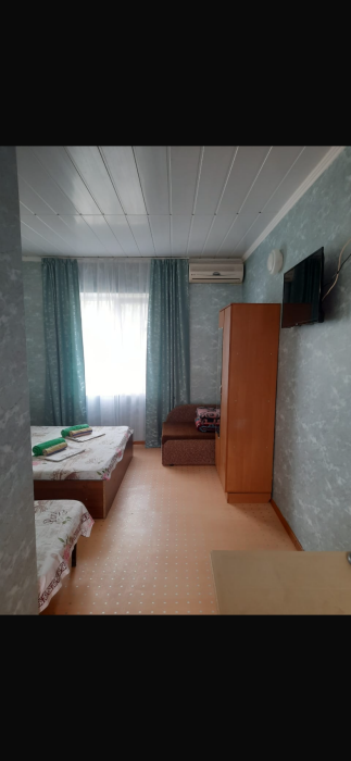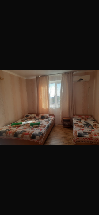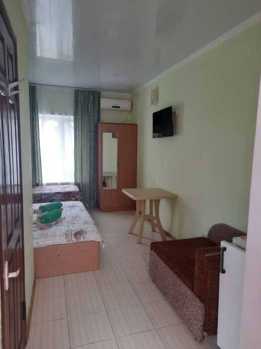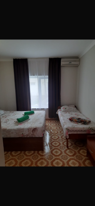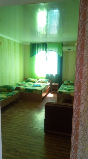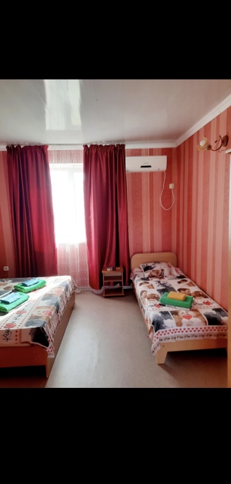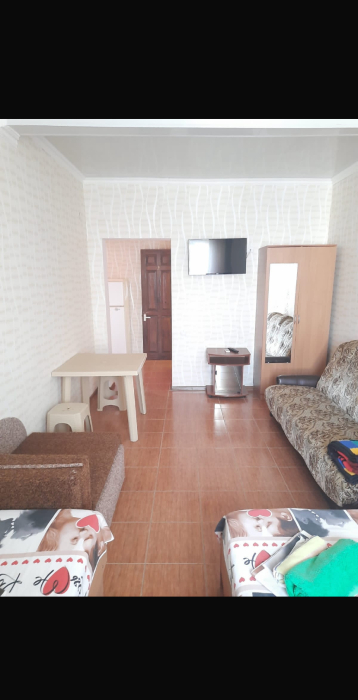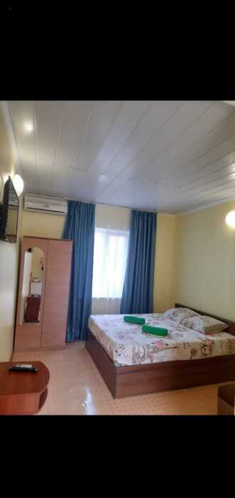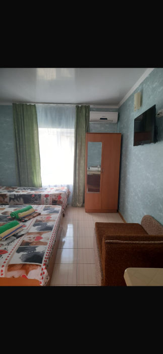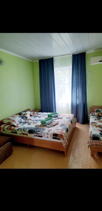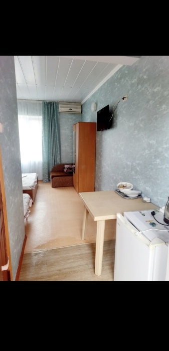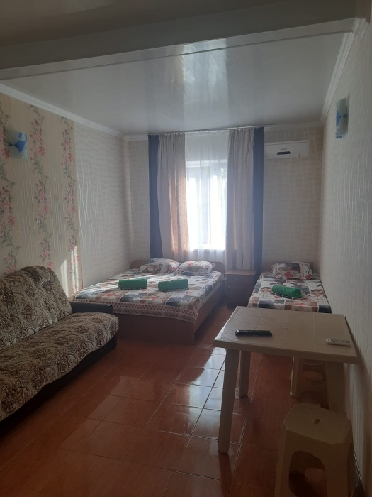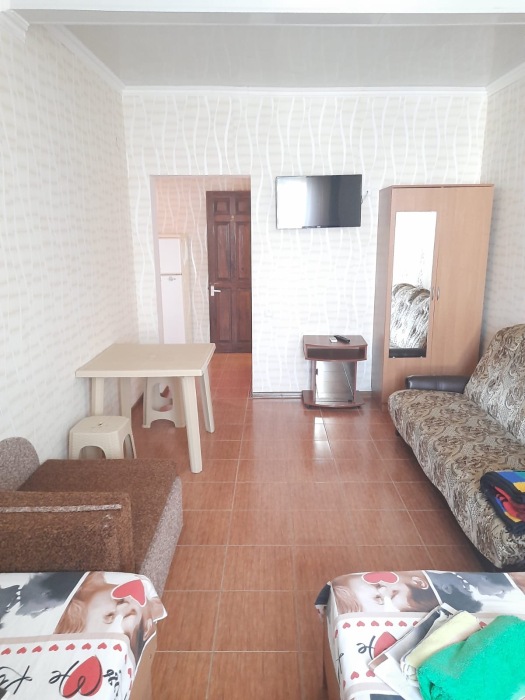 номера двух комнатные,до моря 200 метров. В номере санузел,душевая,телевизор,кондиционер,холодильник,чайник,микроволновая печь,шкаф,вай фай, необходимоя посуда,возле номера на террасе у каждого свой столик,во дворе большая беседка со столиками