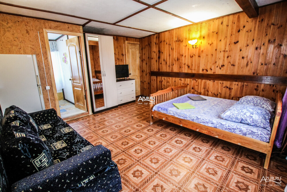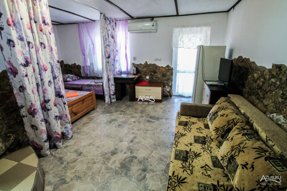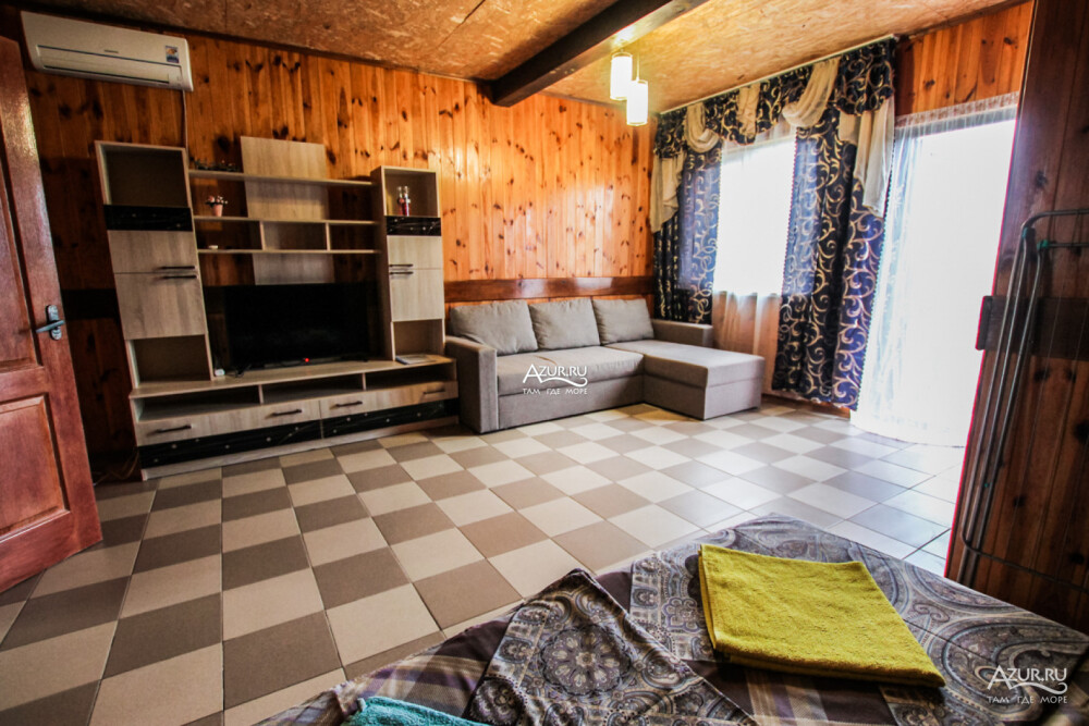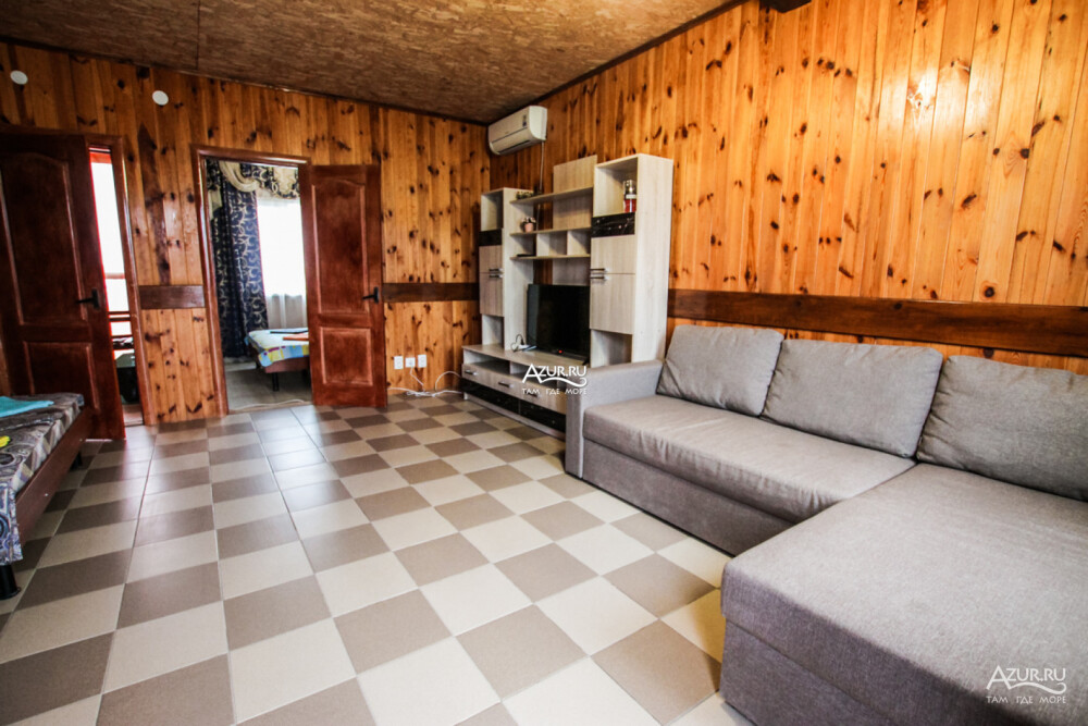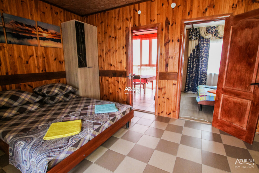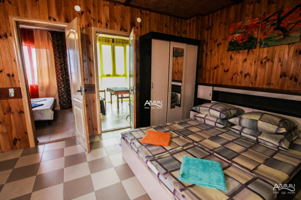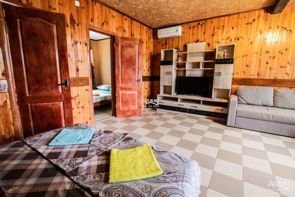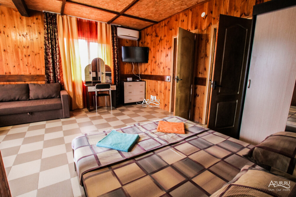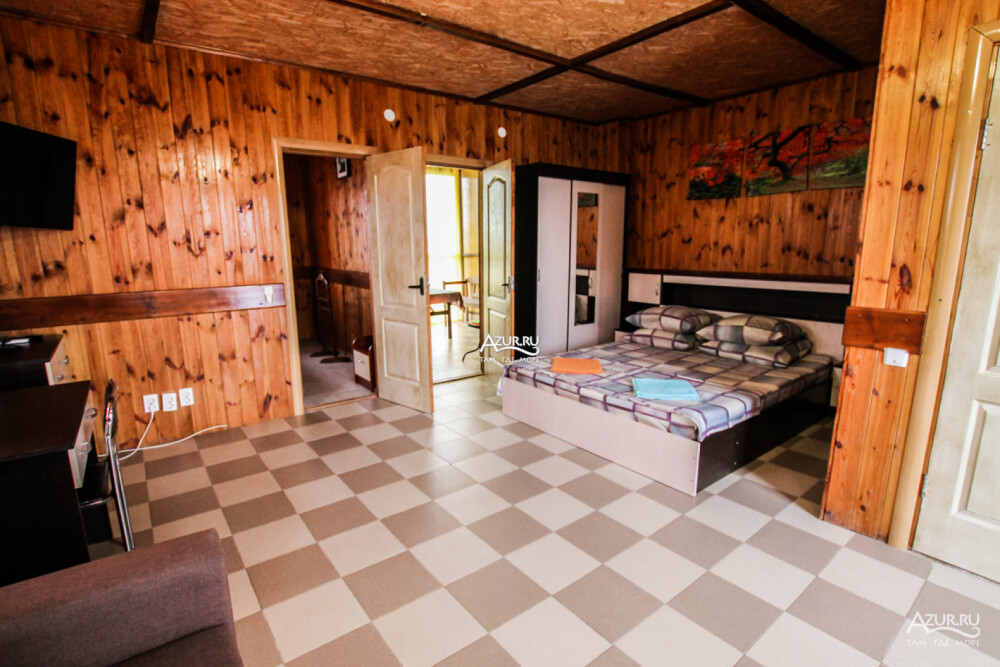 Номер расположен на первом этаже. имеет две смежные комнаты. Сан.узел в номере. Номер имеет свою беседку с обеденной зоной. Интерьер первой комнаты: двуспальная кровать с прикроватными тумбочками, шкаф плательно/бельевой, телевизор ЖК 41d, вешалка с зеркалом и тумба под сумки, холодильник, кондиционер. Вторая комната: две односпальные кровати с прикроватными тумбочками, шкаф плательно/бельевой с зеркалом, телевизор ЖК 35d, стол письменный, стул офисный. Сан.узел: душевая зона со шторой, унитаз, умывальник, держатель для полотенец, фен, зеркало.