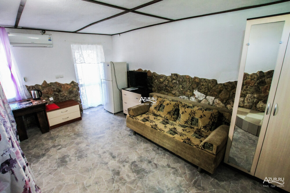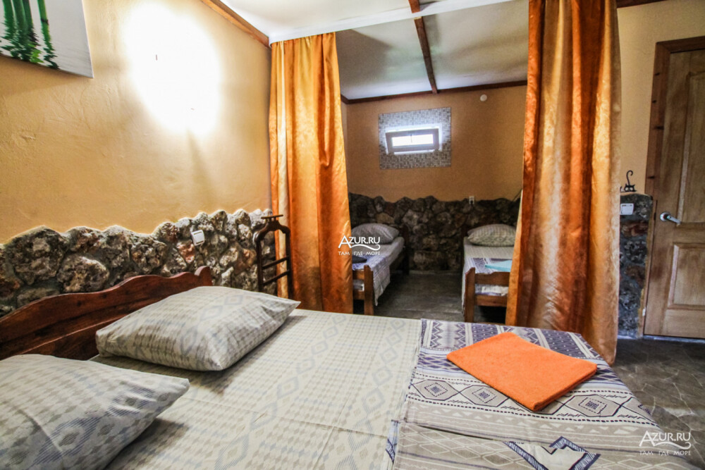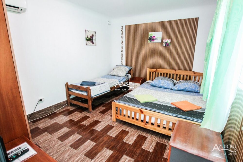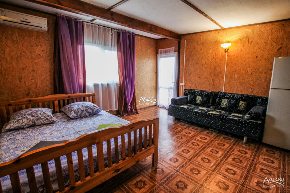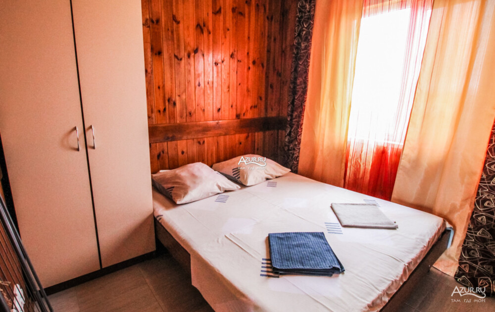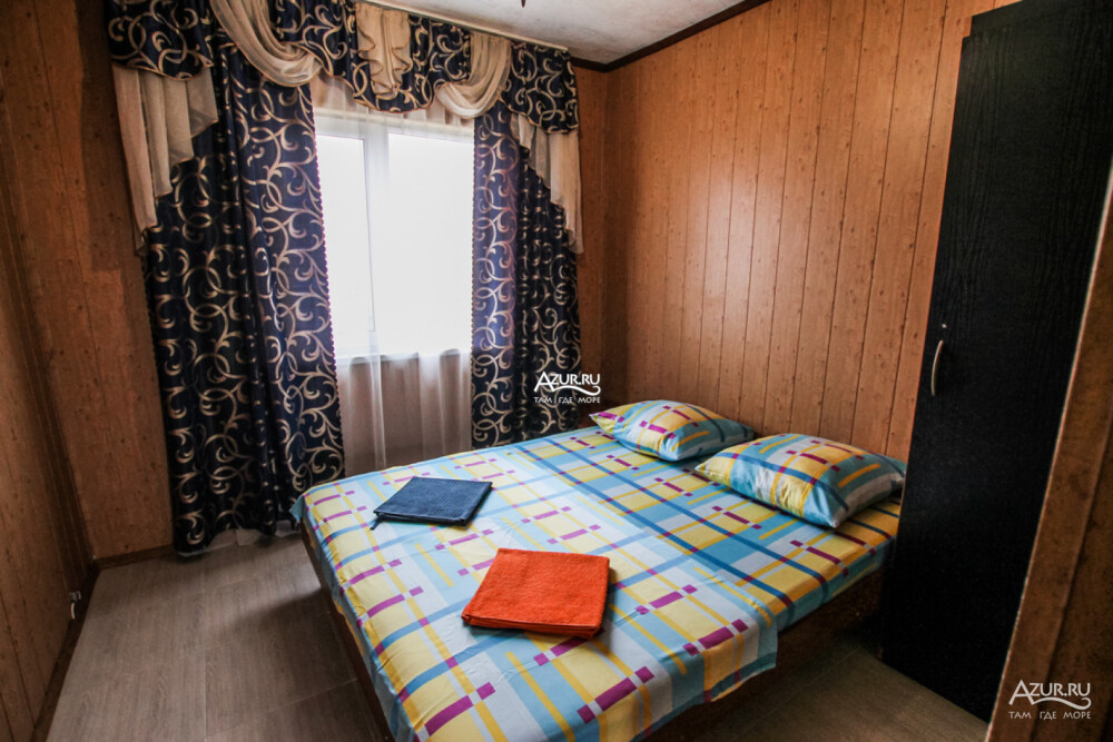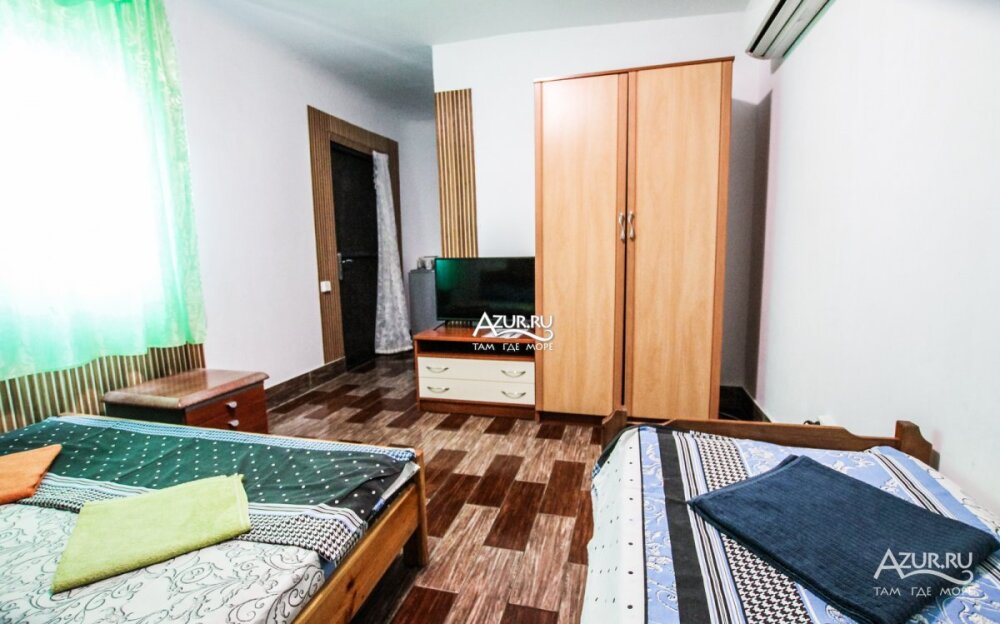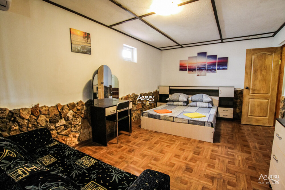 Номер расположен на первом этаже. имеет две смежные комнаты. Сан.узел в номере. Номер имеет свою беседку с обеденной зоной. Интерьер первой комнаты: двуспальная кровать с прикроватными тумбочками, шкаф плательно/бельевой, телевизор ЖК 41d, вешалка с зеркалом и тумба под сумки, холодильник, кондиционер. Вторая комната: две односпальные кровати с прикроватными тумбочками, шкаф плательно/бельевой с зеркалом, телевизор ЖК 35d, стол письменный, стул офисный. Сан.узел: душевая зона со шторой, унитаз, умывальник, держатель для полотенец, фен, зеркало.