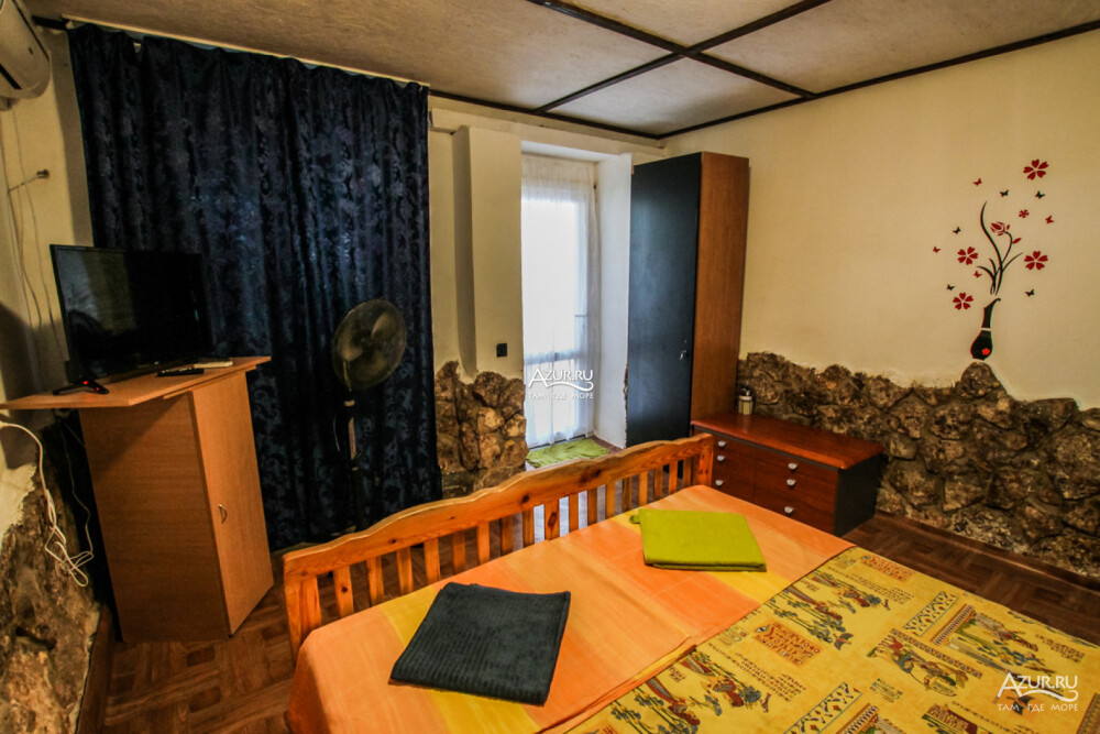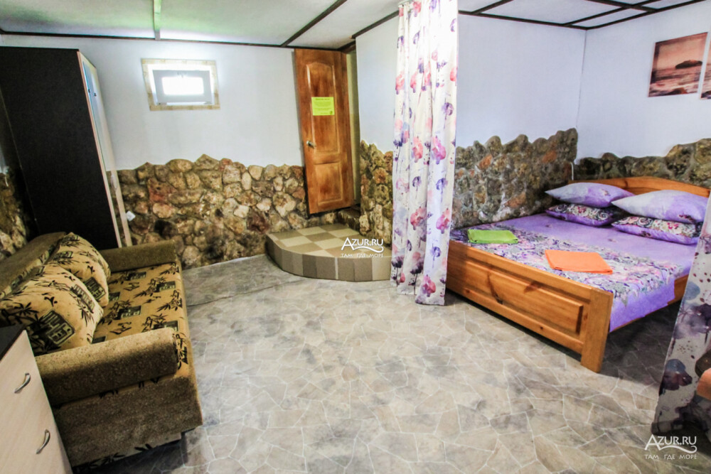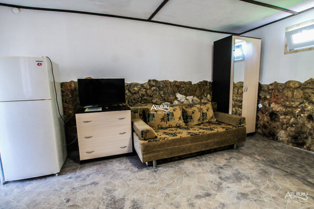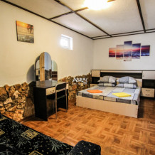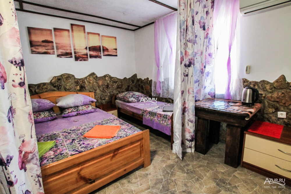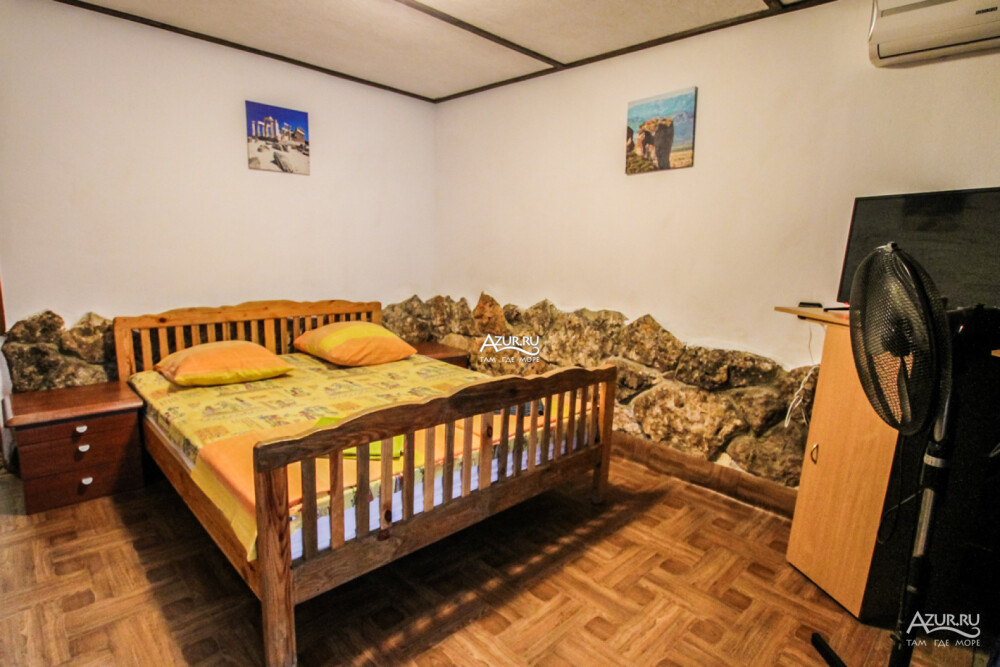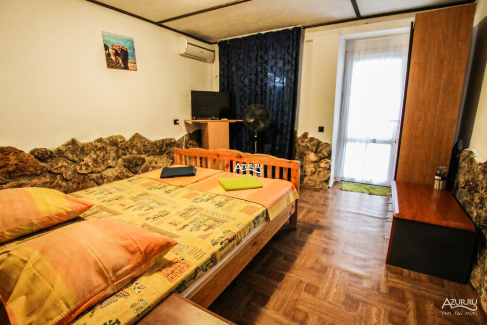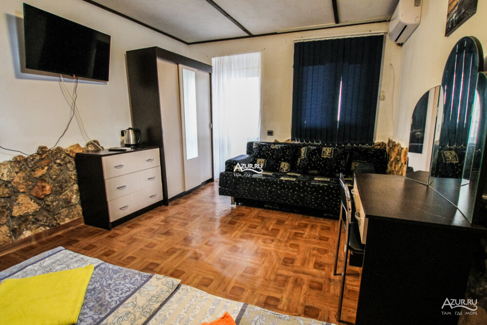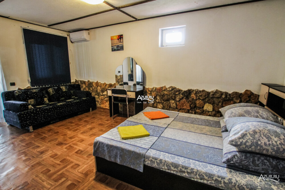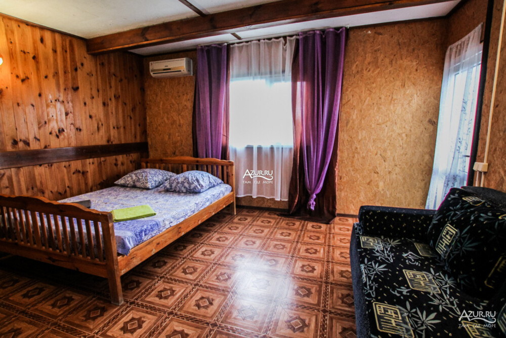 Номер расположен на первом этаже. имеет две смежные комнаты. Сан.узел в номере. Номер имеет свою беседку с обеденной зоной. Интерьер первой комнаты: двуспальная кровать с прикроватными тумбочками, шкаф плательно/бельевой, телевизор ЖК 41d, вешалка с зеркалом и тумба под сумки, холодильник, кондиционер. Вторая комната: две односпальные кровати с прикроватными тумбочками, шкаф плательно/бельевой с зеркалом, телевизор ЖК 35d, стол письменный, стул офисный. Сан.узел: душевая зона со шторой, унитаз, умывальник, держатель для полотенец, фен, зеркало.