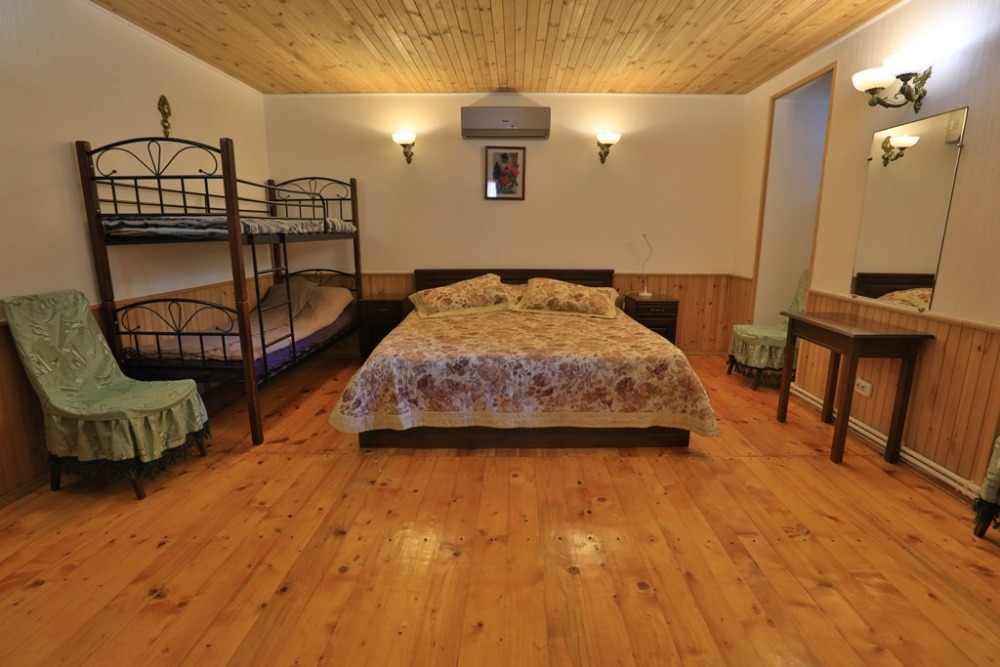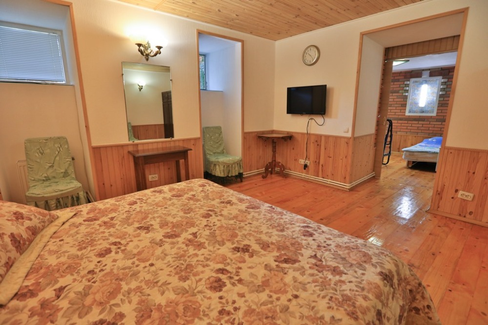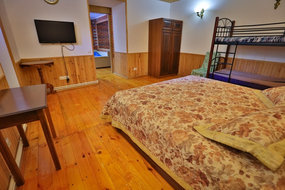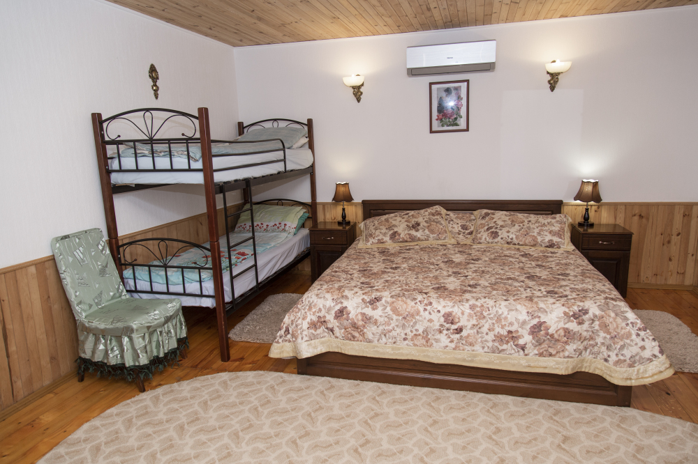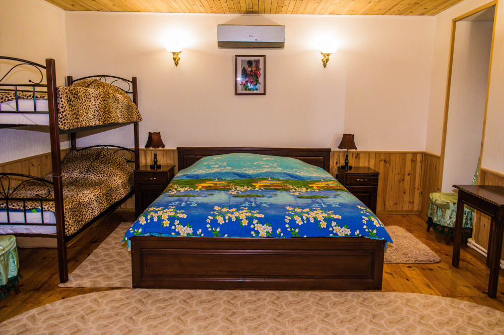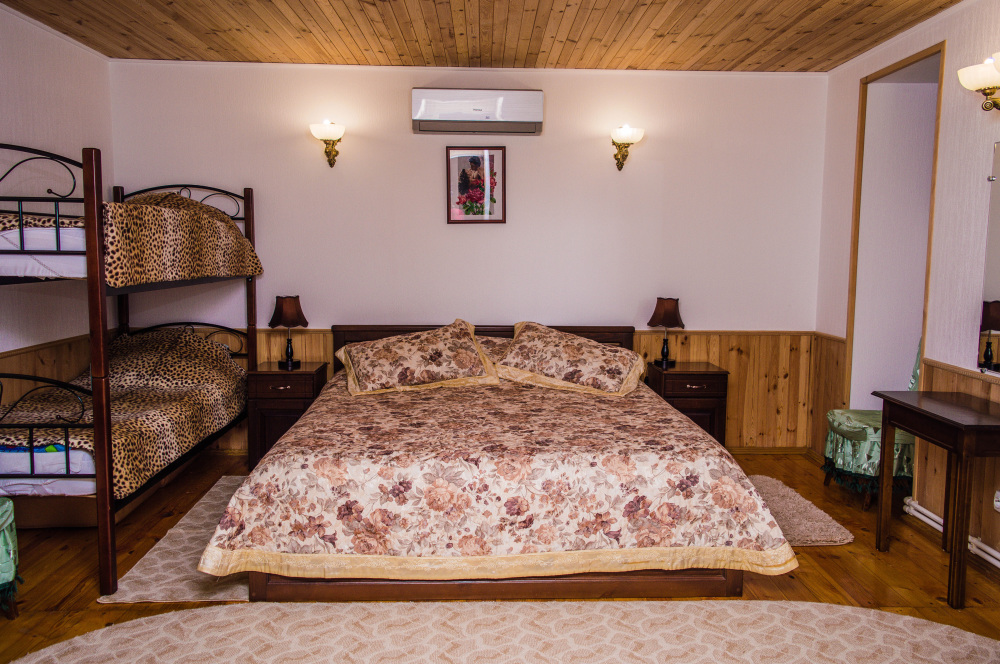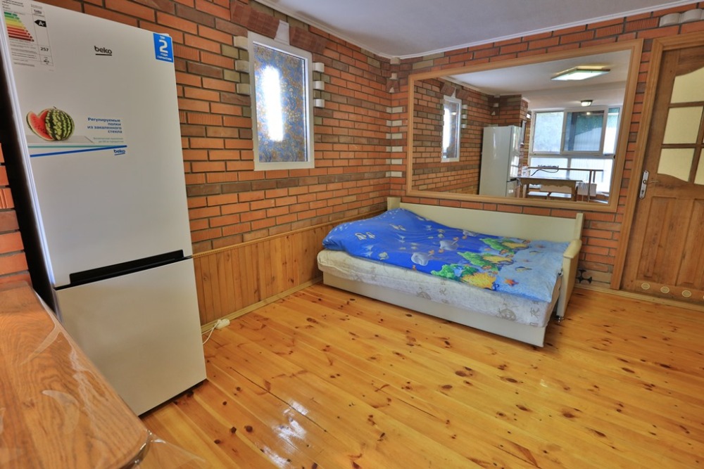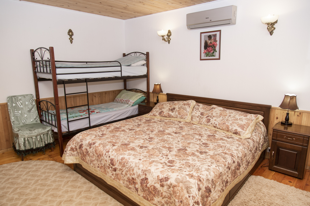 У нас на территории есть отдельный дом со своим двором и парковкой «Нижний дом»: спальня с 2х спальной кроватью и 2х ярусной детской кроватью, санузел, большая проходная комната с 2х спальным диваном и зоной кухни. Общая площадь дома 50 м2, максимальная вместимость 4 взрослых и 2 детей.