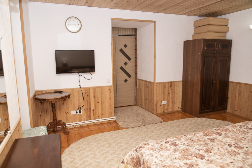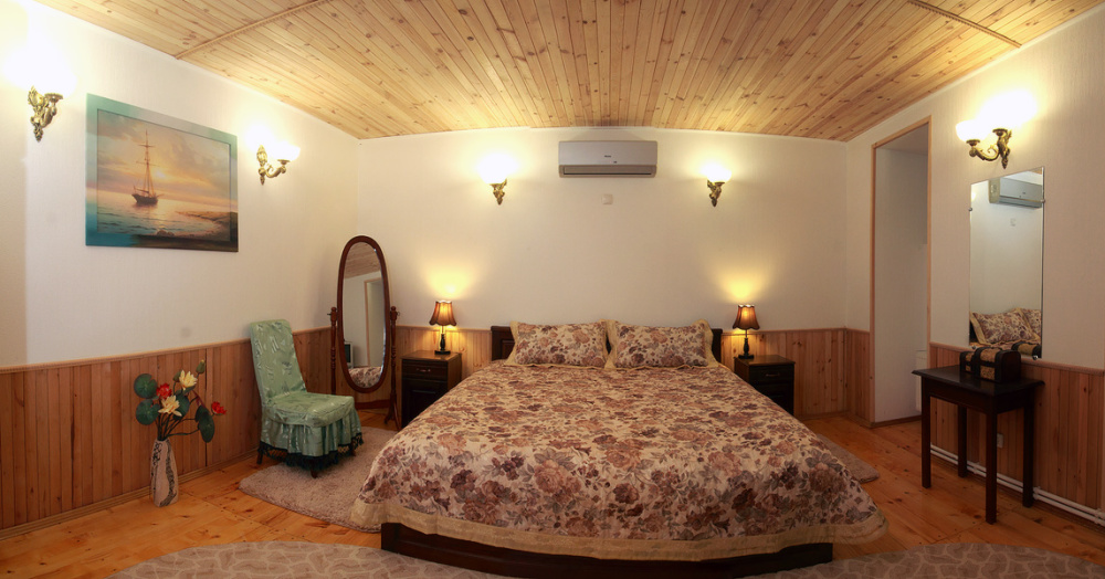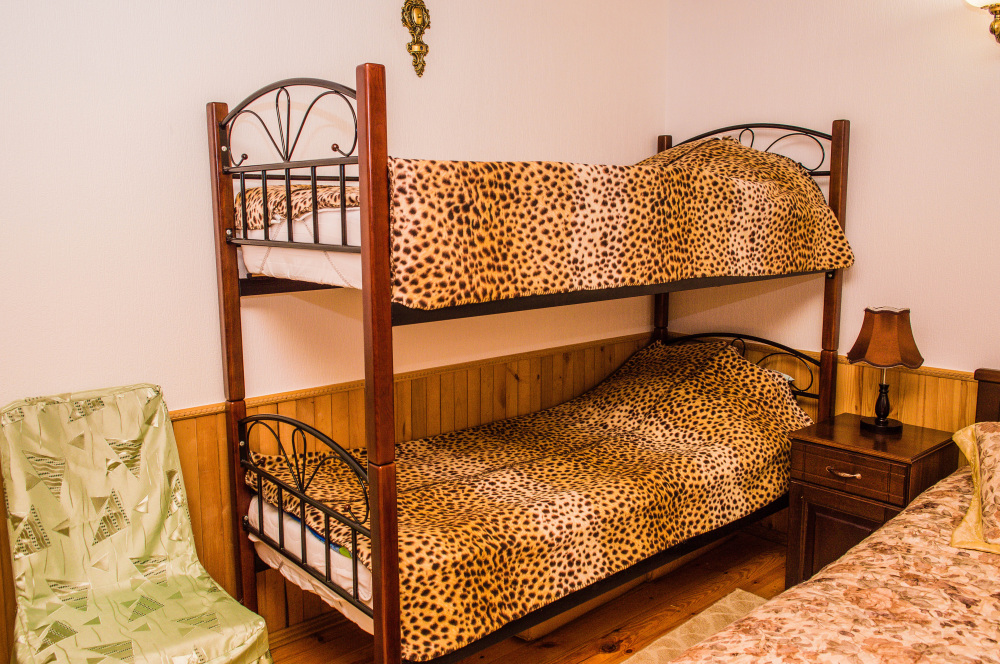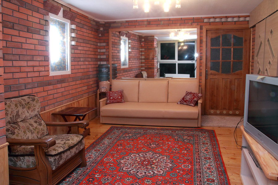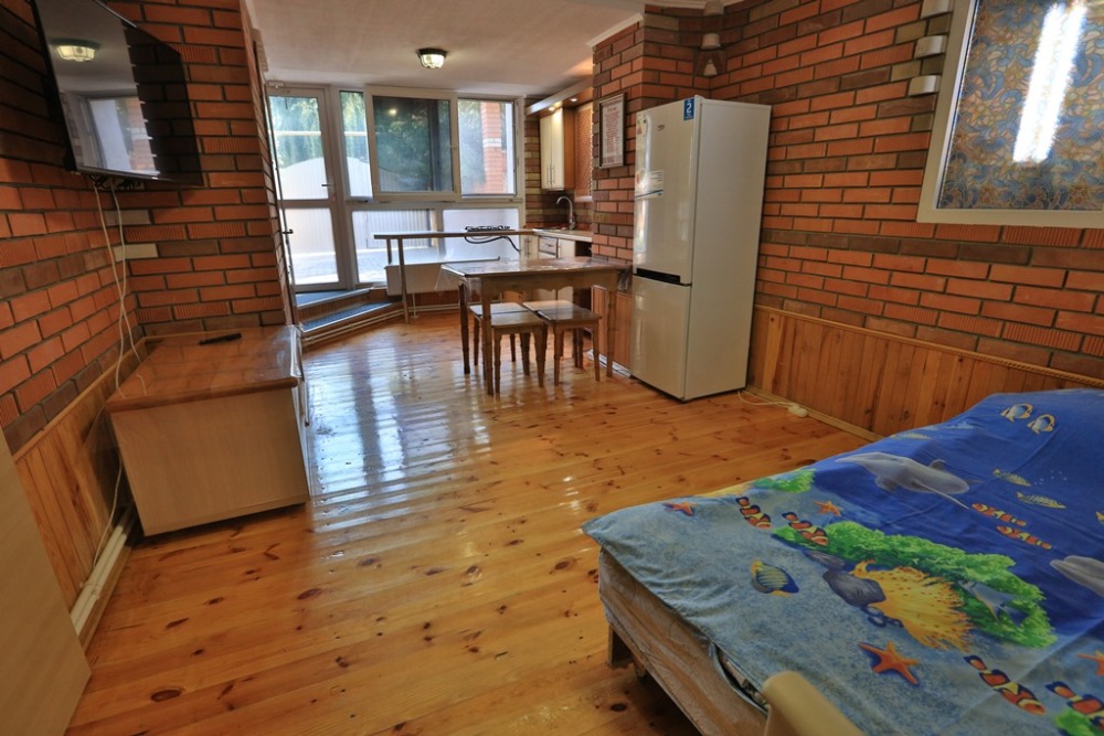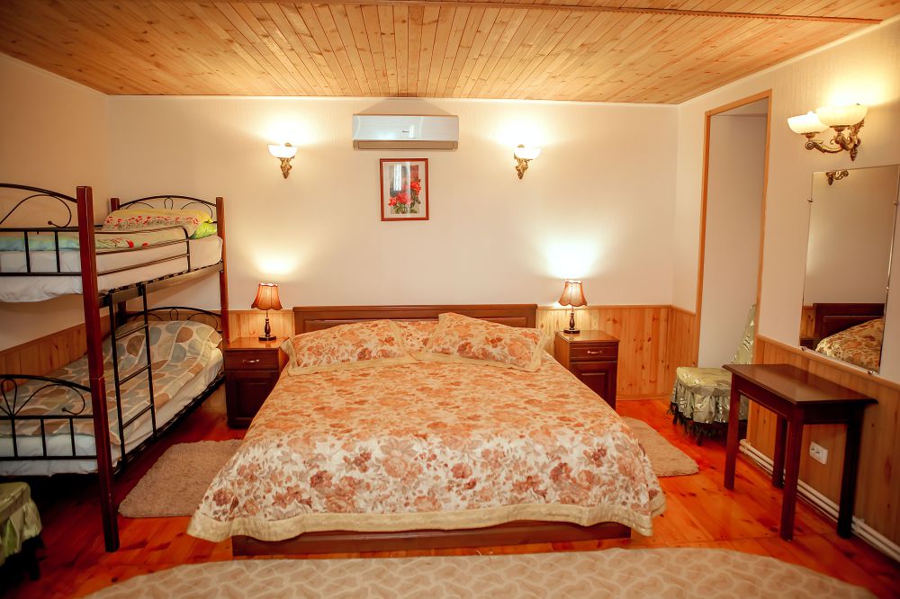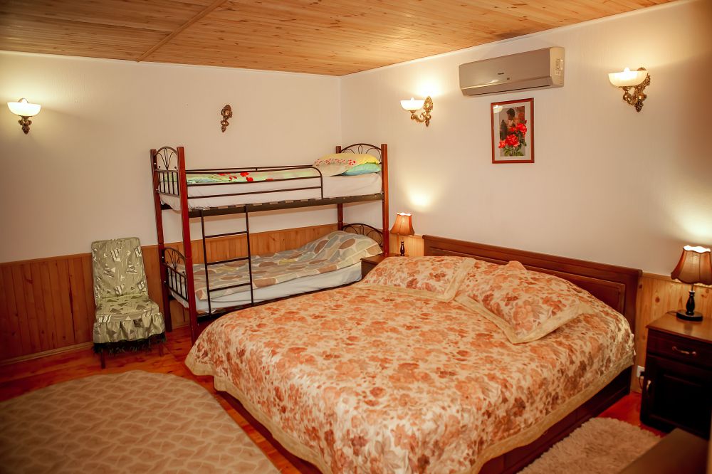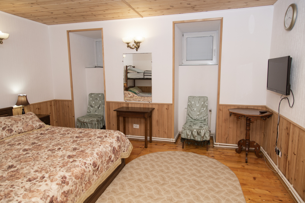 У нас на территории есть отдельный дом со своим двором и парковкой «Нижний дом»: спальня с 2х спальной кроватью и 2х ярусной детской кроватью, санузел, большая проходная комната с 2х спальным диваном и зоной кухни. Общая площадь дома 50 м2, максимальная вместимость 4 взрослых и 2 детей.