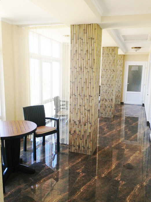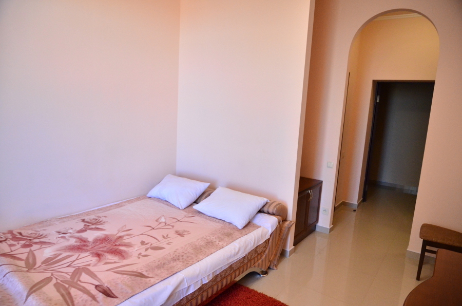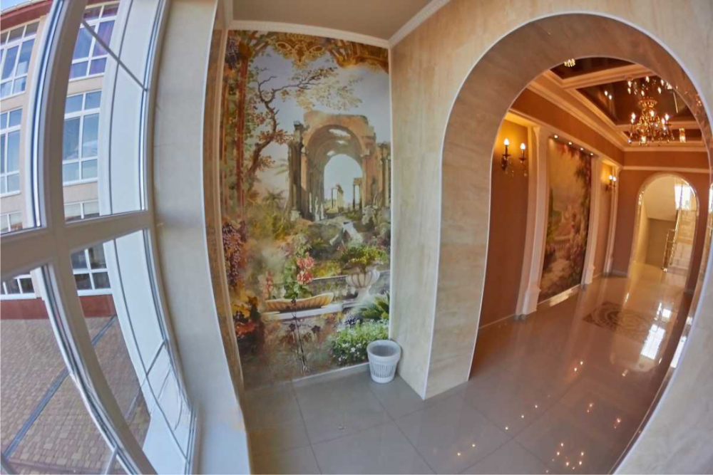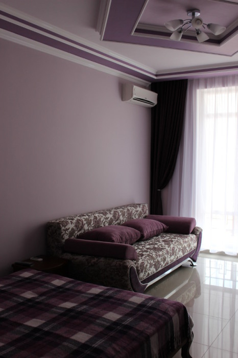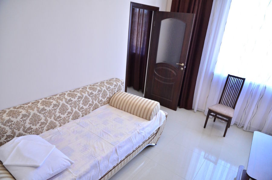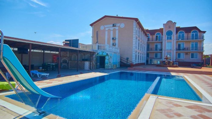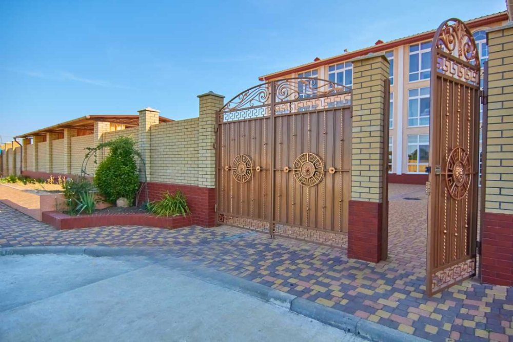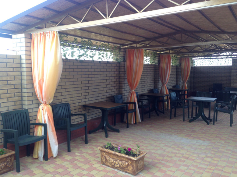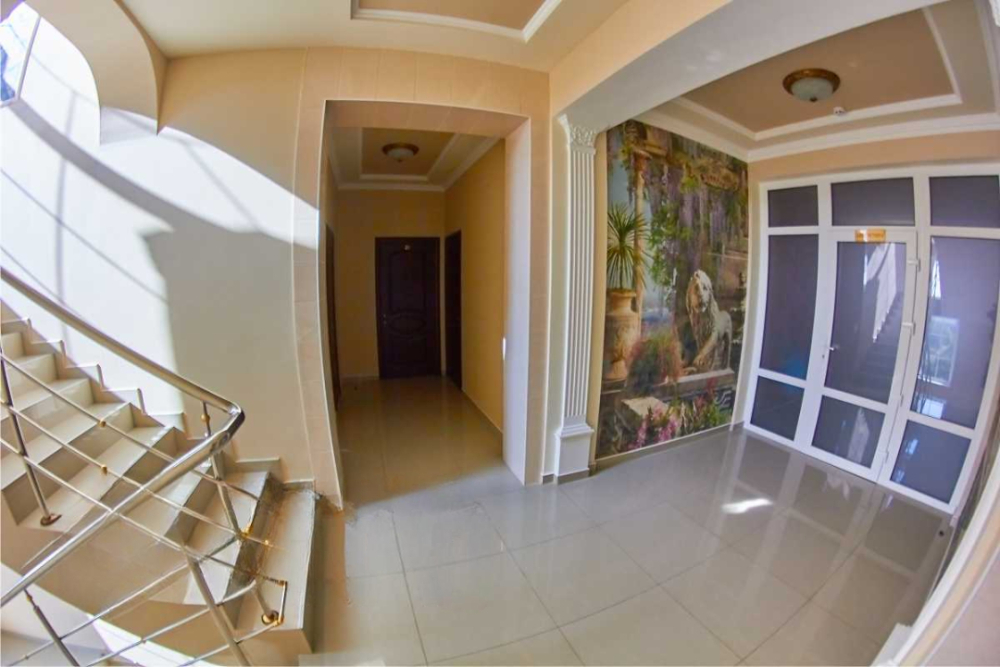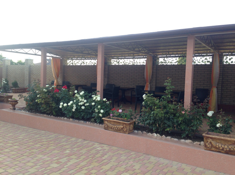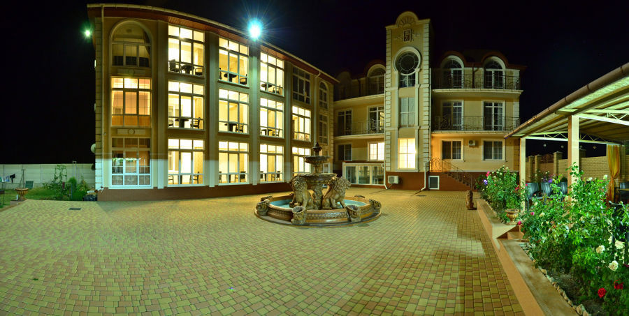На территории гостевого дома есть благоустроенный внутренний дворик с беседками, с живописным фонтаном со скульптурами львов, мангалами и детской площадкой, огромный бассейн с подогревом и детской зоной для купания. А также спортивная мульти-площадка для игры в баскетбол, мини-футбол и волейбол.