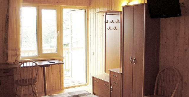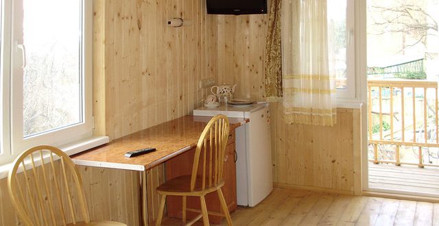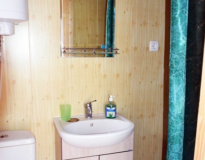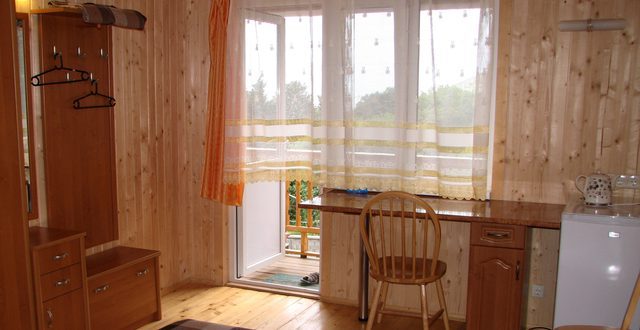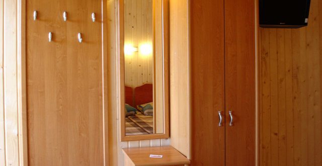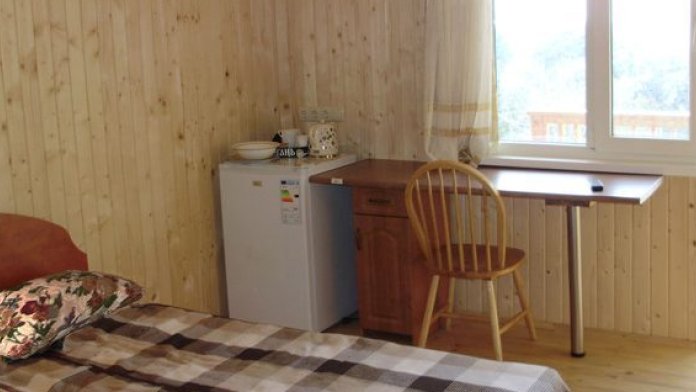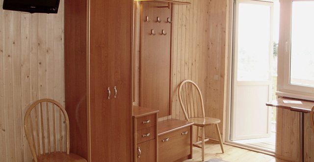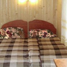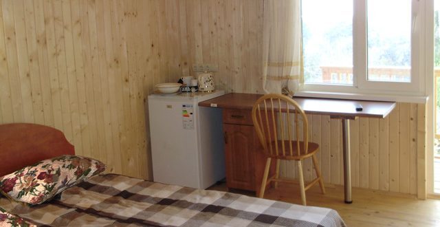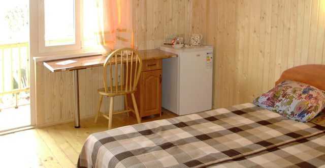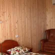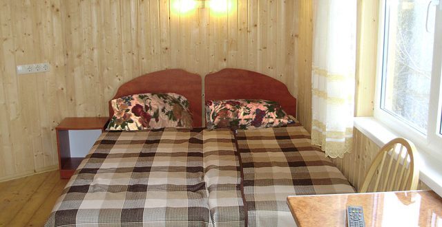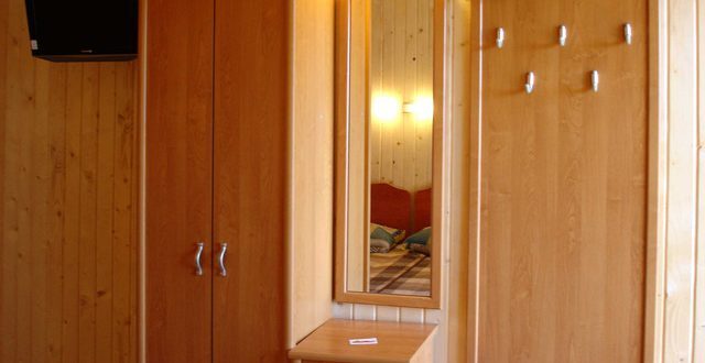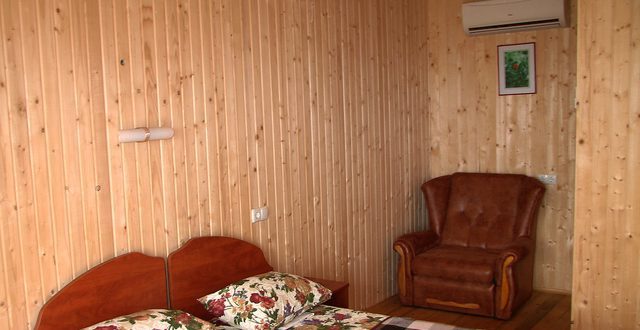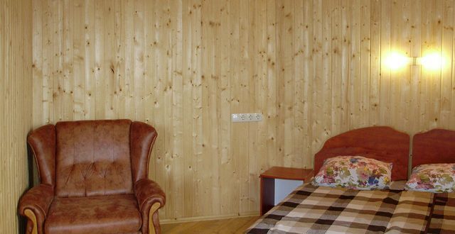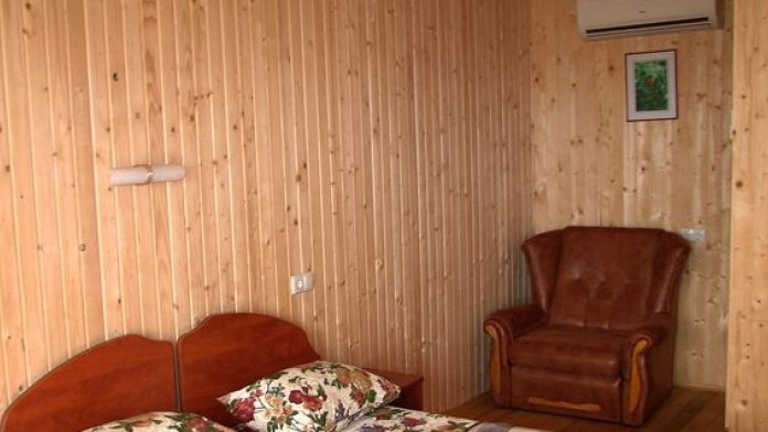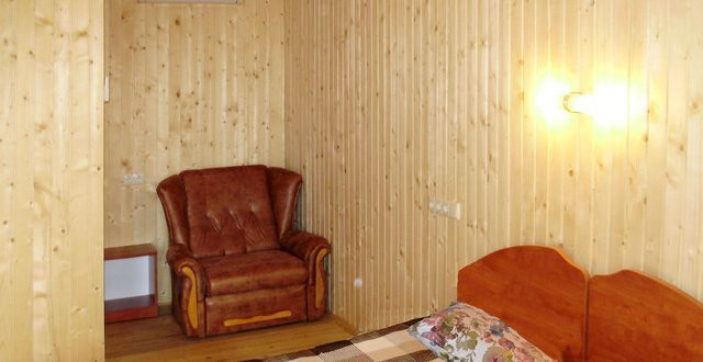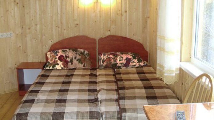 В номере 2 кровати, кресло-кровать, прикроватная тумбочка, журнальный стол, 2 стула, шкаф для одежды, вешалка, зеркало, тумба для обуви, бра, телевизор с пультом дистанционного управления (29 программ), холодильник, кондиционер. Стены деревянные, прикроватные коврики, на окнах портьеры. Санузел с принудительной вытяжной системой, душем, унитазом и умывальником, фен.