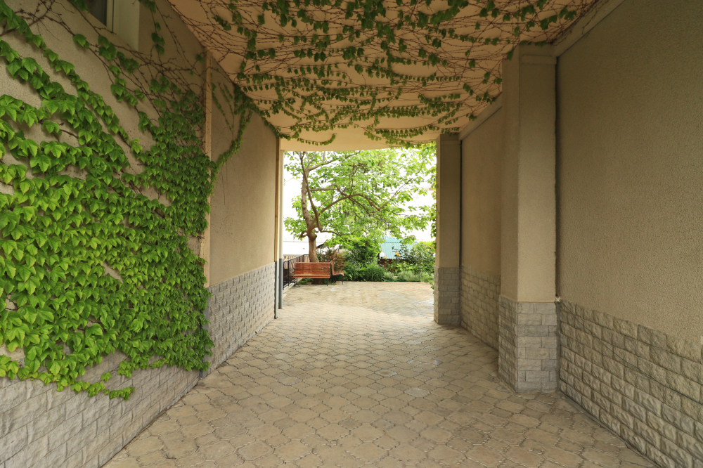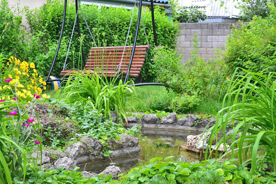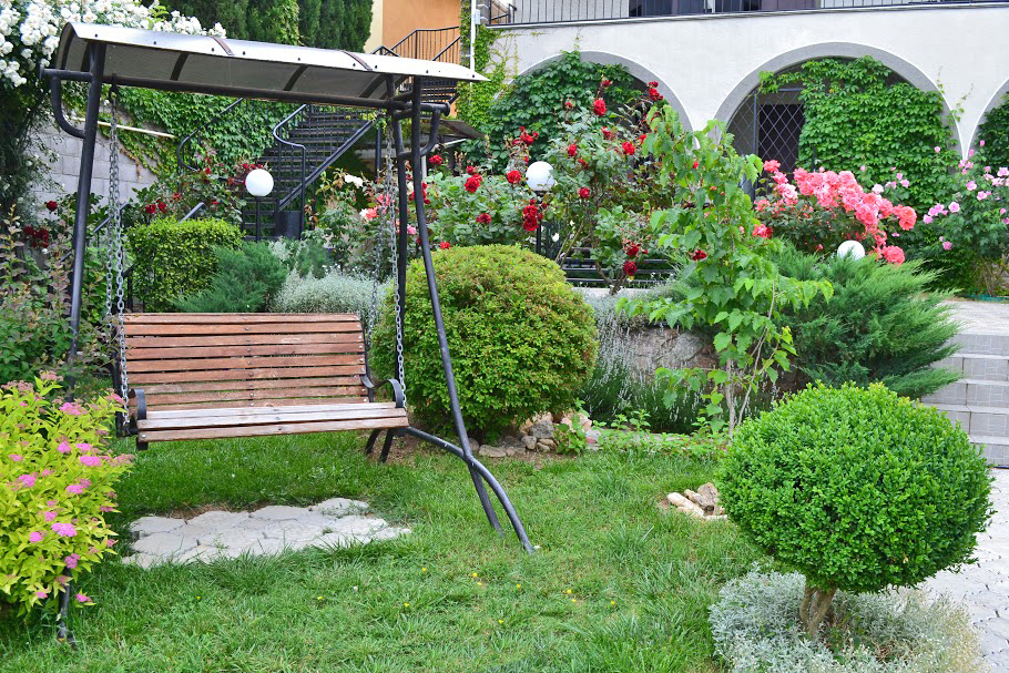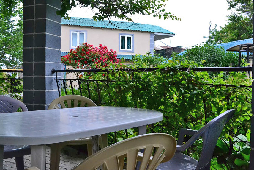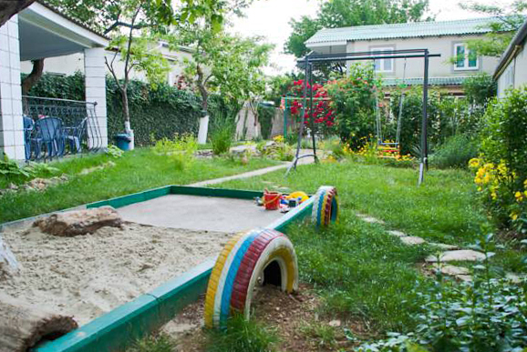 Гостевой дом располагает большой территорией с просторным, тенистым двориком, где есть разные зоны для отдыха. Там беседки для вечерних посиделок, теннисный стол, зона с мангалом, детская площадка с тихо журчащим фонтаном, розарий, качели и песочница для малышей.