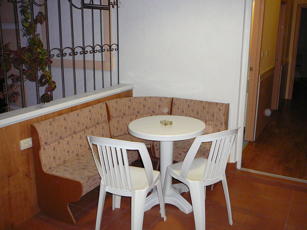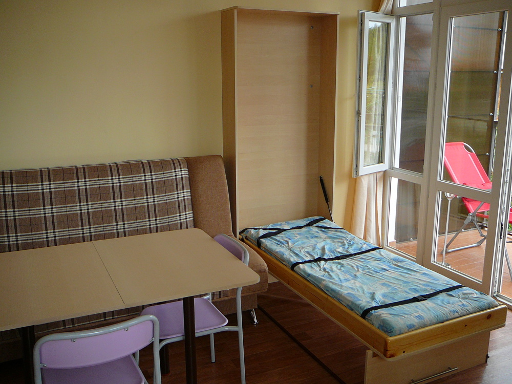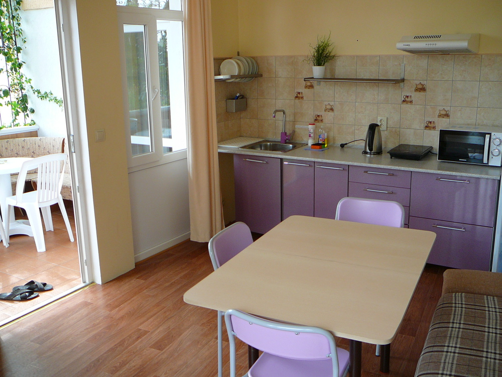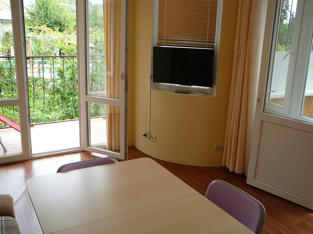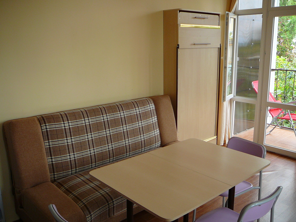 Зал-студия: стол, стулья, кухонный стол с раковиной (вода хол. и гор. ), эл.плита, вытяжка, холодильник, микроволновая печь, вся необходимая посуда и кухонные принадлежности , тумба, телевизор, кондиционер, диван и откидная кровать 80х180см. для доп.места, балкон с видом на море.