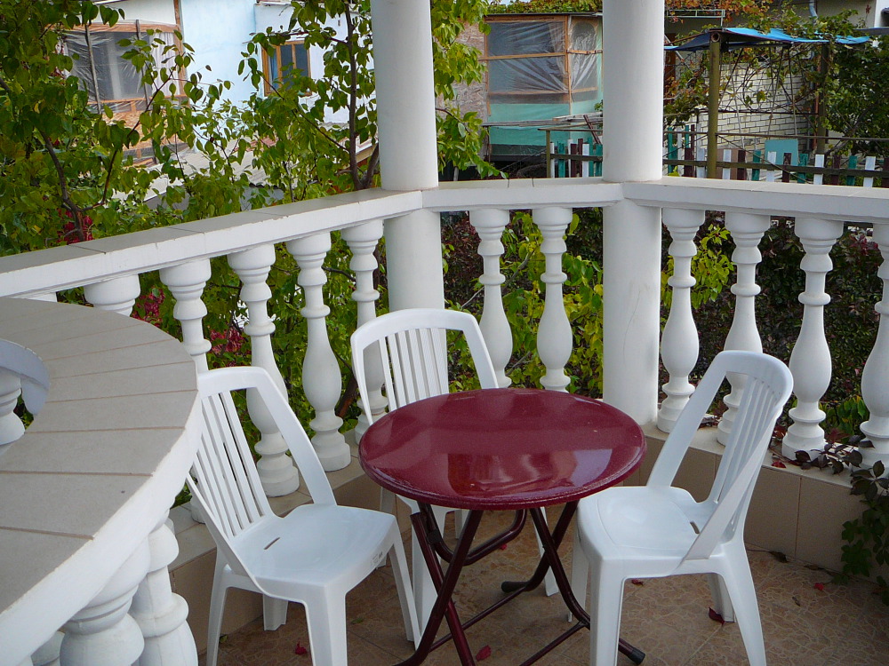 На втором этаже две спальни и зал-студия (с кухней), веранда с видом на море, санузел. В каждой комнате телевизор, кондиционер (сплит-система). Есть WiFi. Подъем на второй этаж по винтовой лестнице.