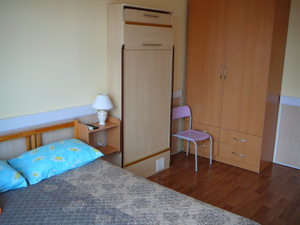 Спальня №1: двуспальная кровать 140х200см с ортопедическим матрацем, прикроватные тумбочки, откидная кровать 200х80 см. (доп. место), шкаф для вещей и одежды, зеркало, сейф для документов и ценностей, кондиционер, телевизор, все необходимые постельные принадлежности, полотенца, “французское” окно-балкон с видом на море.