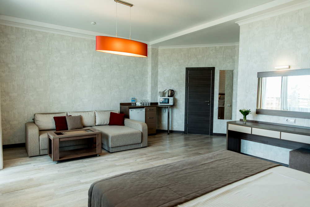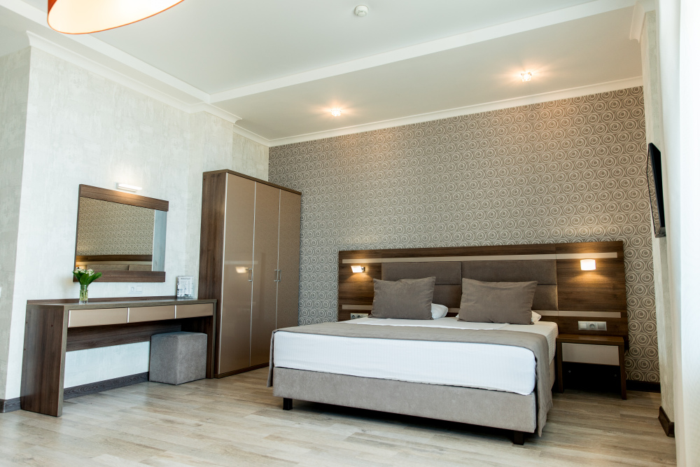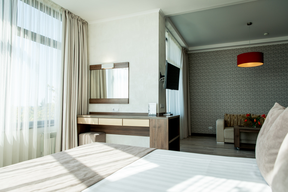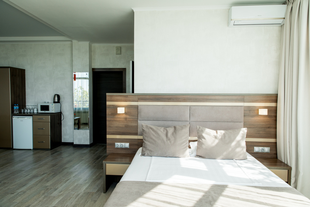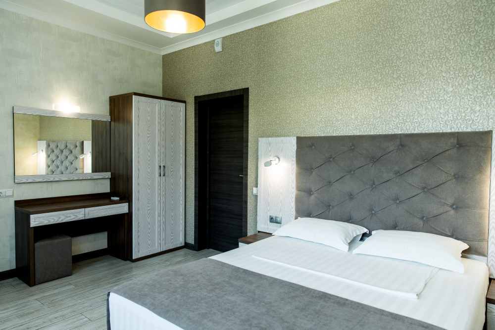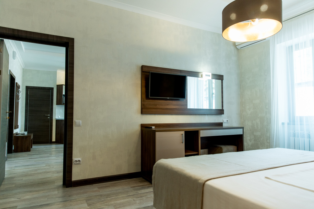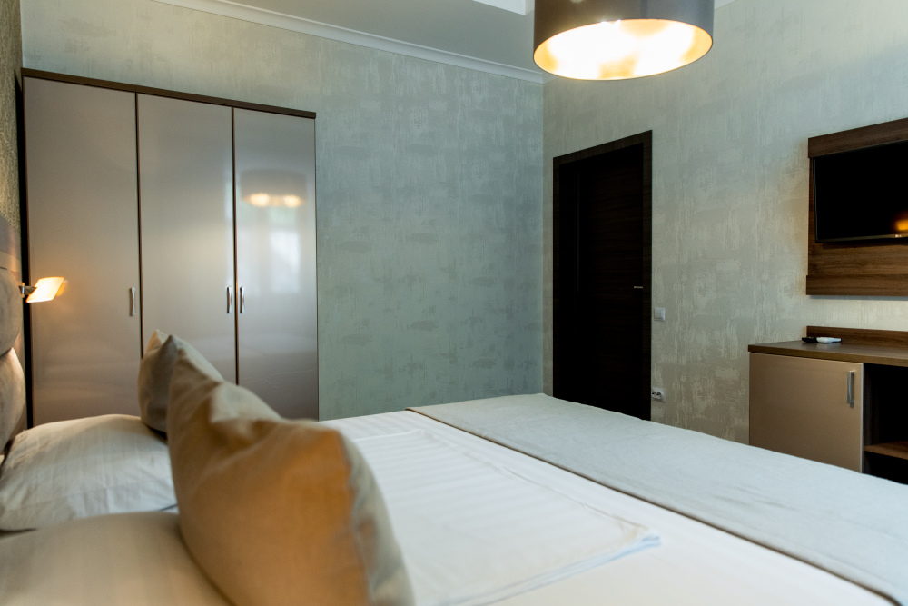 В номере большая двуспальная кровать с ортопедическим матрацем, высотой 25 см, диван-кровать, кондиционер, телевизор. Ванная комната. Фен, сушка для белья, гладильная доска, утюг в номере. Сейф с цифровым замком.