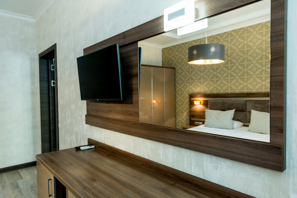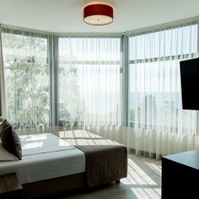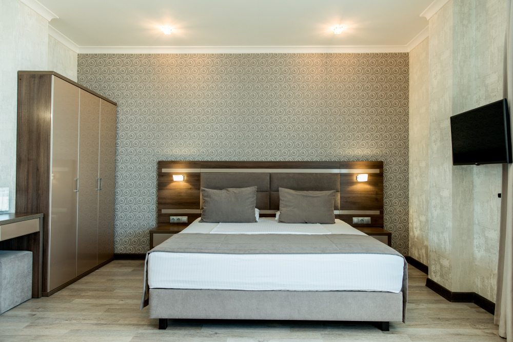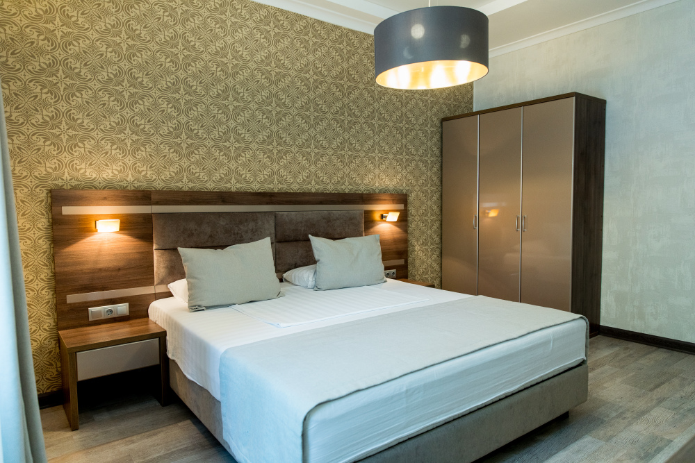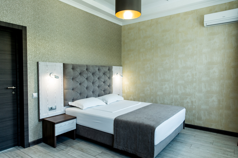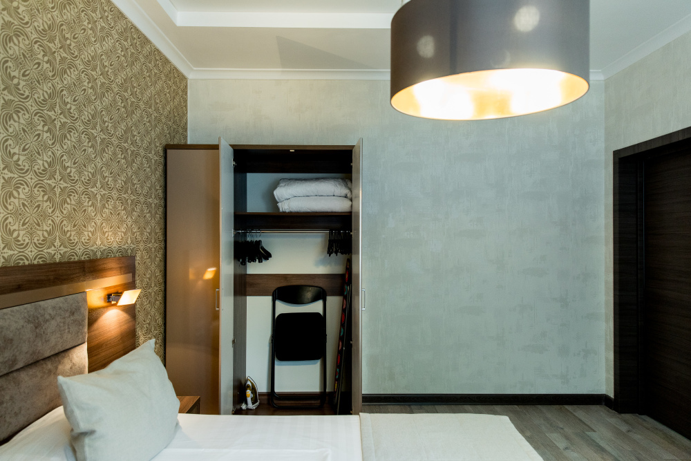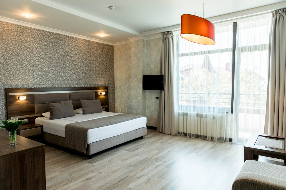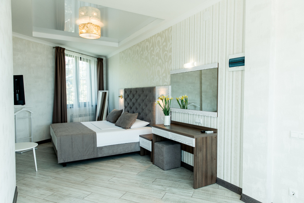 В номере большая двуспальная кровать с ортопедическим матрацем, высотой 25 см, диван-кровать, кондиционер, телевизор. Ванная комната. Фен, сушка для белья, гладильная доска, утюг в номере. Сейф с цифровым замком.