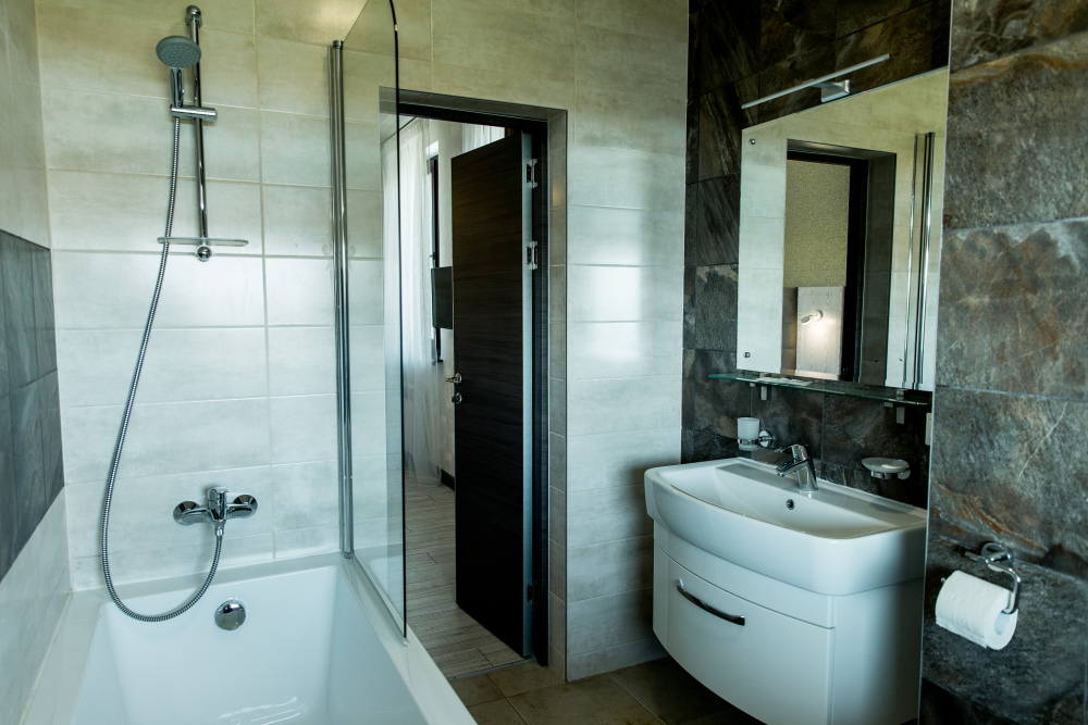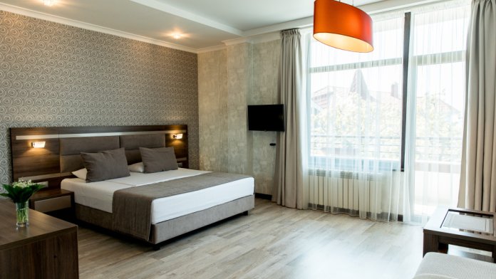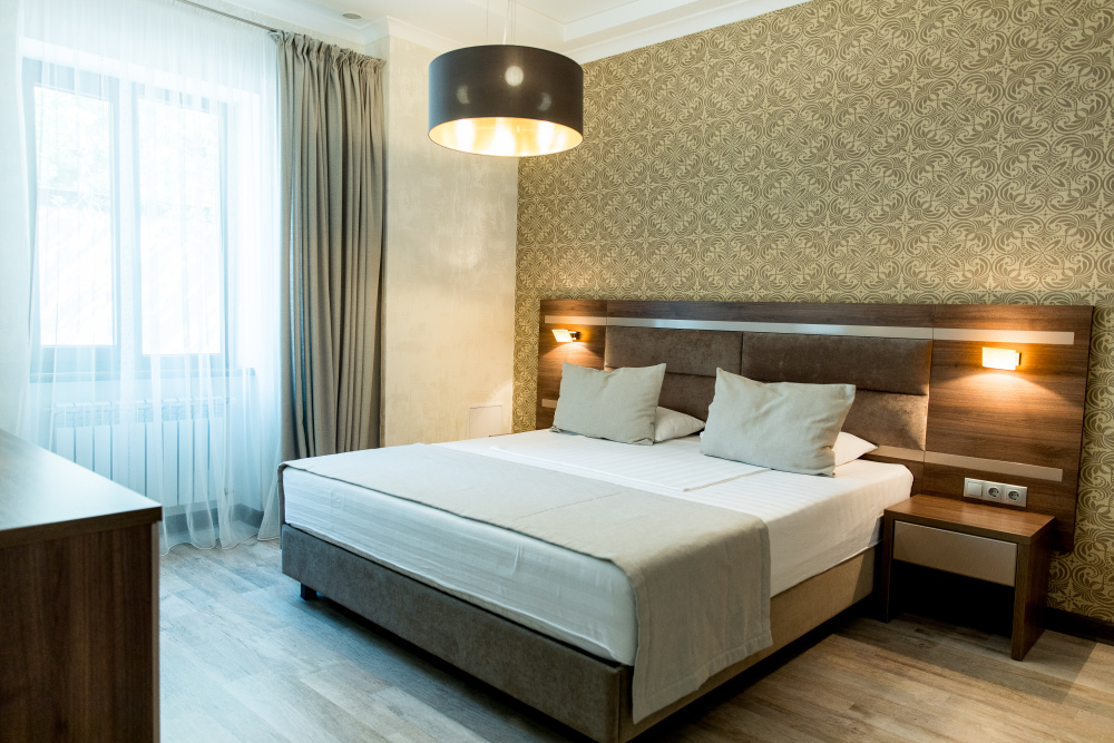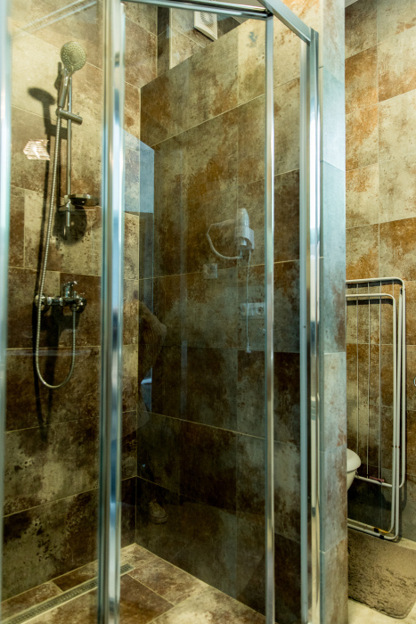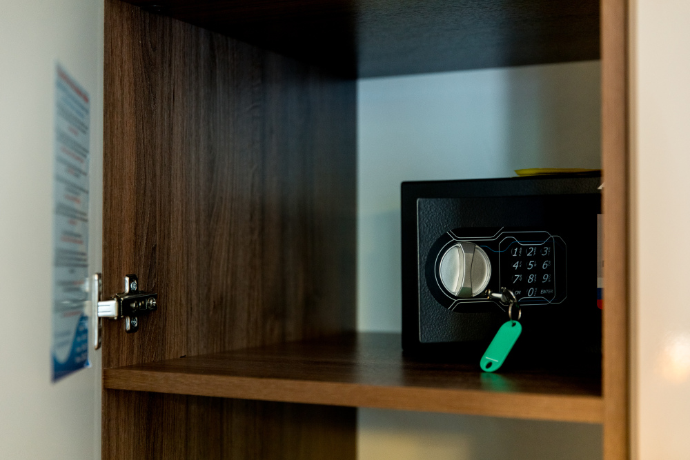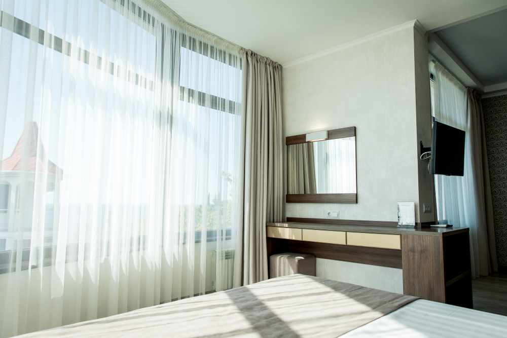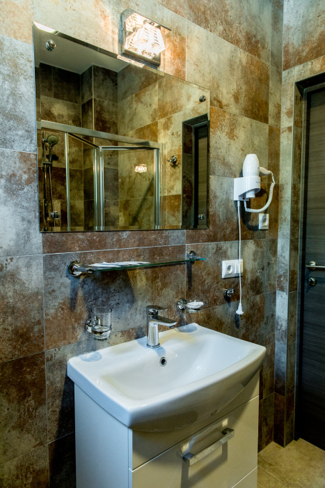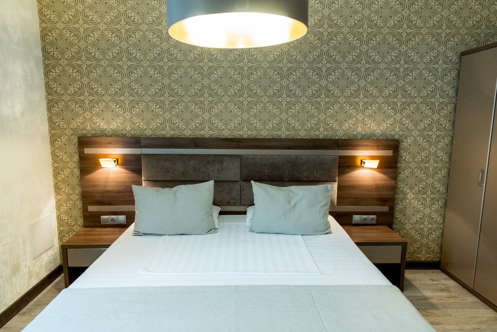 В номере большая двуспальная кровать с ортопедическим матрацем, высотой 25 см, диван-кровать, кондиционер, телевизор. Ванная комната. Фен, сушка для белья, гладильная доска, утюг в номере. Сейф с цифровым замком.