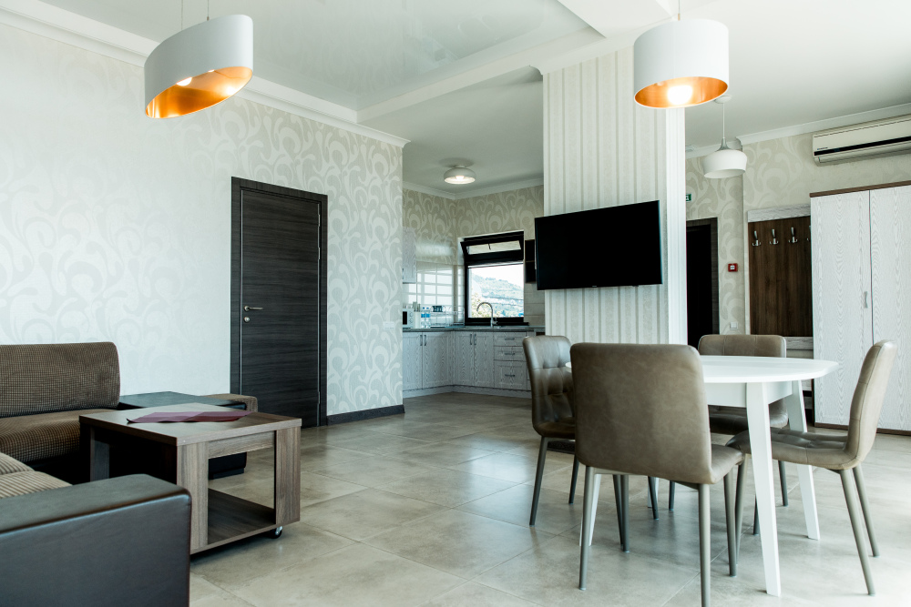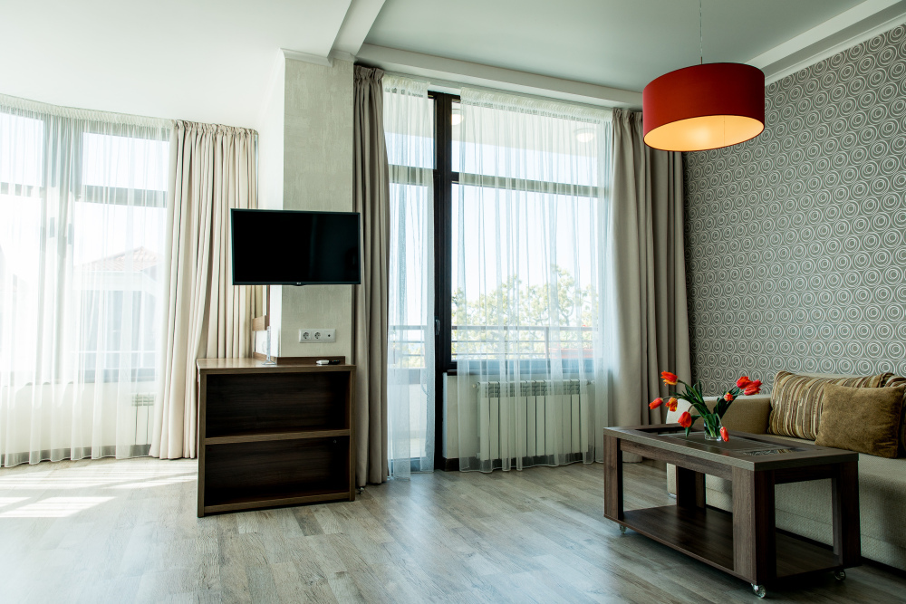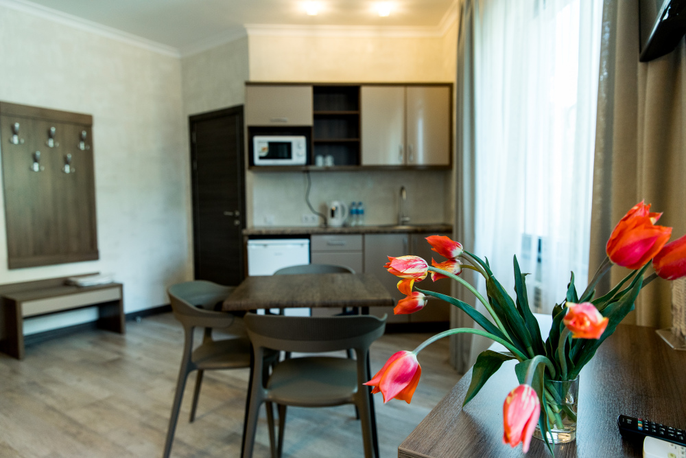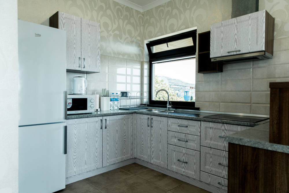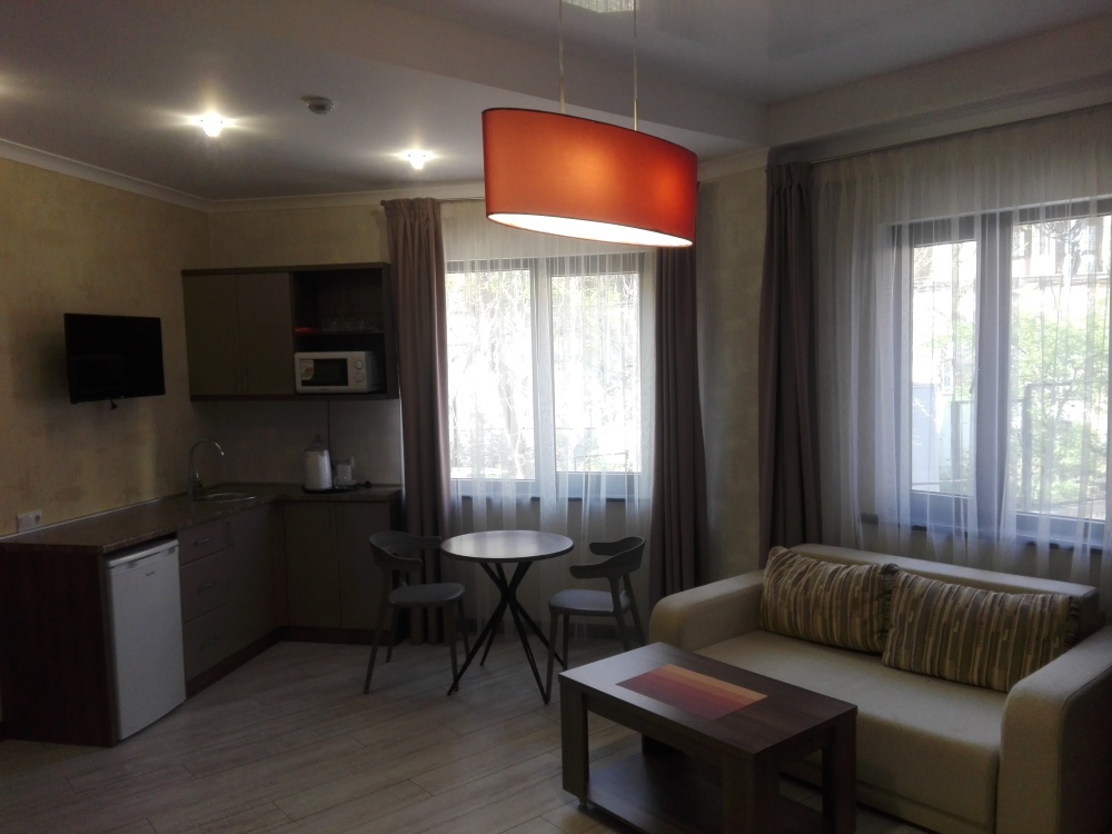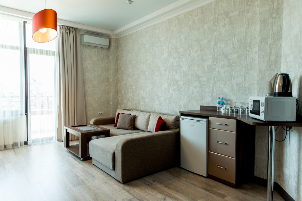 Номер имеет две изолированные комнаты. В каждой кондиционер, телевизор. Красивый дизайнерский ремонт. В номере кухонный уголок, с раковиной для мытья посуды, микроволновкой, холодильником и электрочайником. Минимальный набор посуды, и стол для завтраков на 4 персоны. Фен, гладильная доска, утюг в номере. Сейф с цифровым замком. Из окон открывается вид на гору Ай-Петри.