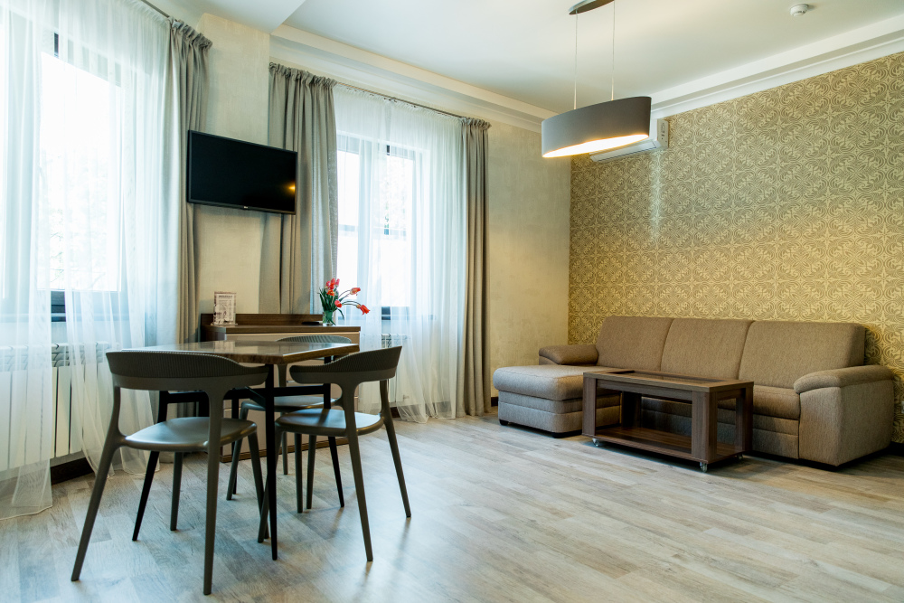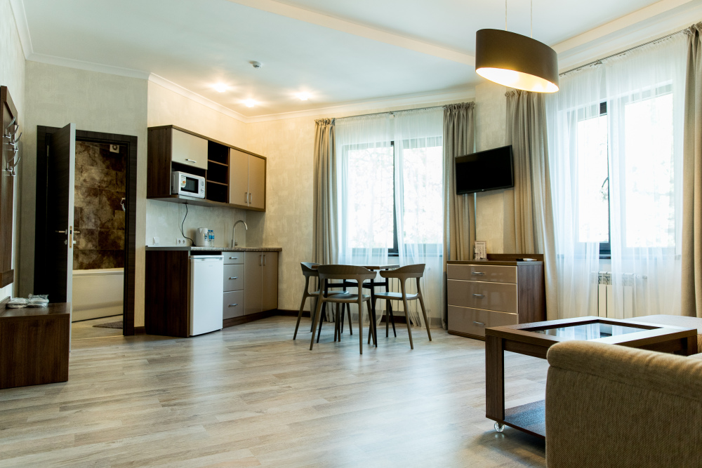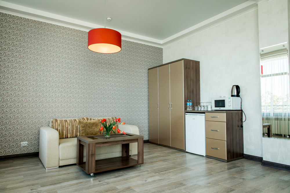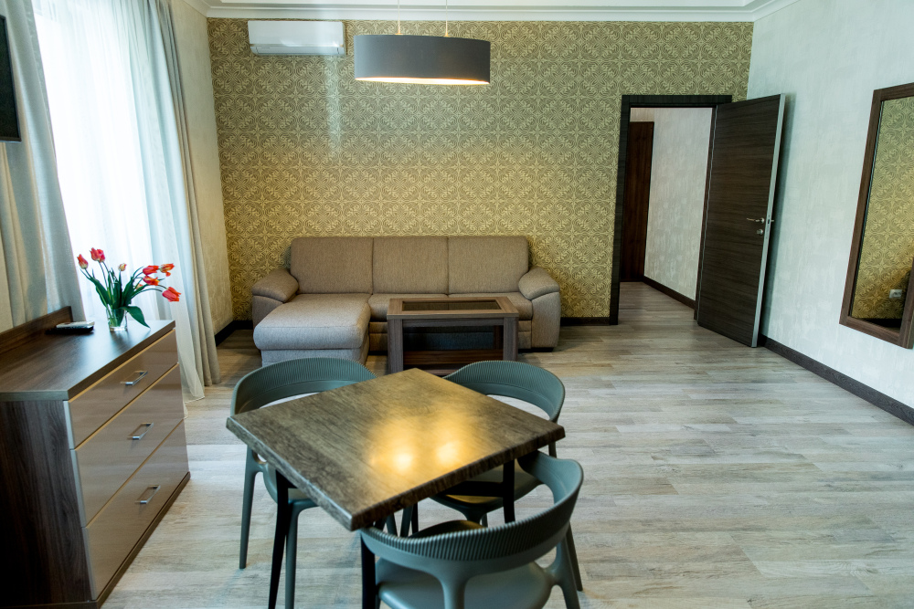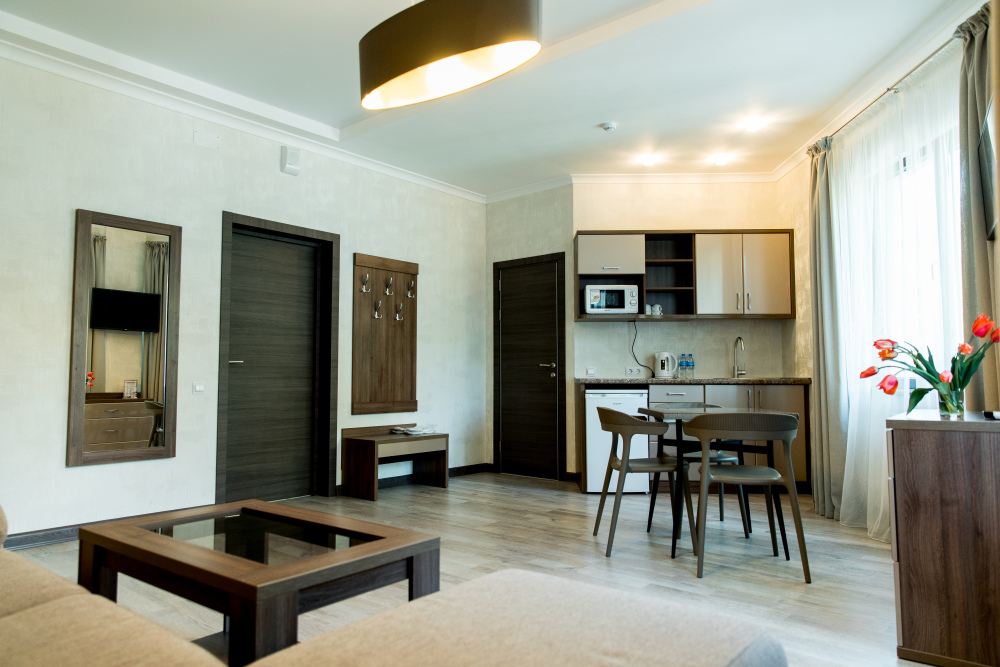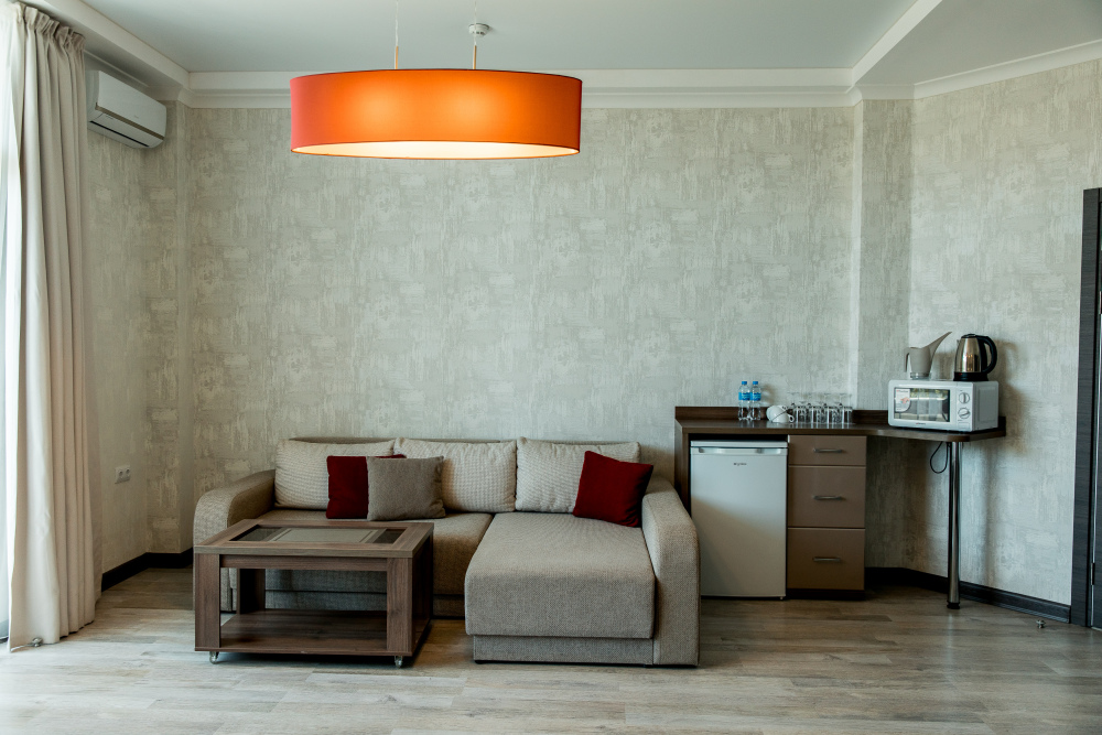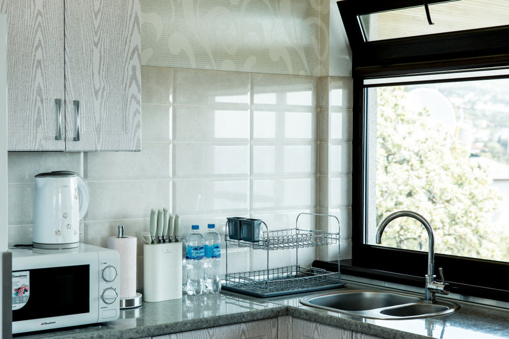 Номер имеет две изолированные комнаты. В каждой кондиционер, телевизор. Красивый дизайнерский ремонт. В номере кухонный уголок, с раковиной для мытья посуды, микроволновкой, холодильником и электрочайником. Минимальный набор посуды, и стол для завтраков на 4 персоны. Фен, гладильная доска, утюг в номере. Сейф с цифровым замком. Из окон открывается вид на гору Ай-Петри.