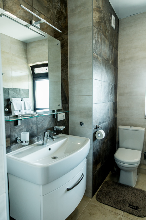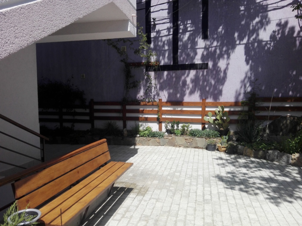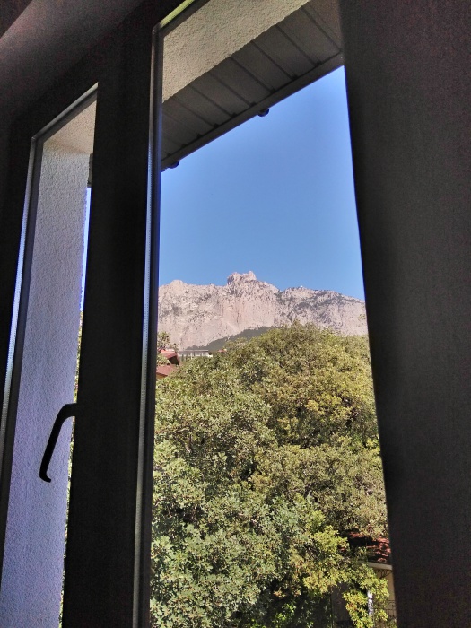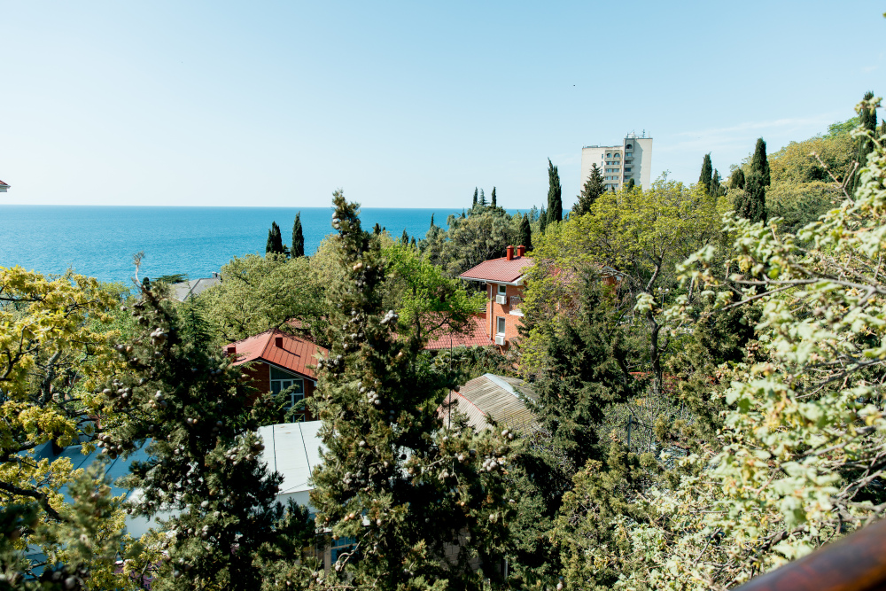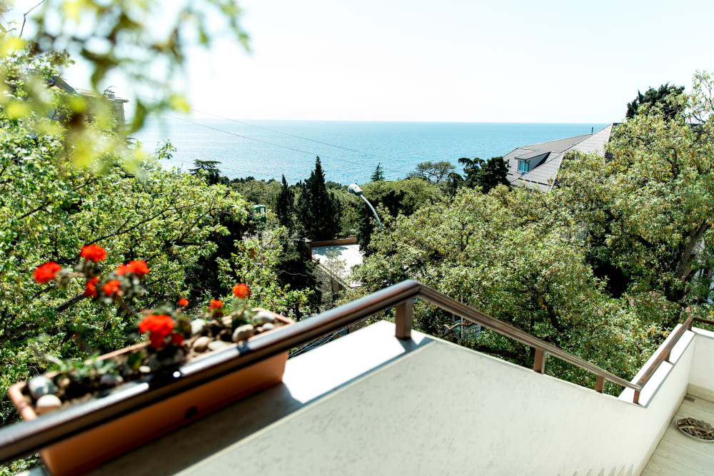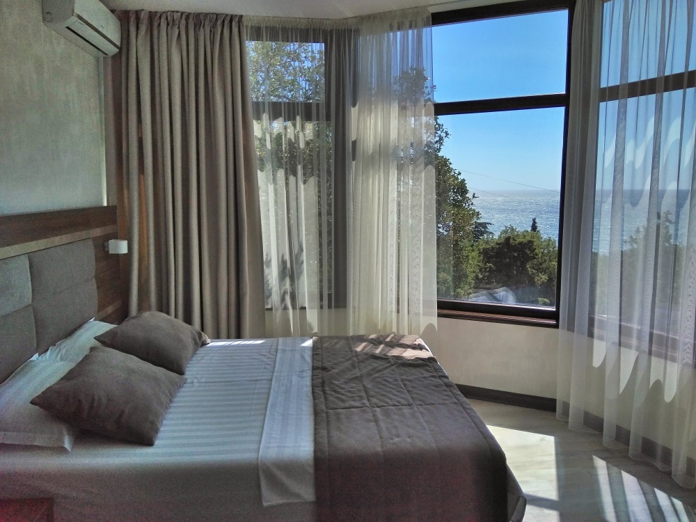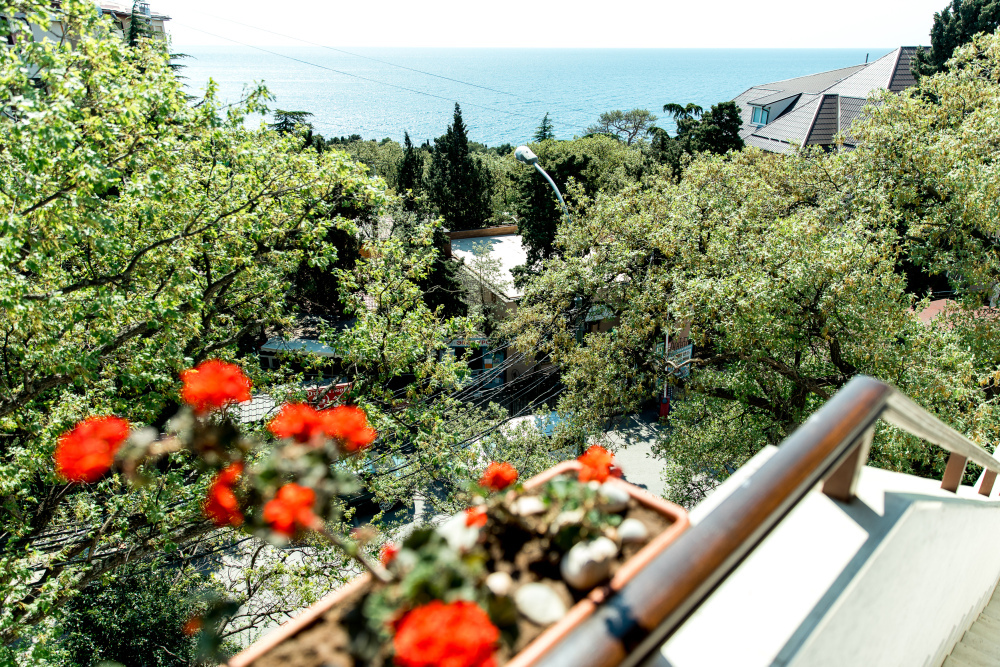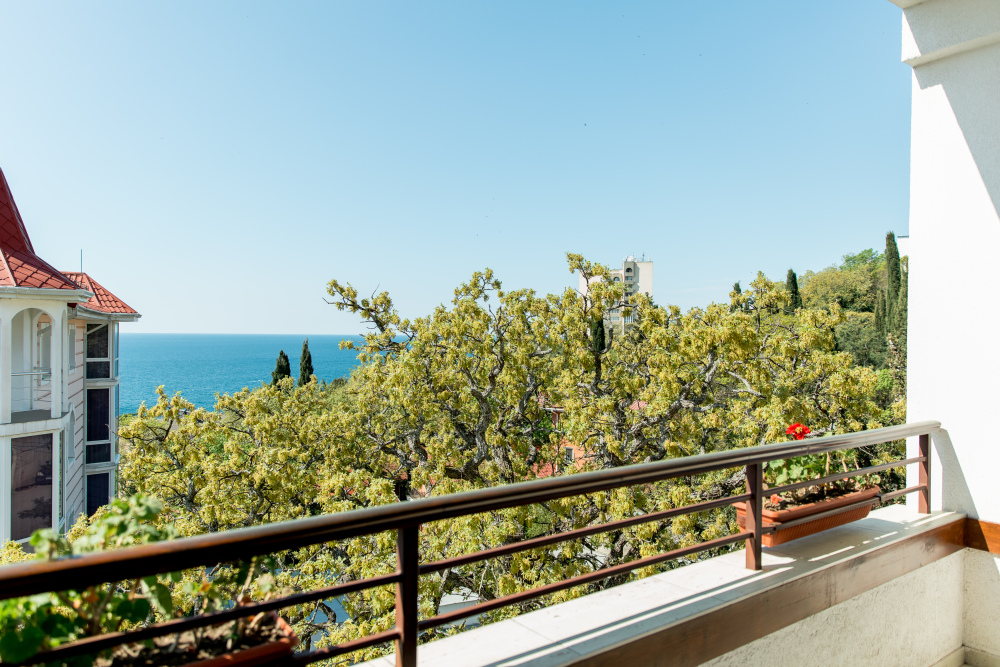 Апартаменты имеют две изолированные спальни, холл, две ванные комнаты. Стиральная машина, гладильная доска, утюг в номере. В каждой комнате кондиционер, телевизор, очень большая двуспальная кровать с ортопедическим матрацем, высотой 25 см. В холле большой двуспальный диван, полноценная кухня с плитой, микроволновкой и раковиной для мытья посуды. Сейф. Терраса с лежаками для комфортного отдыха. Над окнами спален этого номера нависает гора» Ай-Петри», а с огромной террасы открывается шикарный вид на морскую гладь Черного моря.