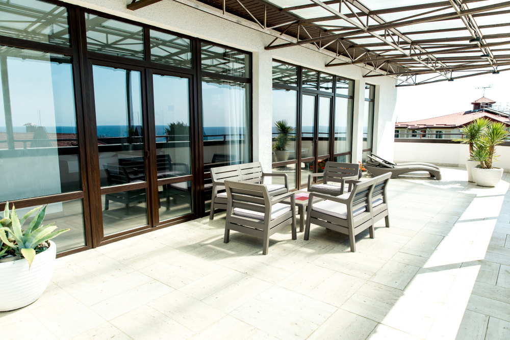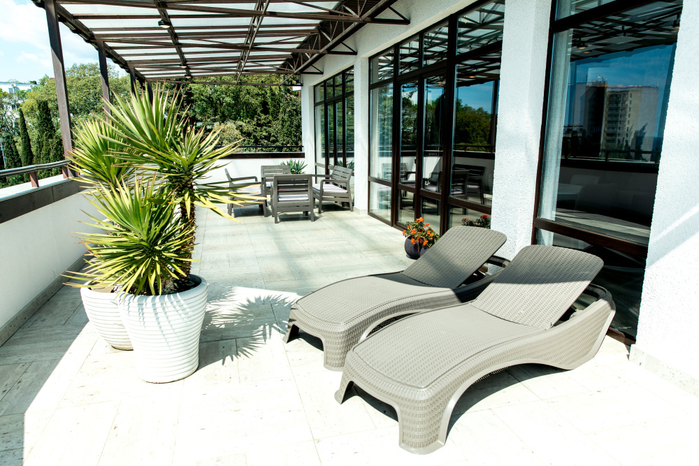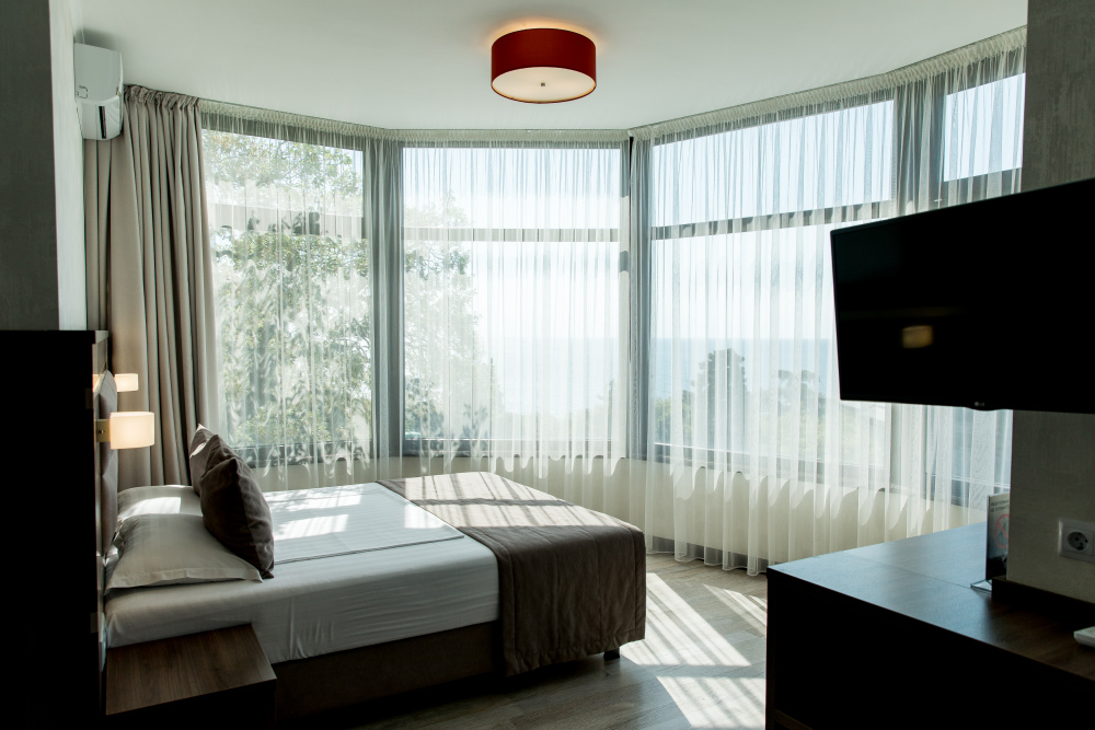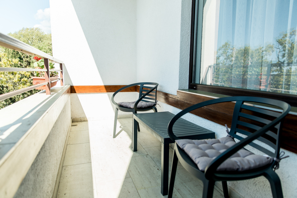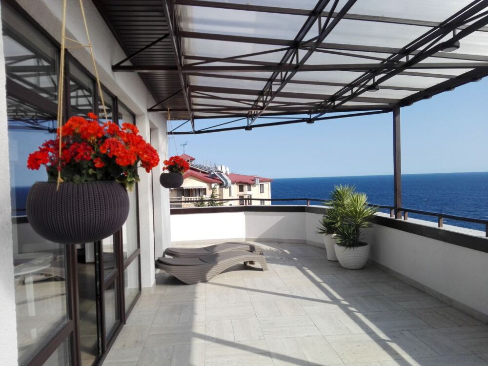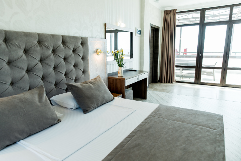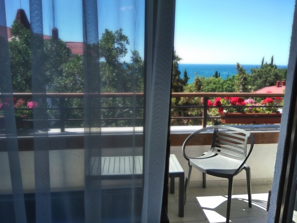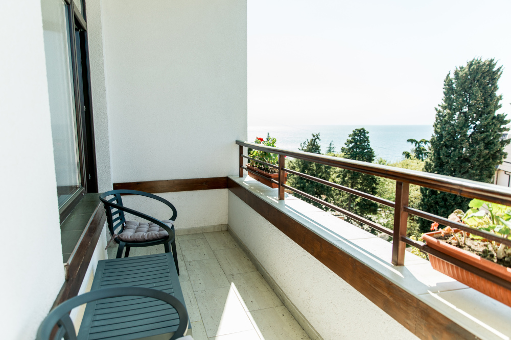 Просторный номер, дизайнерский ремонт, уютный балкон с уличной мебелью и видом на море.