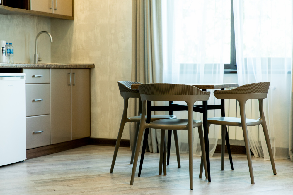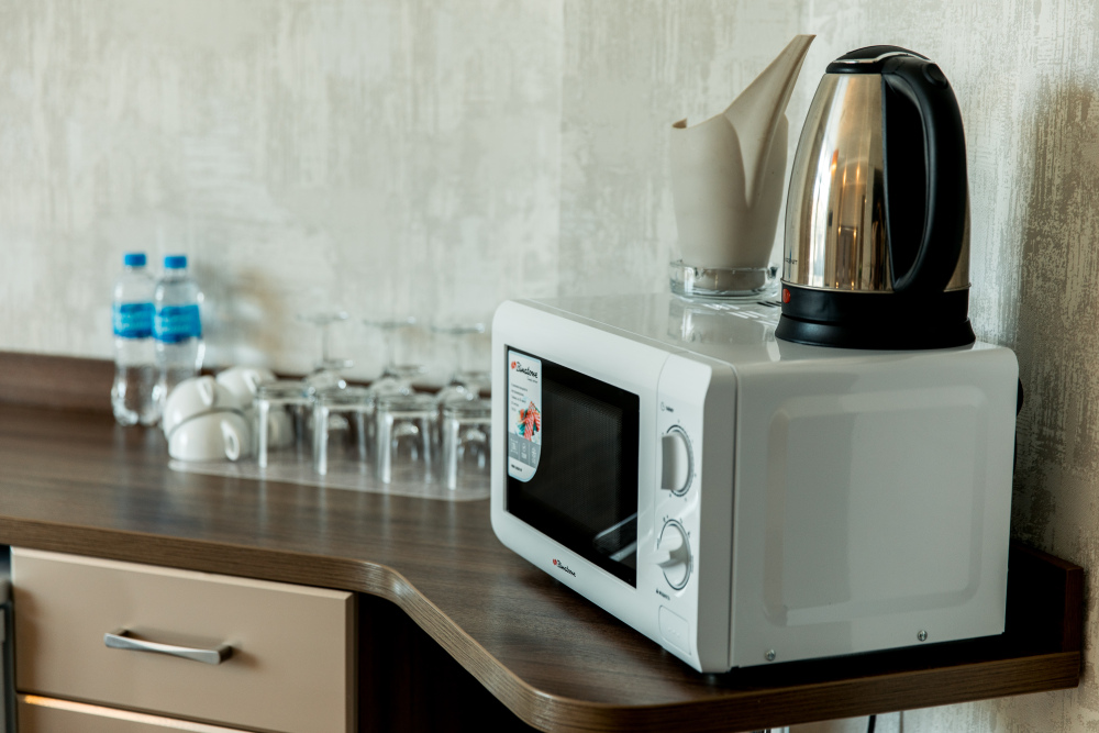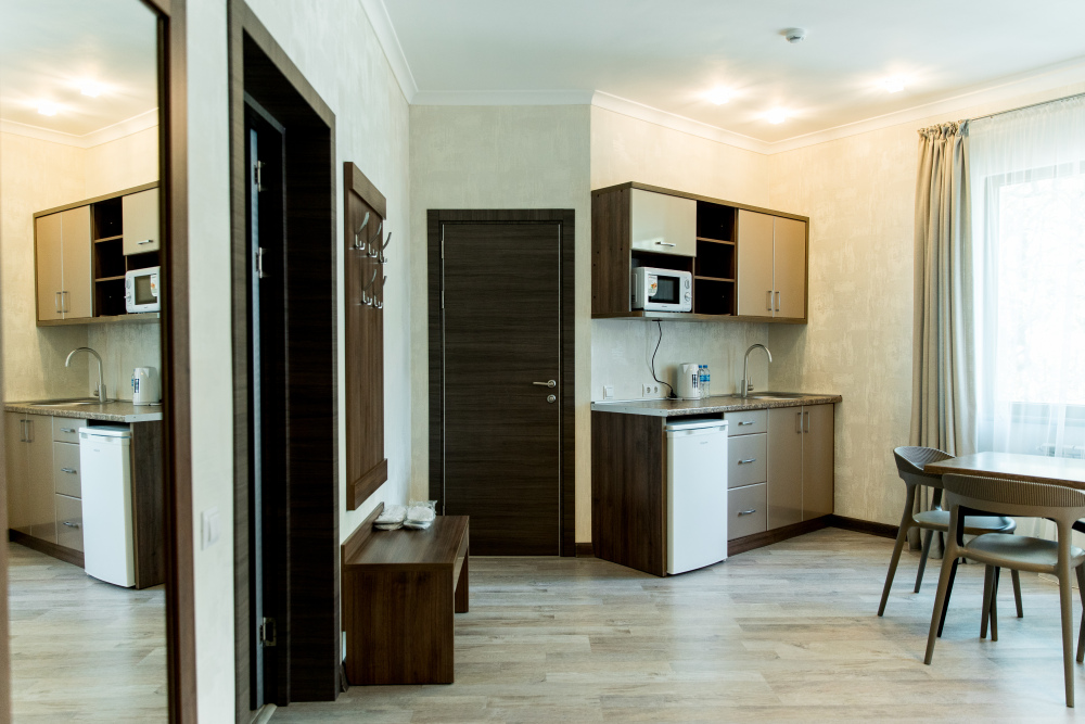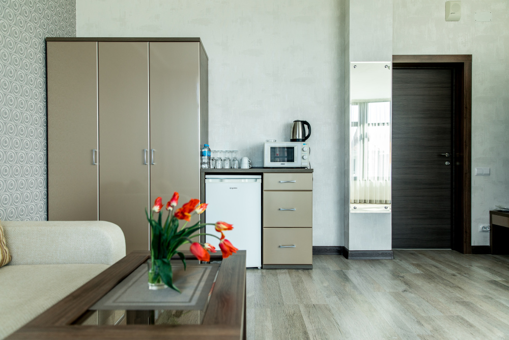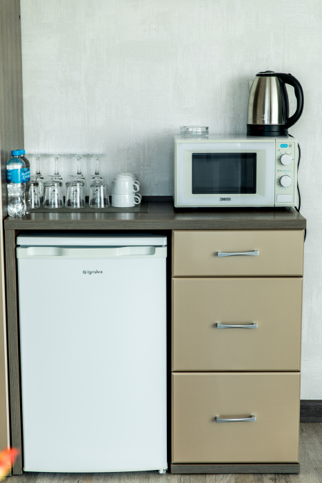 Очень тихий, уютный номер, с кухонным уголком (раковина для мытья посуды, микроволновая печь, холодильник, минимальный набор посуды).