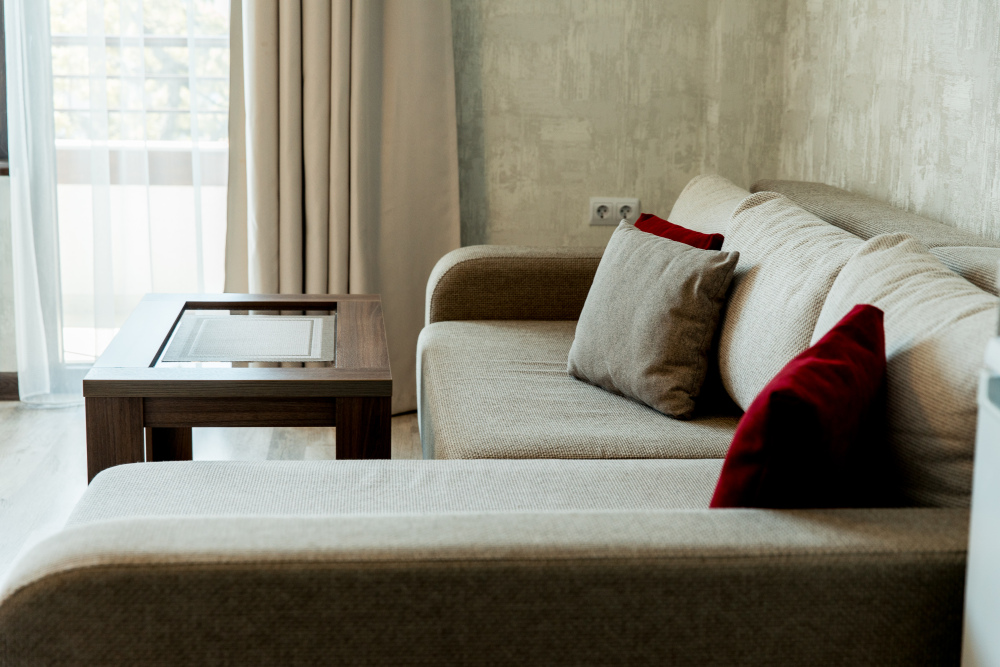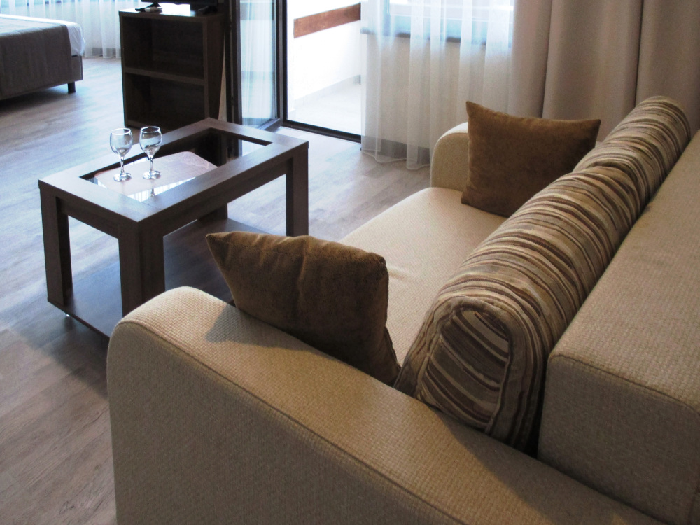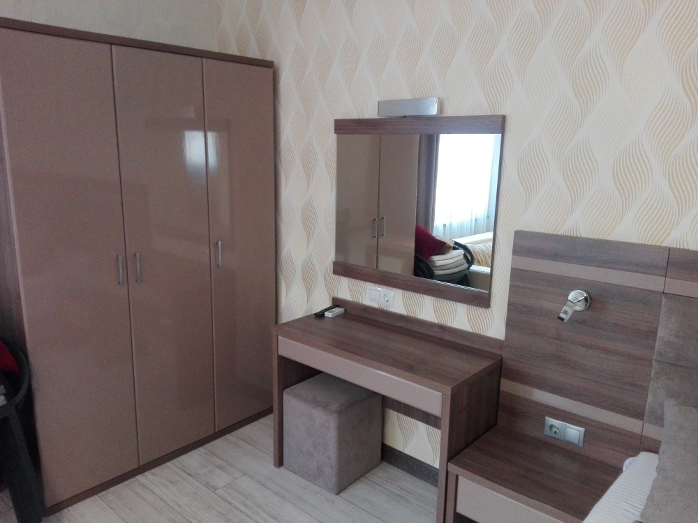 Очень большая двуспальная кровать, с ортопедическим матрацем, высотой 25 см. Большой двуспальный диван. Кухонный уголок (холодильник, чайник, микроволновка, минимальный набор посуды). Кондиционер, телевизор. Фен, сушка для полотенец, гладильная доска, утюг в номере. Сейф с цифровым замком.