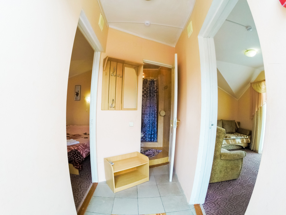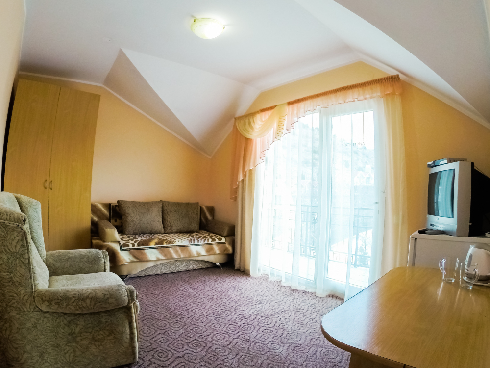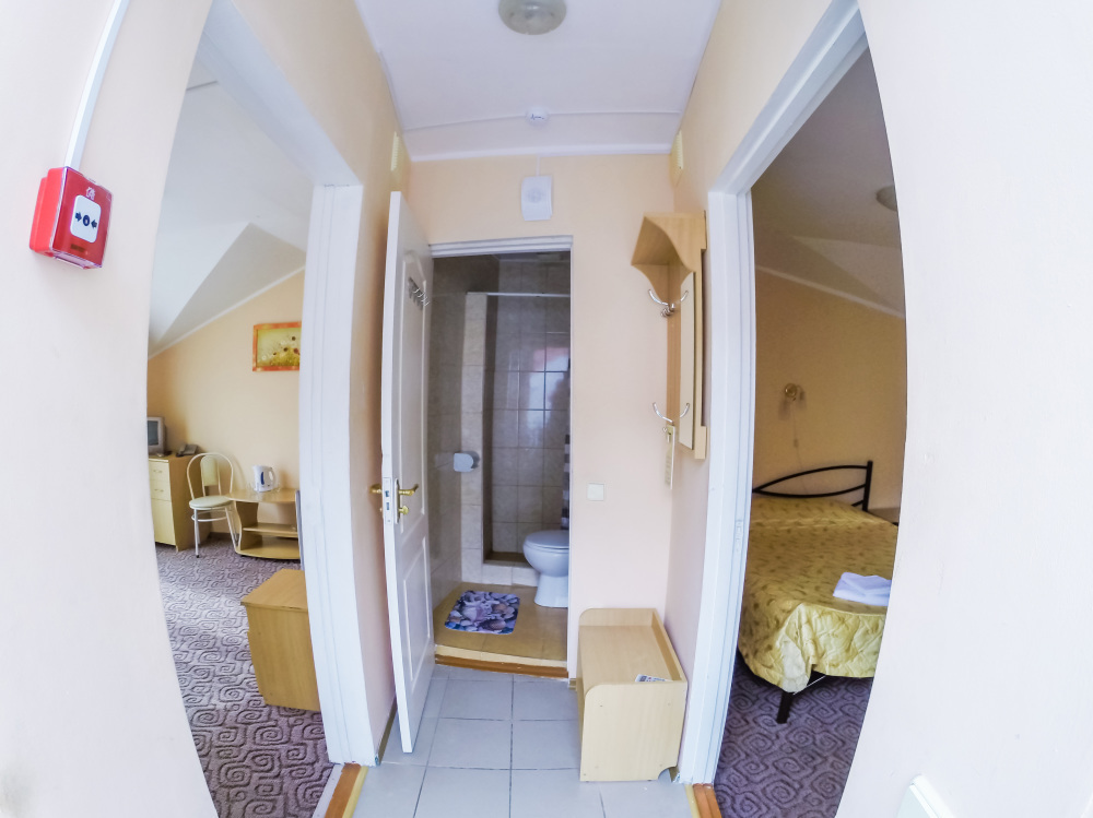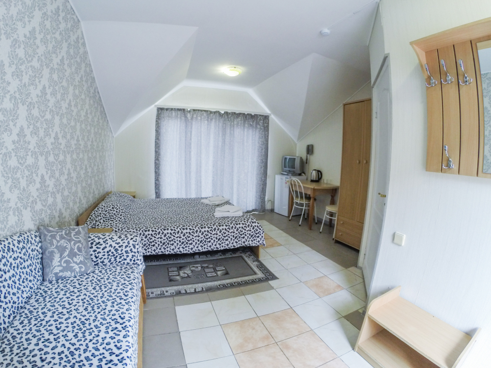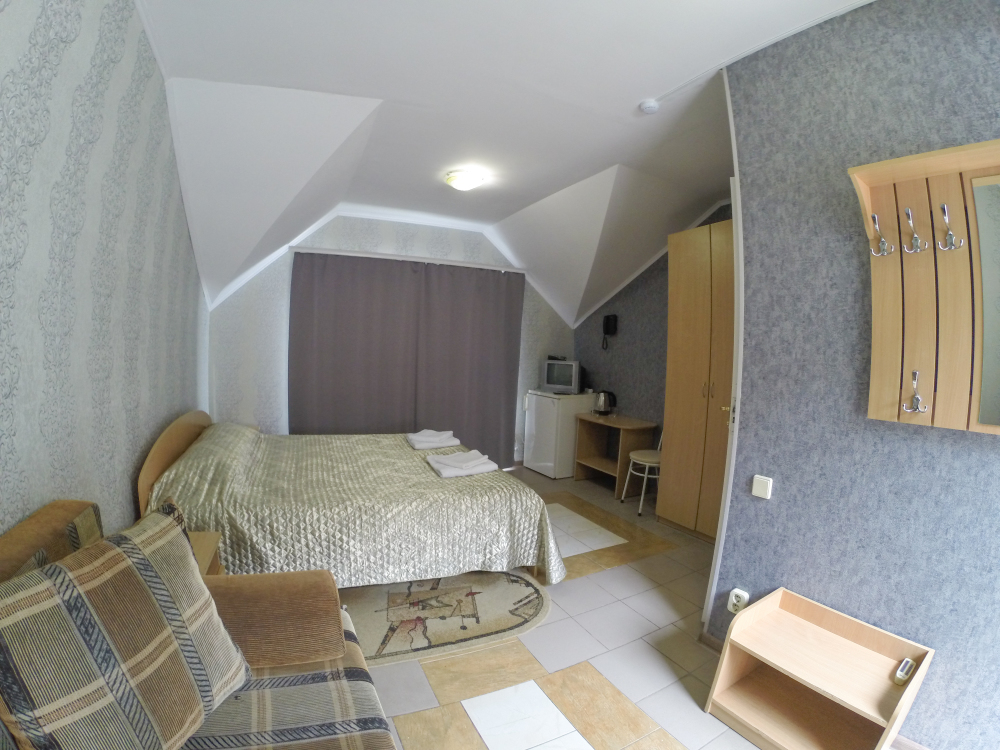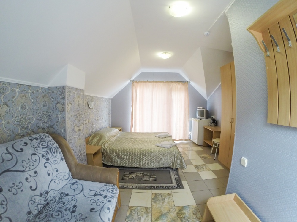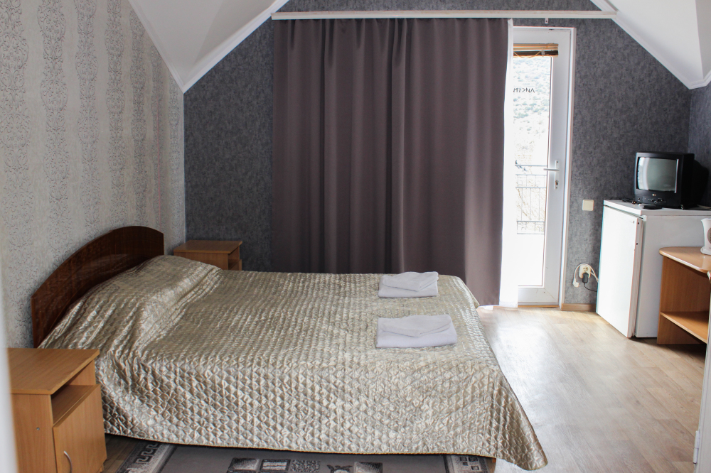 Отдельные однокомнатные домики площадью 18-20 кв.м. на 2-3 человека со всеми удобствами (душ, туалет, телевизор, холодильник, кондиционер, чайник). Перед каждым домиком своя огороженная терраса площадью от 16 до 18 кв.м. с видом на Балаклавскую бухту. Спальные места: две односпальные кровати и раскладной диван. В некоторых номерах два раскладных двухместных дивана. Горячая и холодная вода круглосуточно.