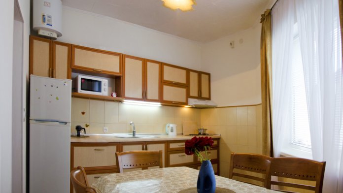 Горячая вода постоянно. На кухне имеются холодильник, микроволновая печь, электрочайник, электроплитка.