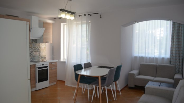 Квартира с двумя спальнями и большой кухней-гостинной, раздельным санузлом (создает дополнительные удобства проживания). Находится в первом от моря в поселке многоэтажном доме. Возле подъезда место для 16 машин, но своего ни у кого нет(все стопоры срезали в 2014 году). Из окон вид на горы и частный сектор поселка. Квартира светлая, так как все дома вокруг ниже(2-4 этажа). Возле дома продовольственные лавочки и кафе. Сразу перед домом начинается непроезжая часть поселка, исторический центр, и пешеходная зона до набережной.