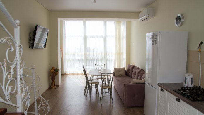 На выбор гостей представлены номера различной вместимости с прекрасным видом на море, в которых есть все для комфортного отдыха: необходимая мебель, техника (LCD TV, электрочайник) , Wi-Fi, и отдельная кухня для самостоятельного приготовления еды. Так же в 5 минутах находится кафе с колоритной крымской кухней и доступными ценами. Апартаменты находятся недалеко от пляжа, прогулка к которому, занимает не более 7 минут.