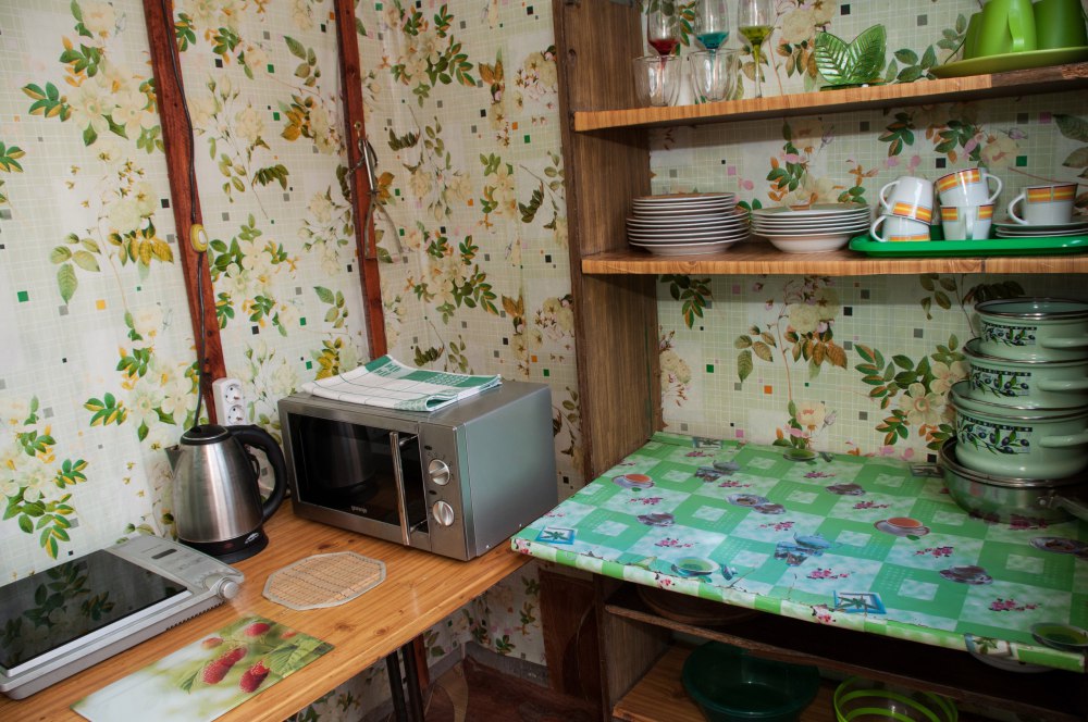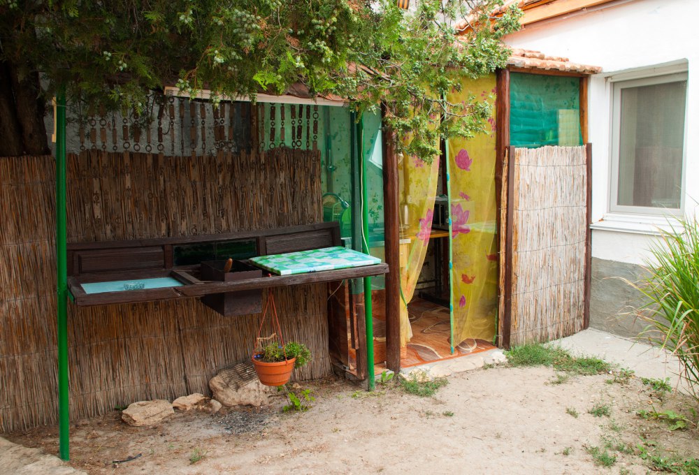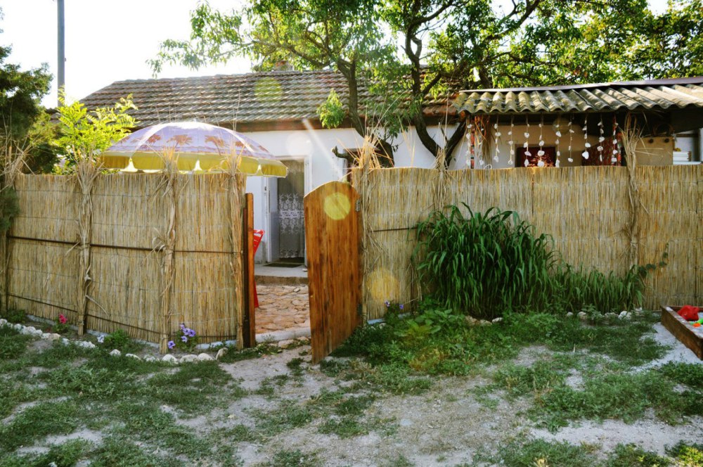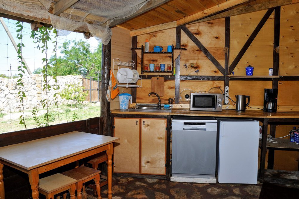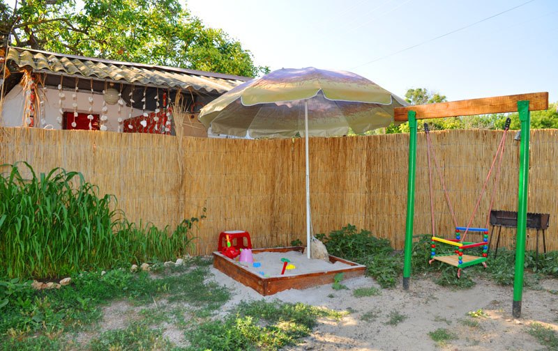 В домике: мебель, постельное бельё, Wi-fi, вентилятор. Удобства во дворе. Отдельный дворик с летней кухней. Холодильник, умывальник, плита, электрочайник, посуда, обеденный стол и столик для детей. Место для парковки и детская площадка в закрытом дворе.