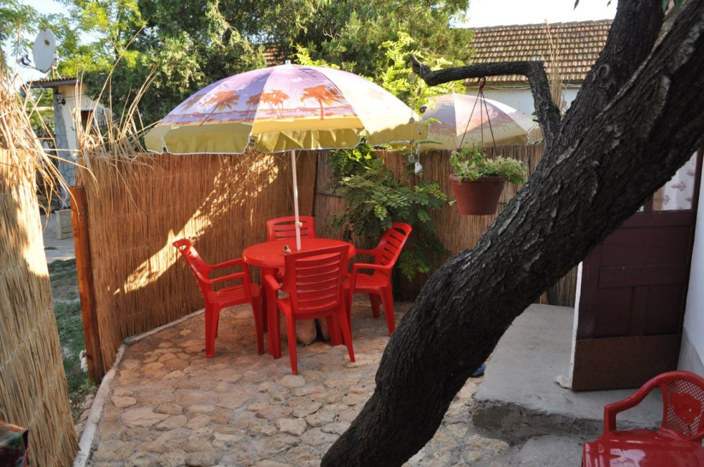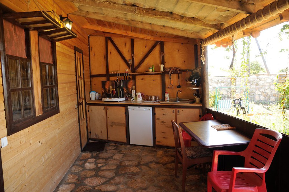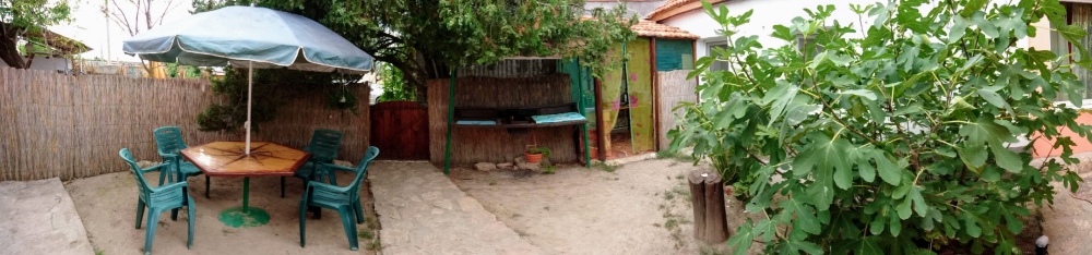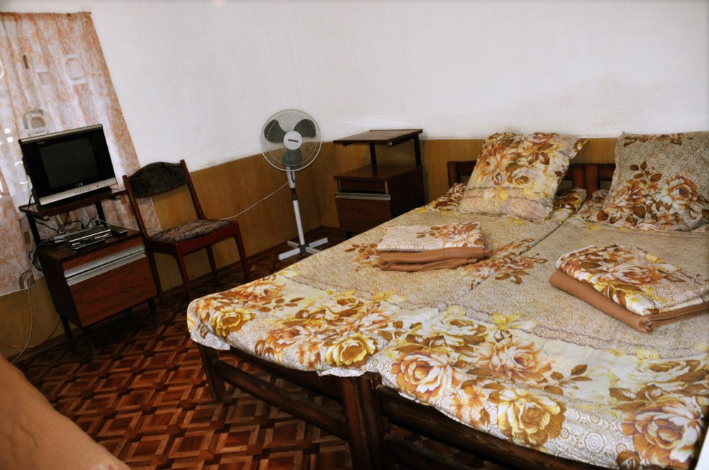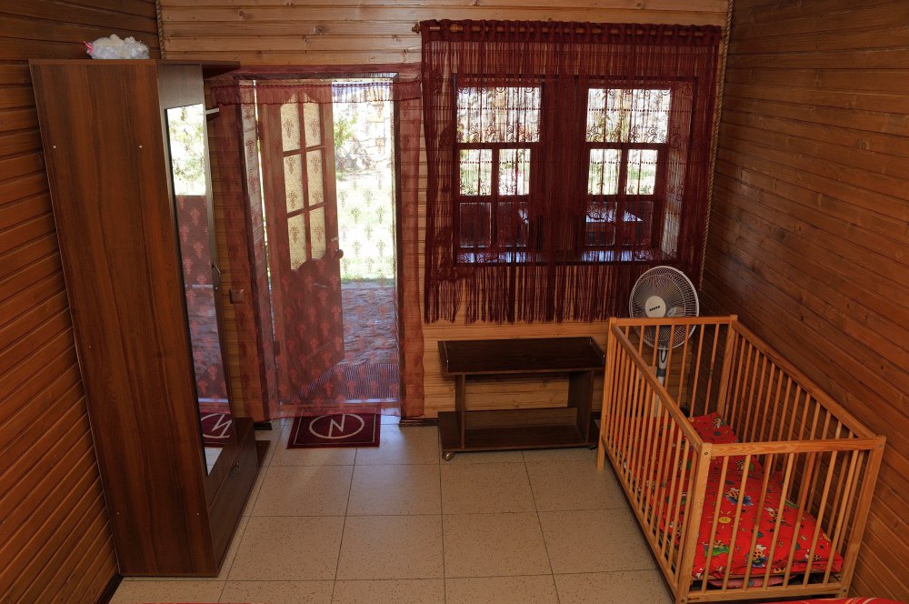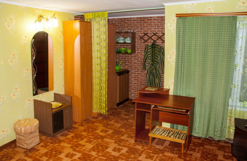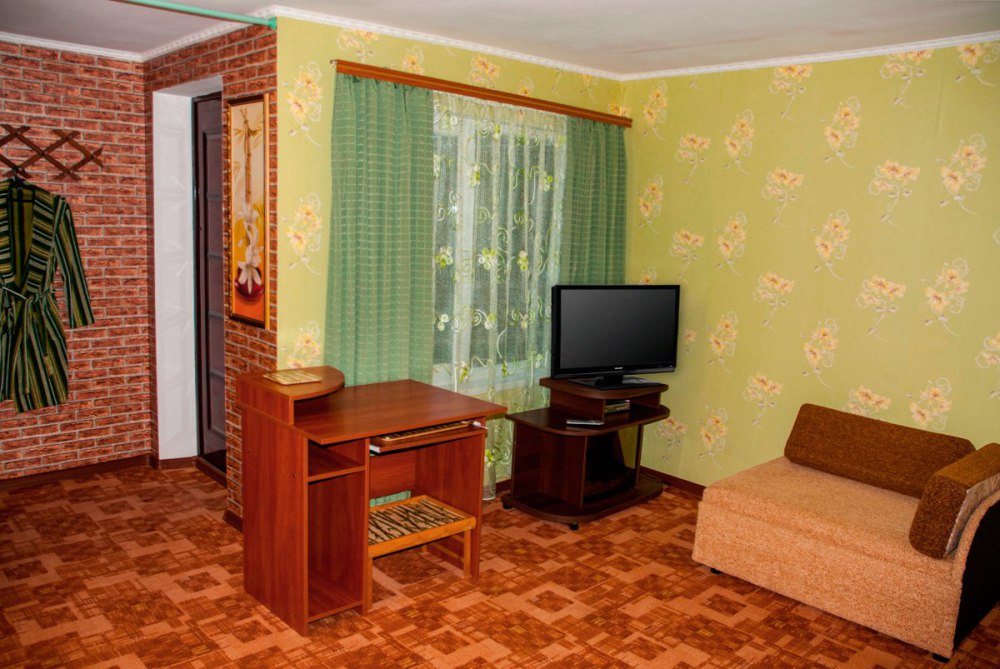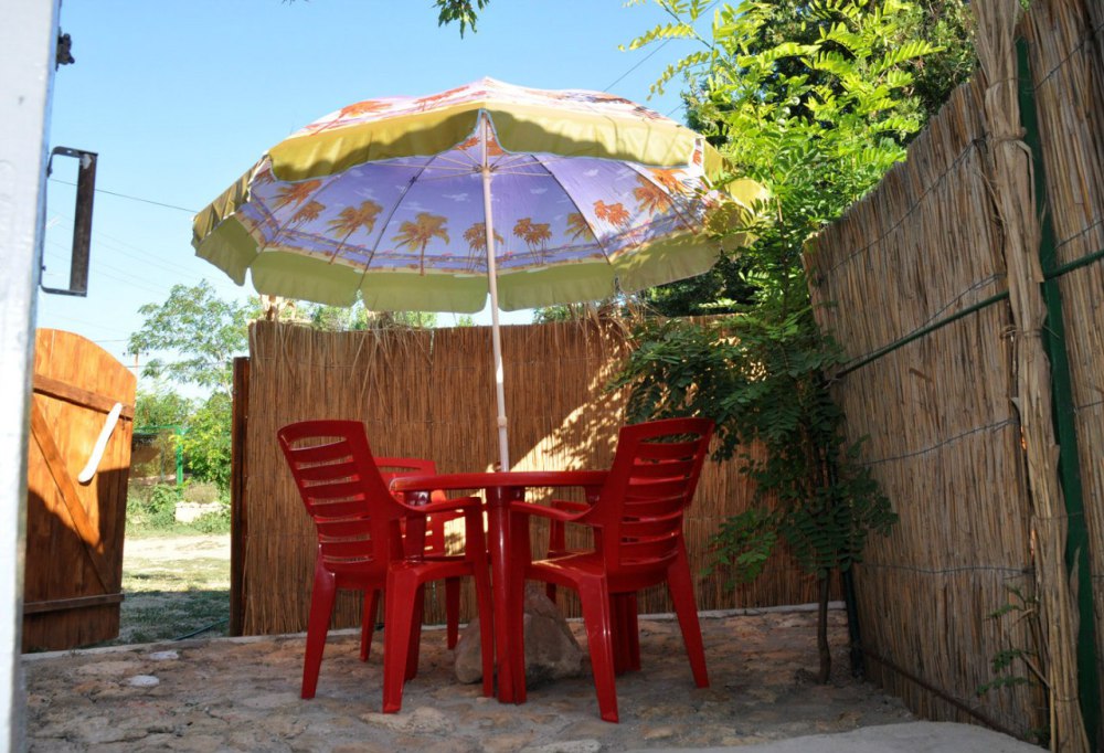 Просторный номер с двуспальной кроватью и двумя спальными местами для детей (раскладной диван и детская кроватка). В домике: туалет и душ (горячая вода круглосуточно), кондиционер, LCD телевизор 42» спутниковое ТВ, холодильник, компьютерный стол, Wi-fi. Отдельный вход и собственный уютный дворик с летней кухней в Вашем полном распоряжении. На кухне все необходимое: индукционная плита, микроволновая печь, посуда, раковина с горячей водой. Во дворе: мангал, стол, шезлонг, место для парковки.