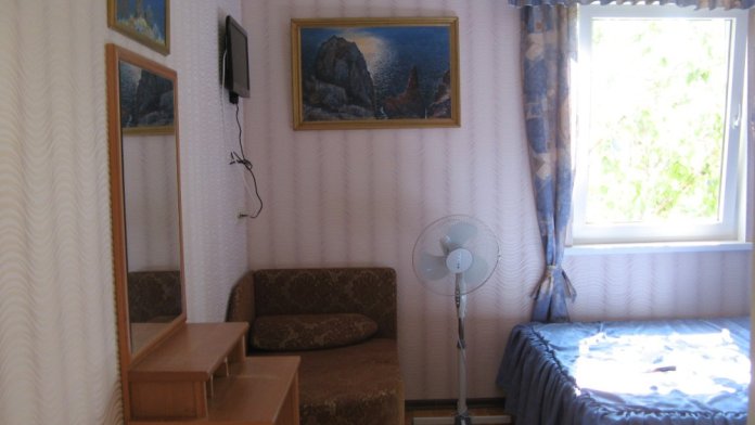 Однокомнатный номер со всеми удобствами. В комнате двухспальная кровать с ортопедическим матрацем и односпальная тахта. Так же шкаф,тумбочка,телефизор ЖК и кондиционер. В кухне-столовой есть холодильник,мокроволновка, двухкомфорочная электроплита ,эл.чайник и вся необходимая посуда. Санузел с душем,умывальником и унитазом и стиральной машинкой малюткой. В общем все необходимое для жизни имеется. Находится в нижней части города,не на горе. До набережной пешком 15 минут,до Массандровского пляжа - 25 минут.