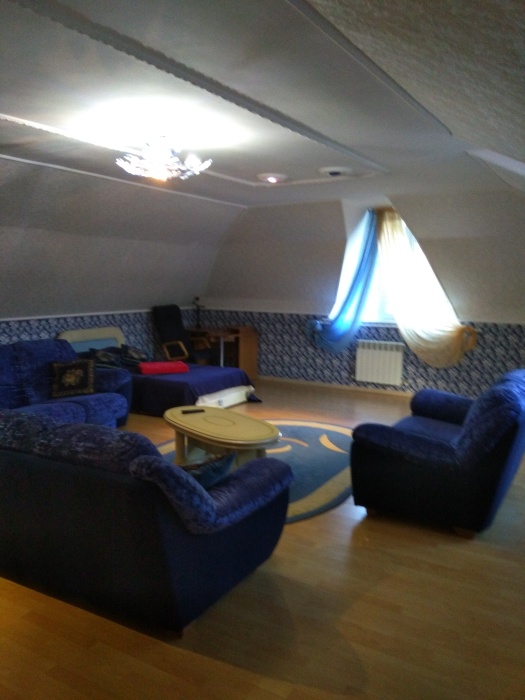 На первом этаже-кухня и санузел,на втором-две раздельные спальни и гостиная.