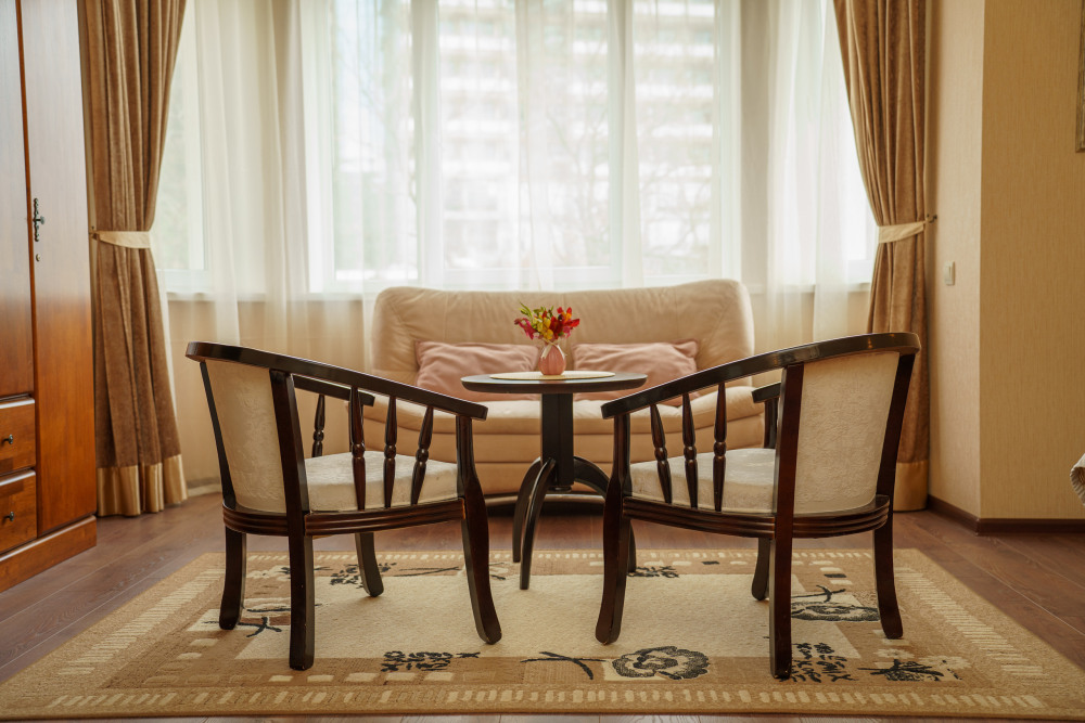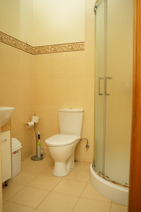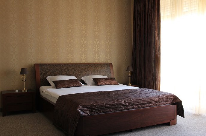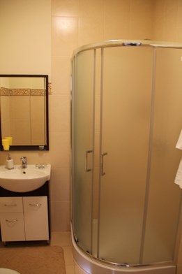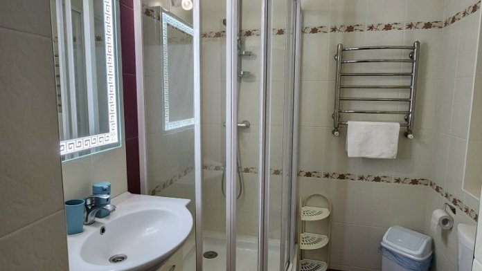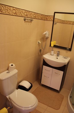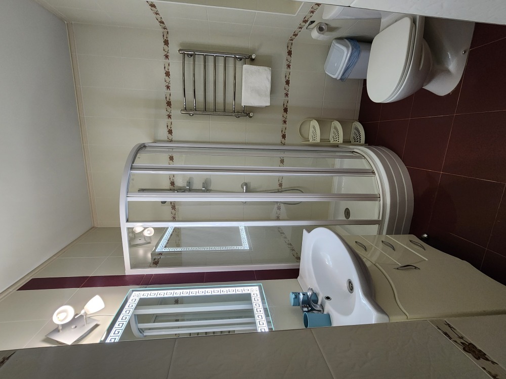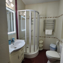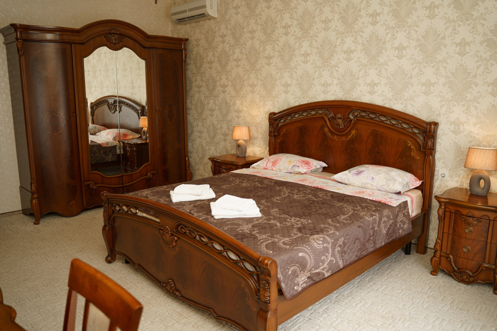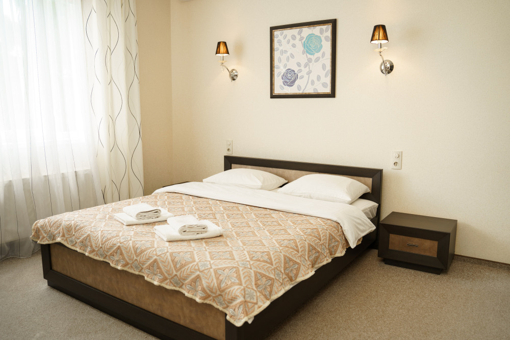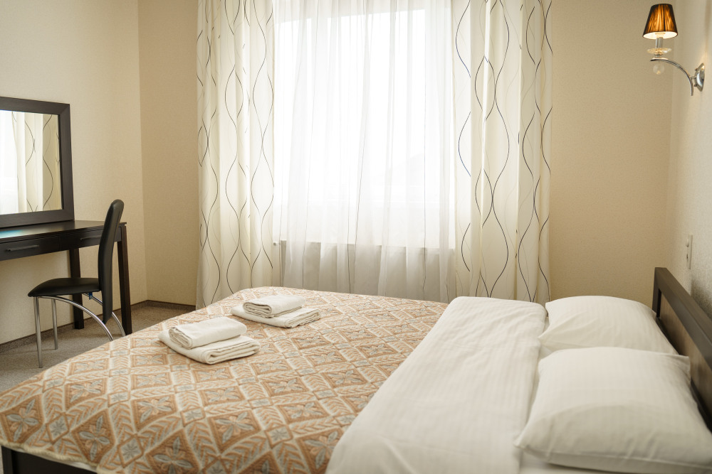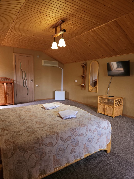 Двух местный просторный номер, площадь 26 кв м. В номере: двуспальная кровать, шкаф для одежды , холодильник, кресла, столик, телевизор, электрочайник, набор посуды, кабельное телевидение, кондиционер. В холодное время суток отопление. Санузел-душевая кабина, умывальник, фен.