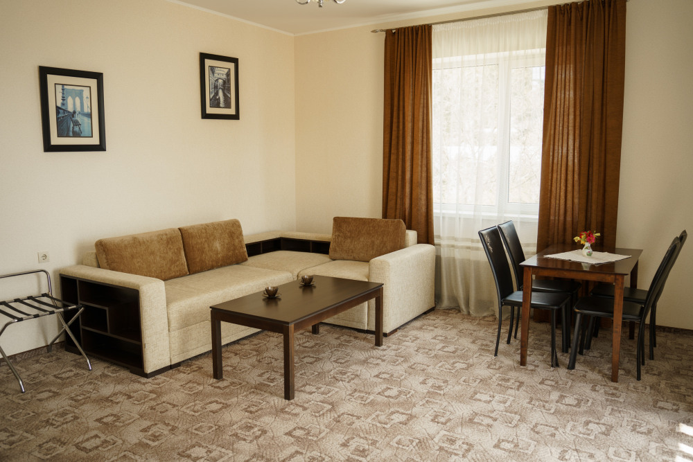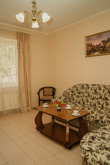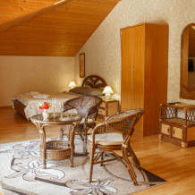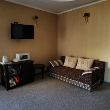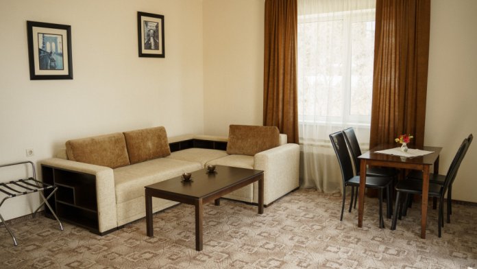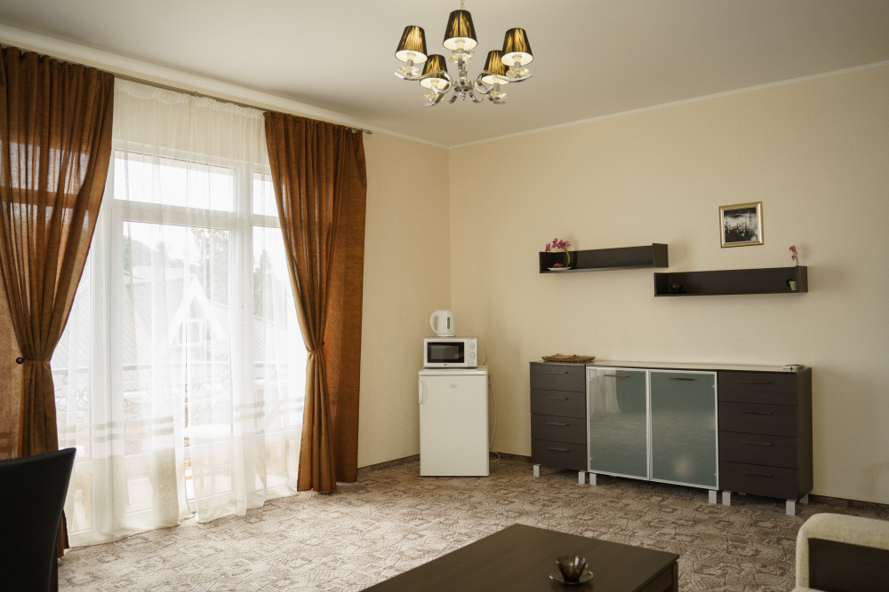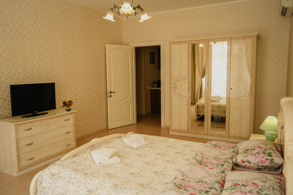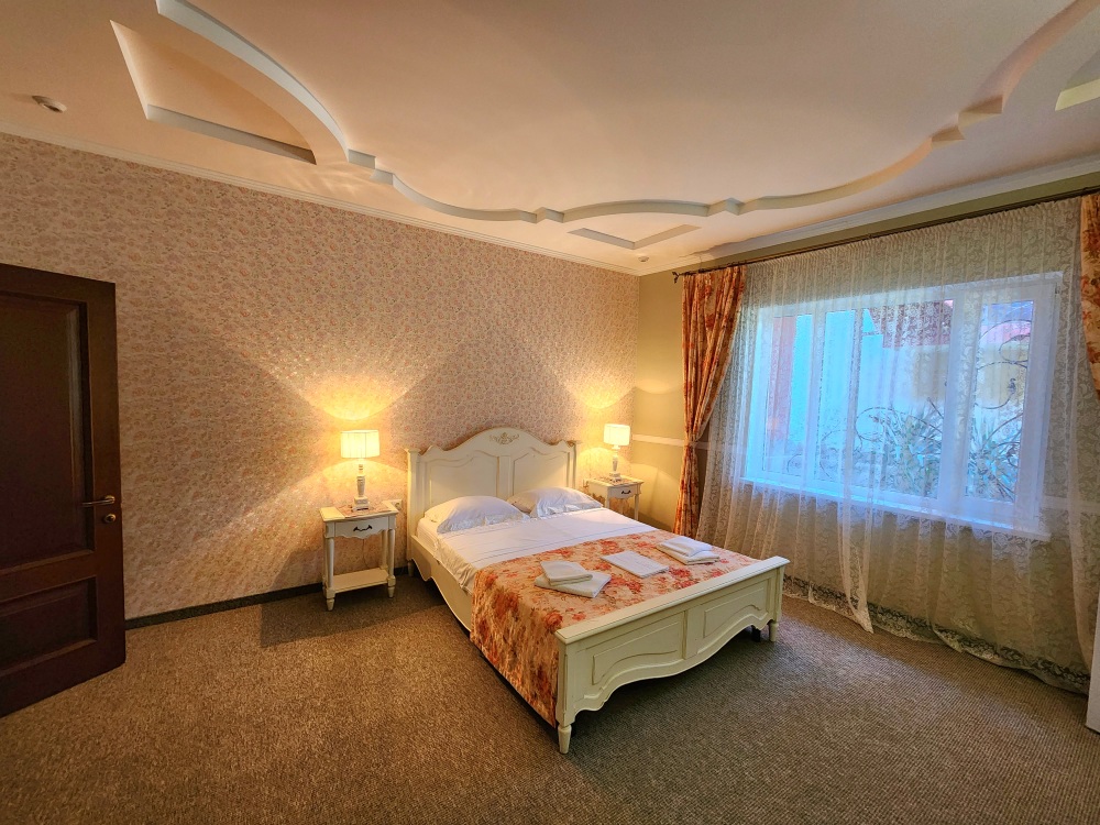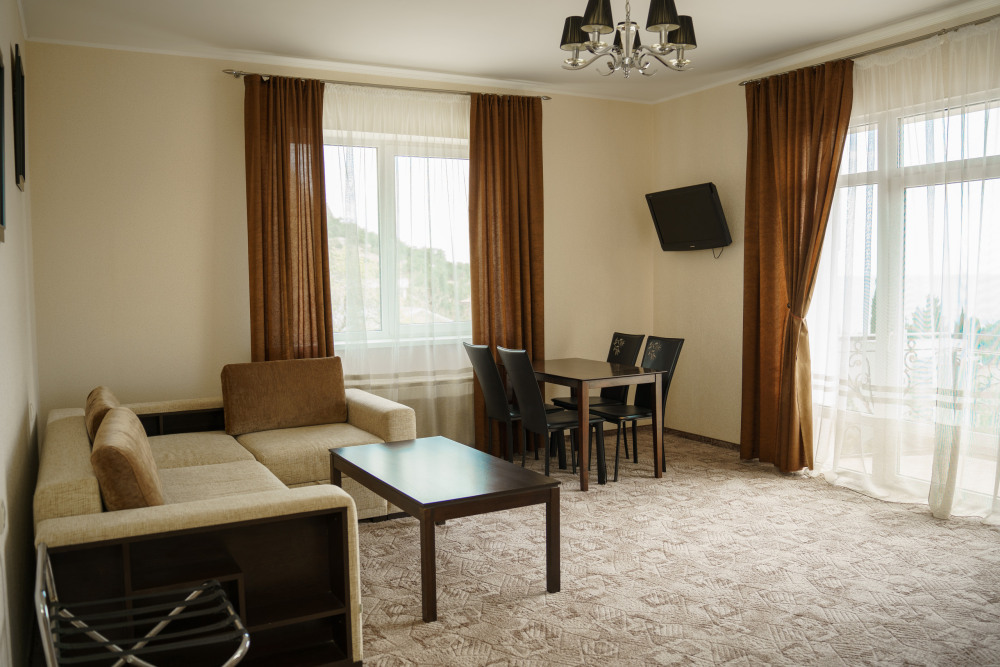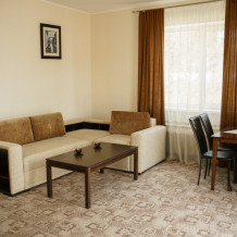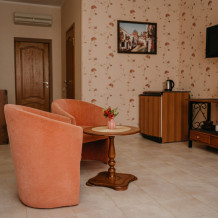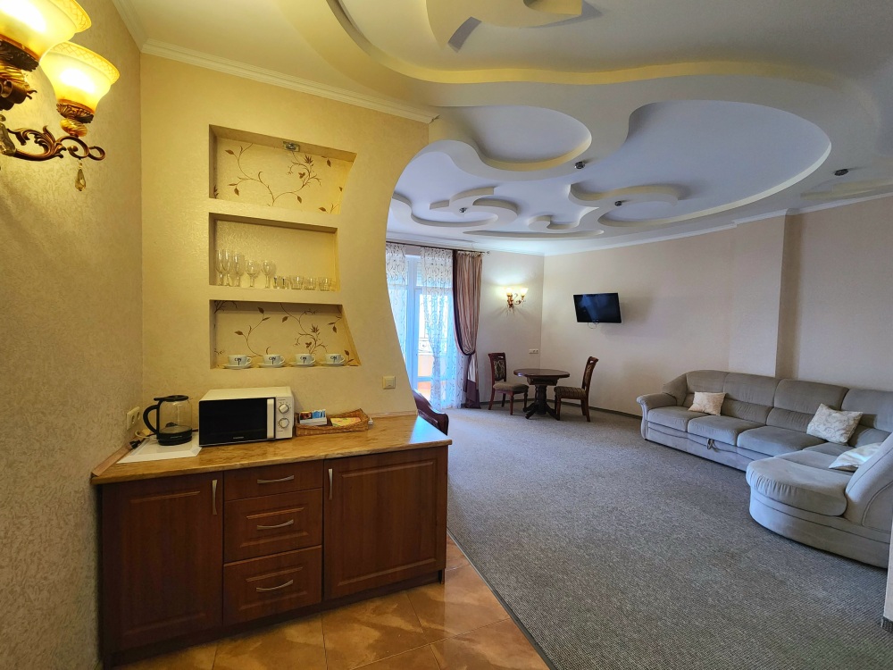 Номер повышенной комфортности с кухней и спальней. В одной из комнат - угловой диван, столик. кухня с микроволновой печью, холодильник, электрочайник, набор посуды. В спальне- двуспальная кровать. тумбочки, шкаф, туалетный столик, телевизор, кондиционер, сейф. Санузел-душевая кабина, умывальник, фен. Количество гостей 3+1 (дополнительно).