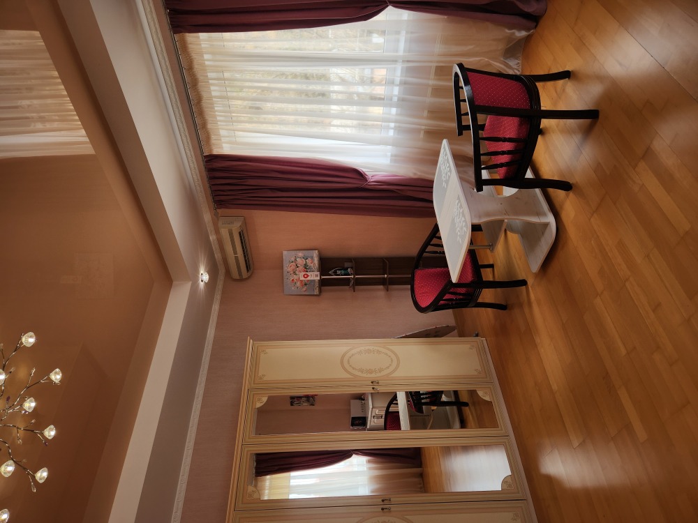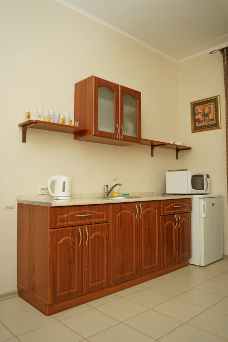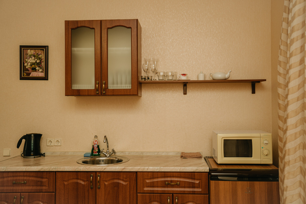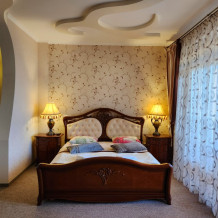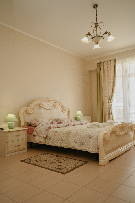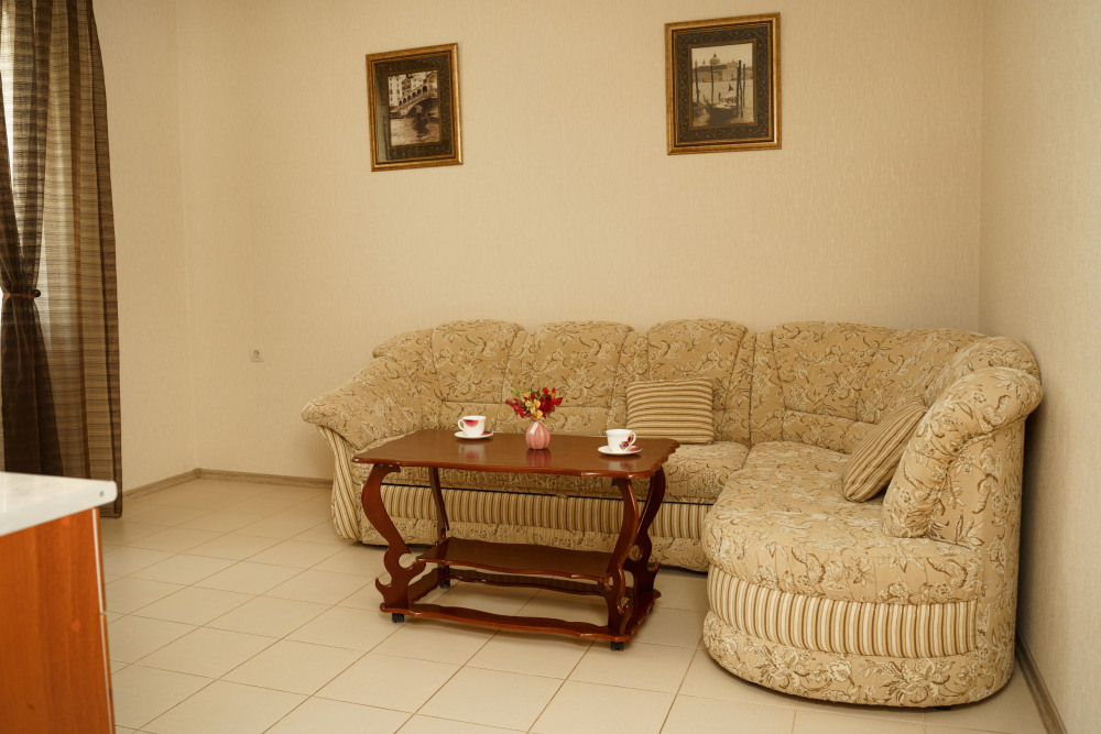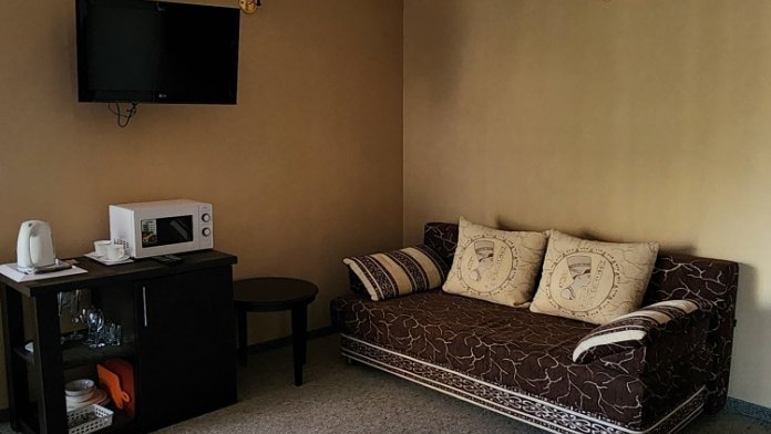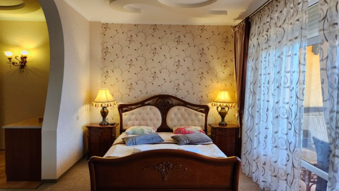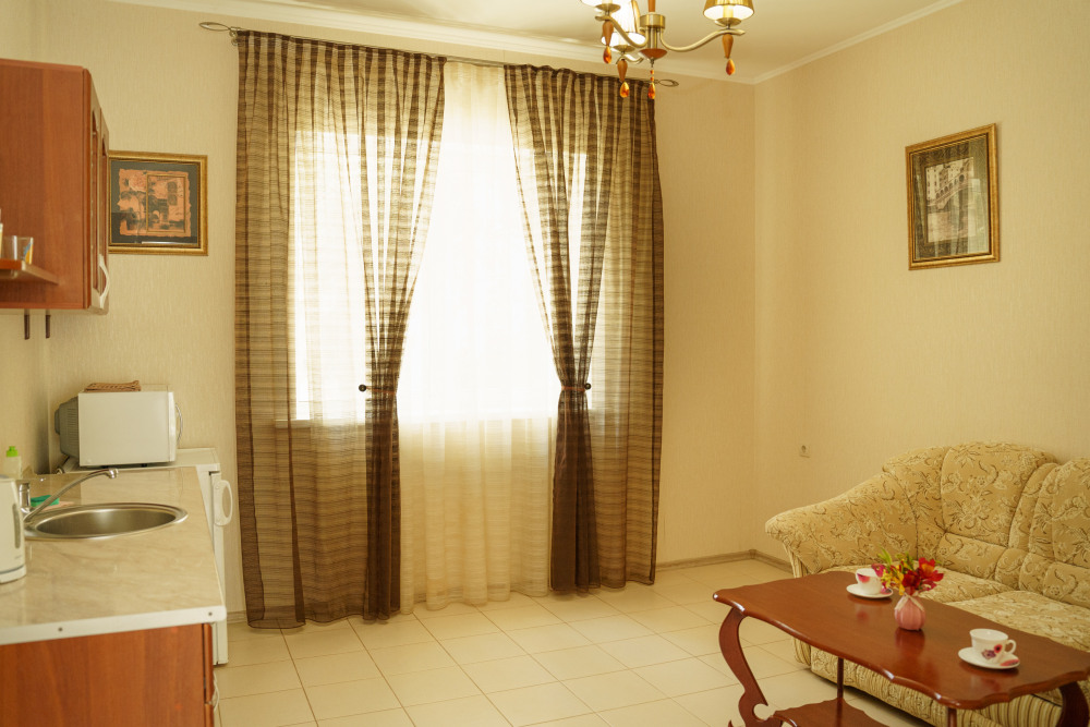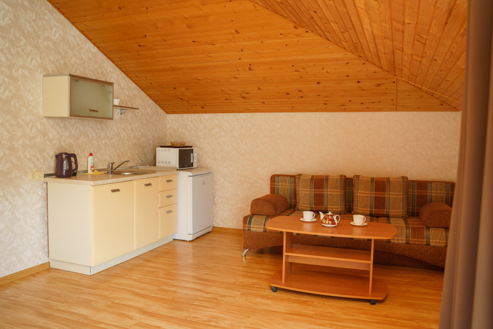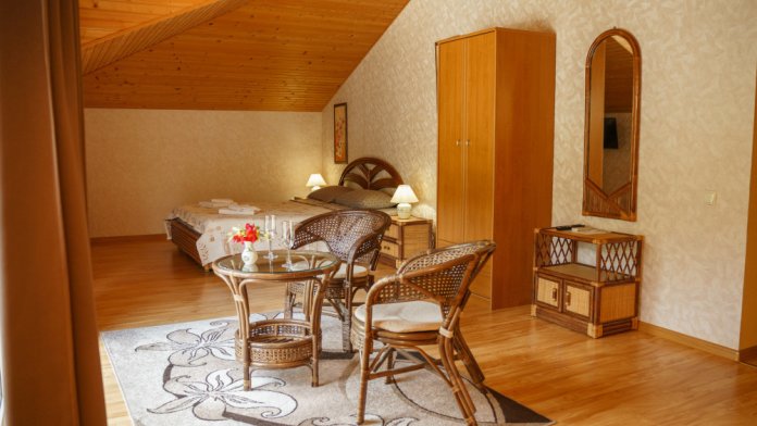 Номер повышенной комфортности с кухней и спальней. В одной из комнат - угловой диван, столик. кухня с микроволновой печью, холодильник, электрочайник, набор посуды. В спальне- двуспальная кровать. тумбочки, шкаф, туалетный столик, телевизор, кондиционер, сейф. Санузел-душевая кабина, умывальник, фен. Количество гостей 3+1 (дополнительно).