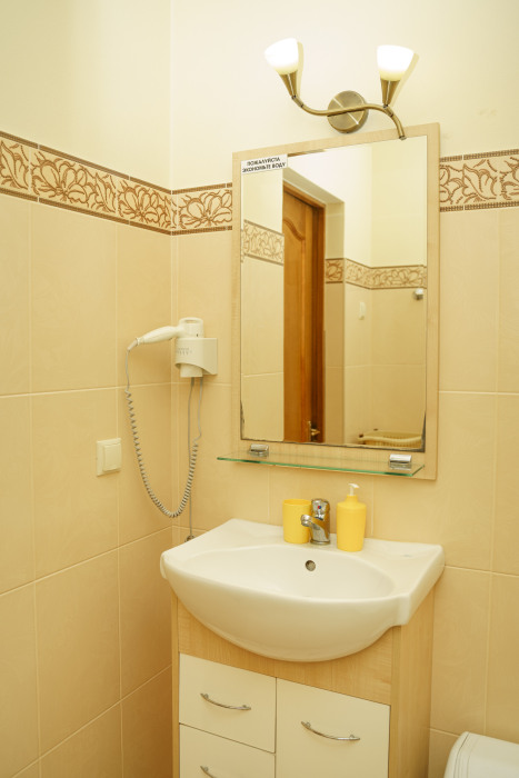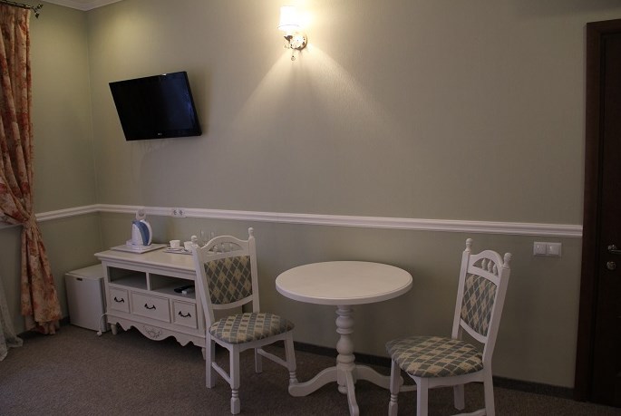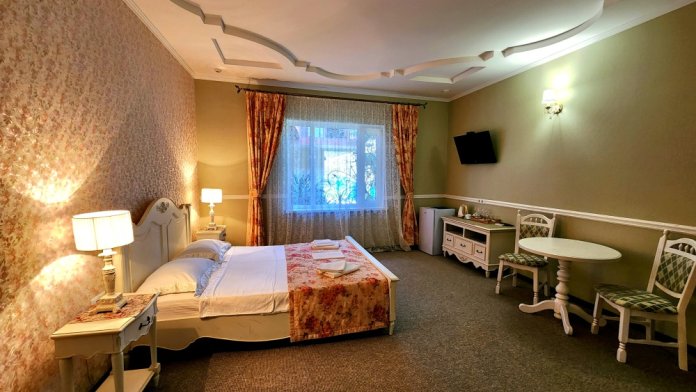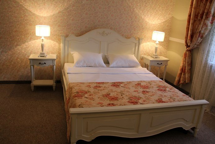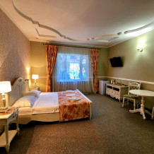 Двухместный номер с большим эркерным окном. В номере - двуспальная кровать, два кресла, столик, холодильник, электрочайник, набор посуды, кабельное телевидение, кондиционер. Санузел-душевая кабина, умывальник, фен.