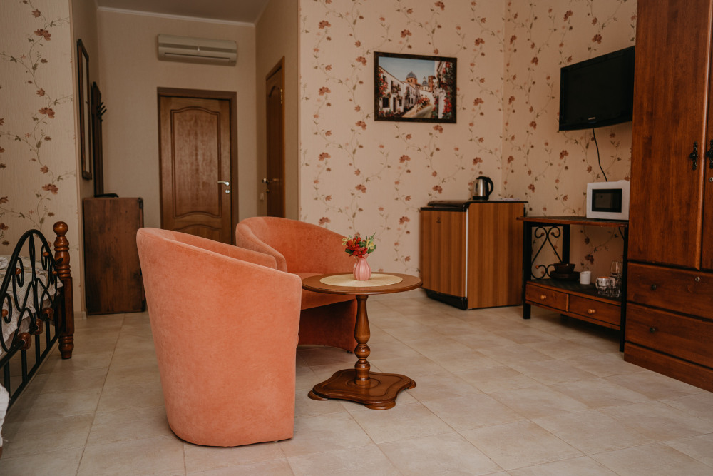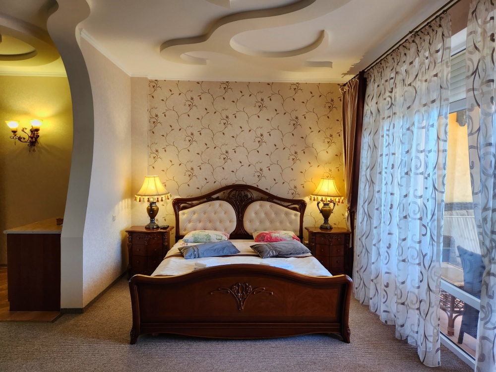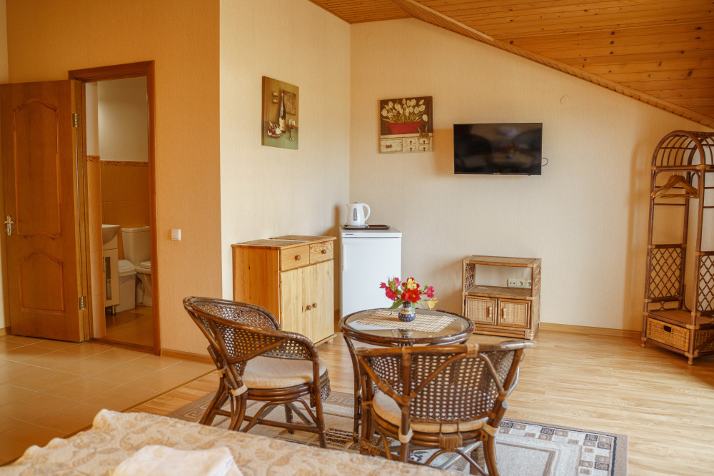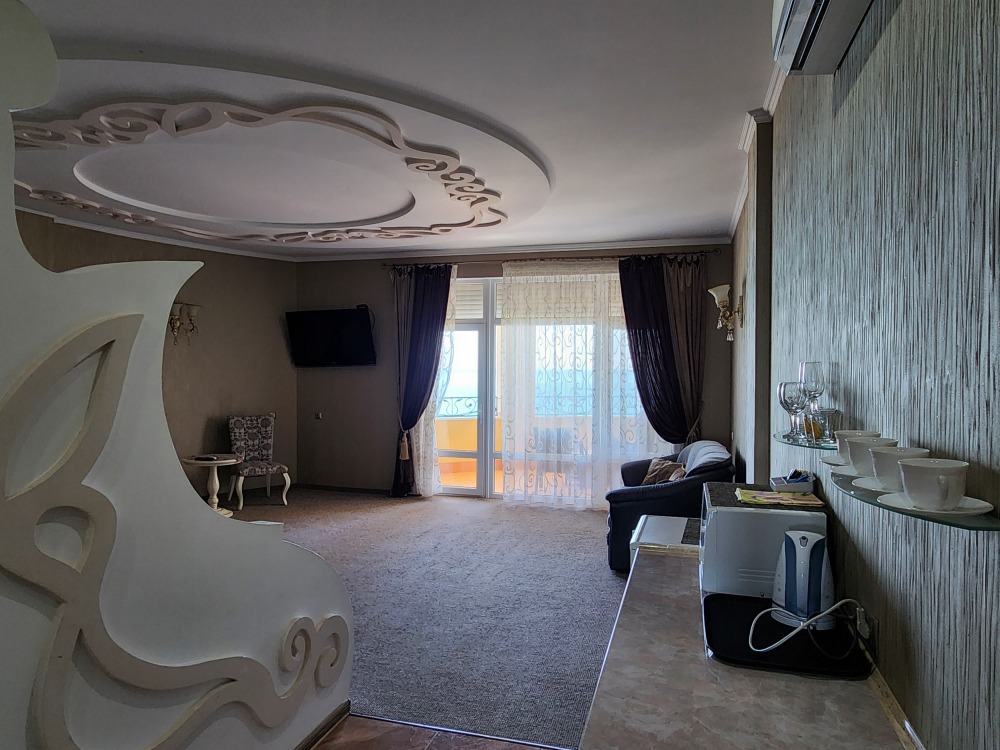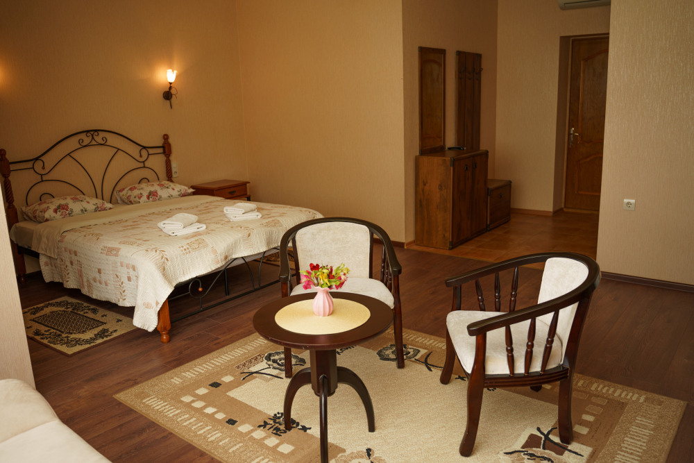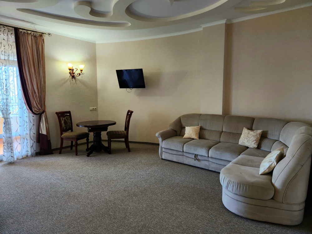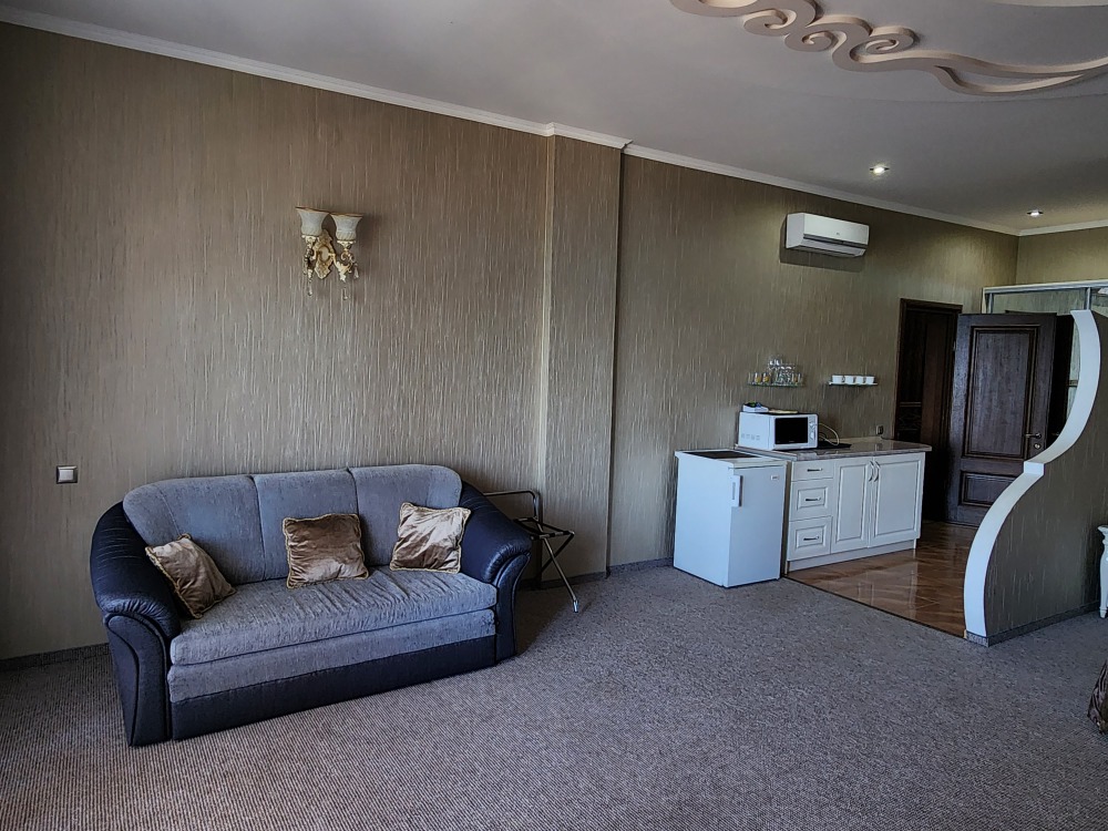 Просторный номер с декоративным потолком распологает большой двужспальной кроватью, гостинным уголком с угловым диваном, мини-кухней,с собственного балкона открывается вид на море. Балкон меблирован ранговой мебелью. Душевая.Туалет. Мебель в номере новая.