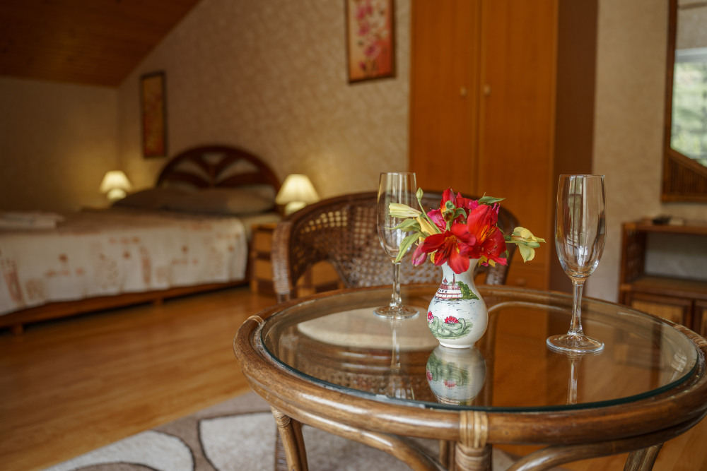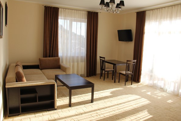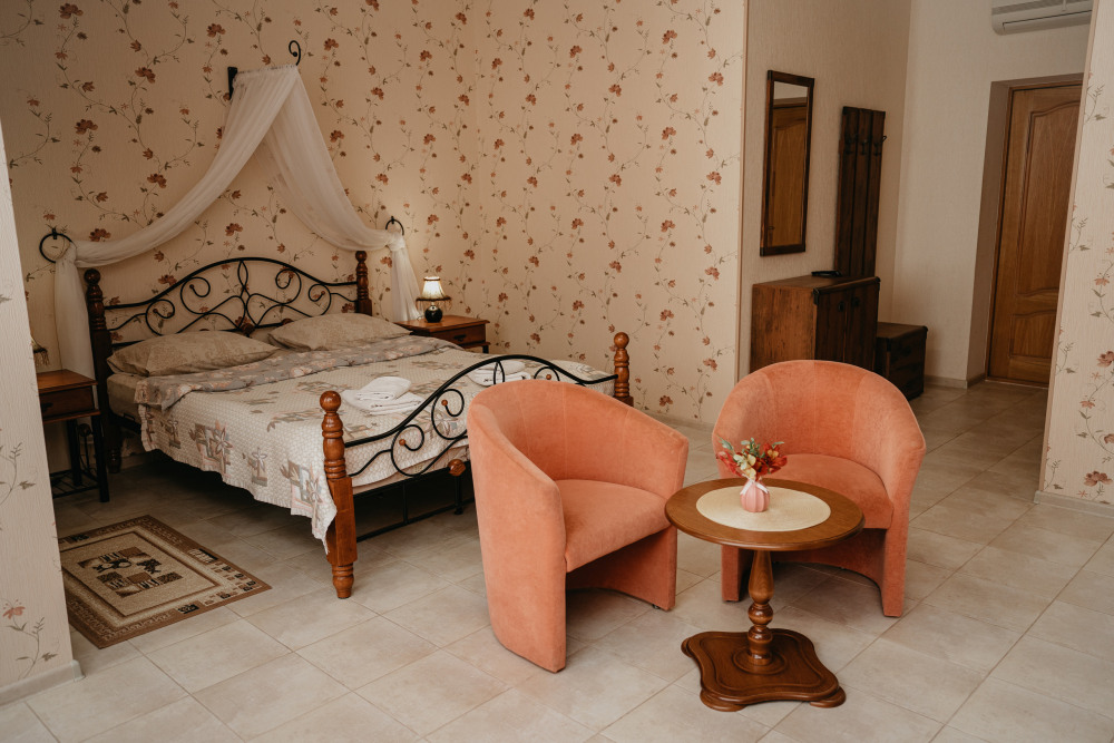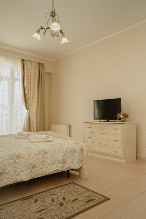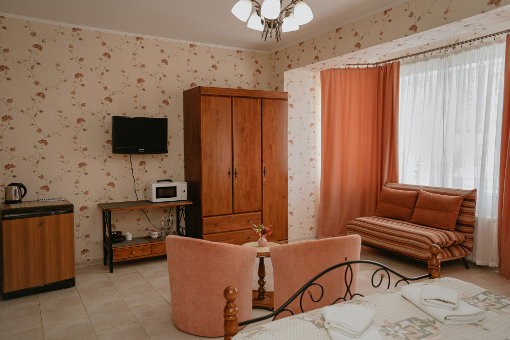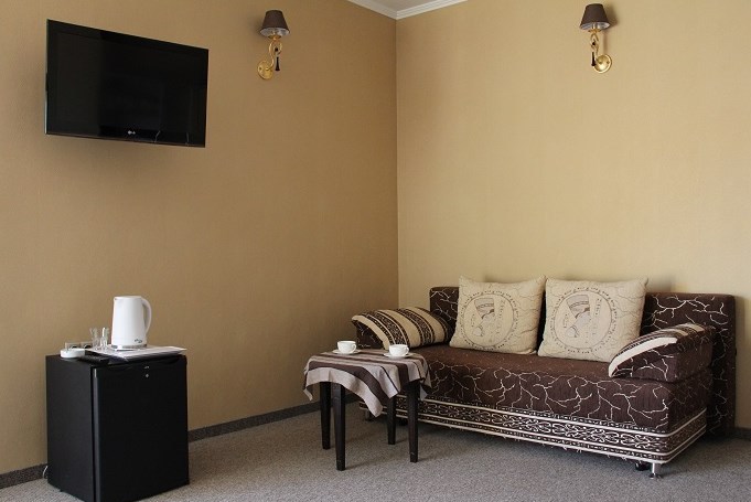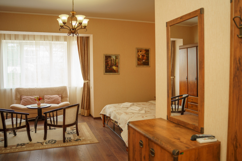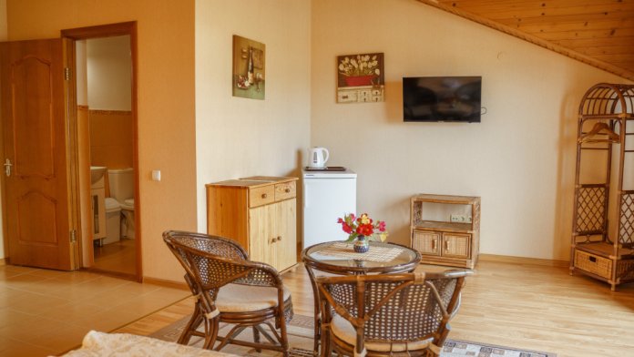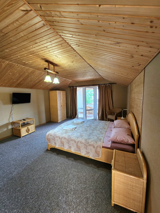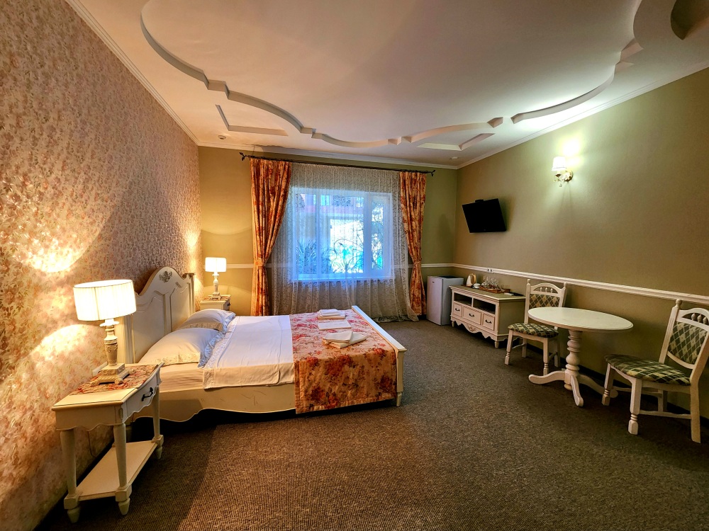 Просторный номер с декоративным потолком распологает большой двужспальной кроватью, гостинным уголком с угловым диваном, мини-кухней,с собственного балкона открывается вид на море. Балкон меблирован ранговой мебелью. Душевая.Туалет. Мебель в номере новая.