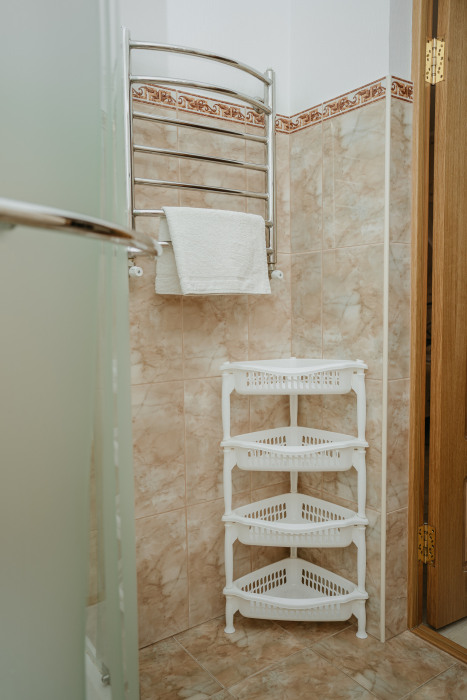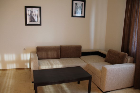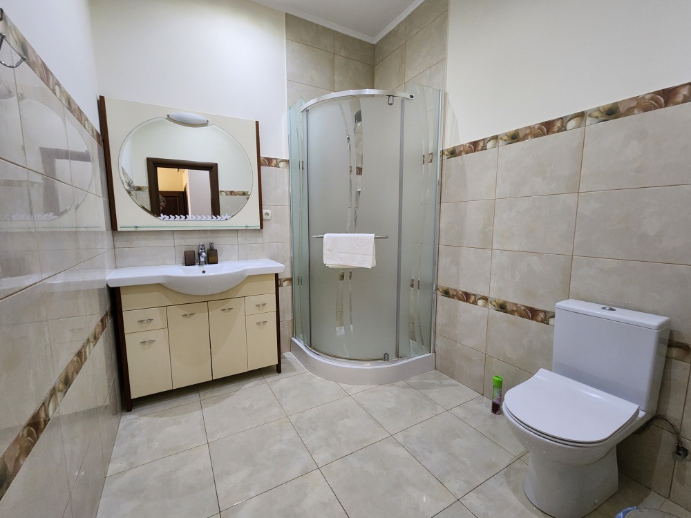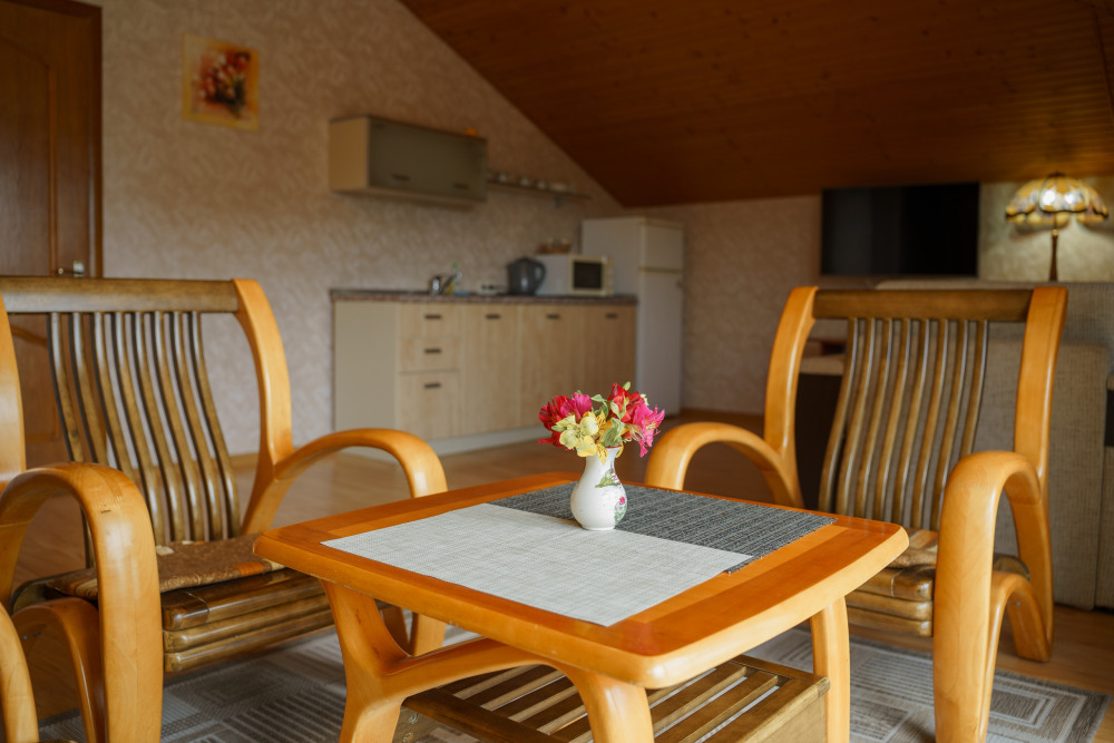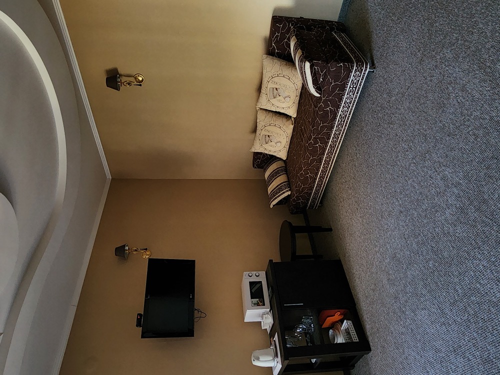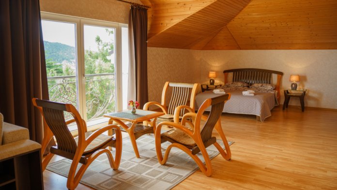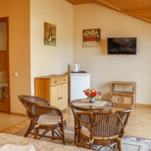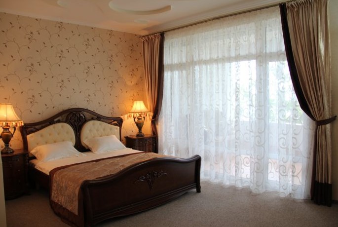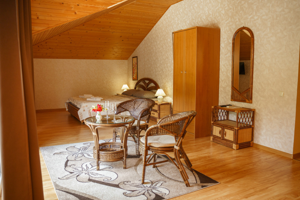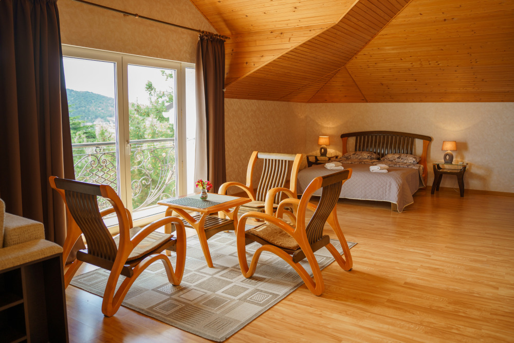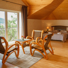 Просторный номер с декоративным потолком распологает большой двужспальной кроватью, гостинным уголком с угловым диваном, мини-кухней,с собственного балкона открывается вид на море. Балкон меблирован ранговой мебелью. Душевая.Туалет. Мебель в номере новая.