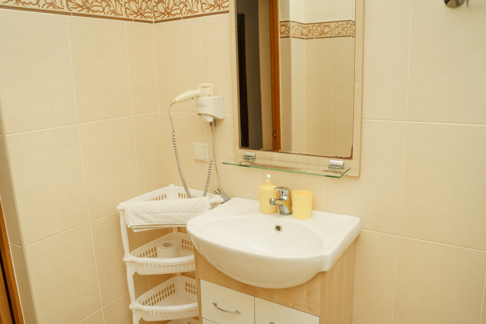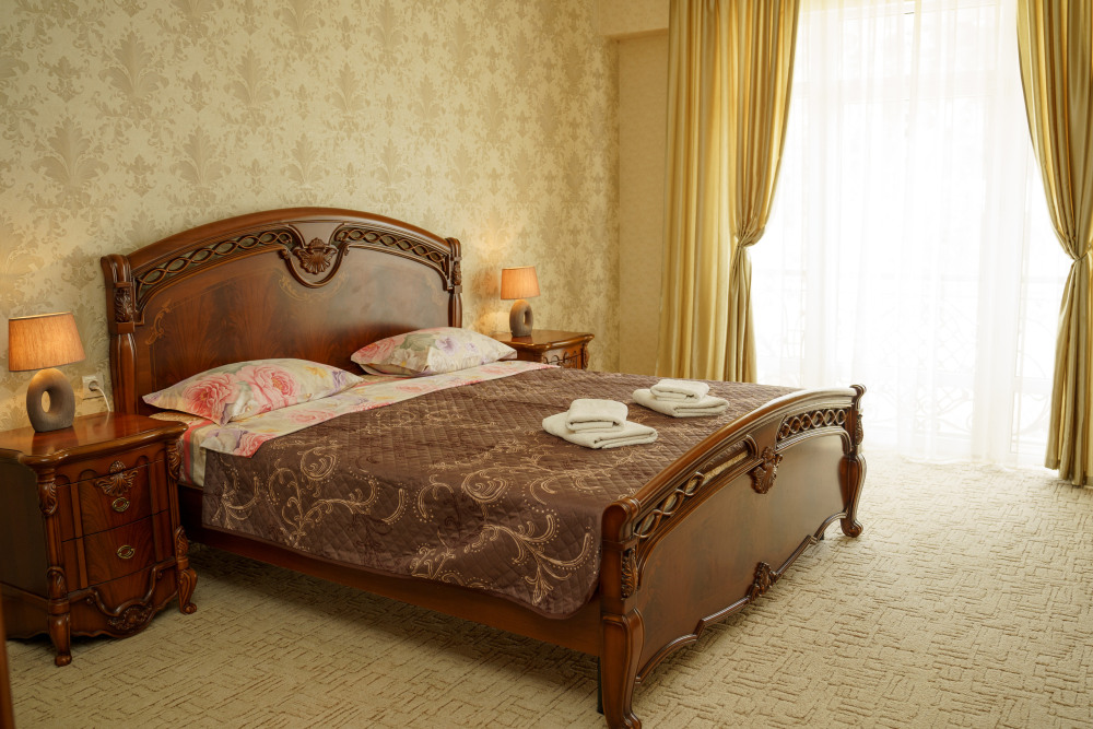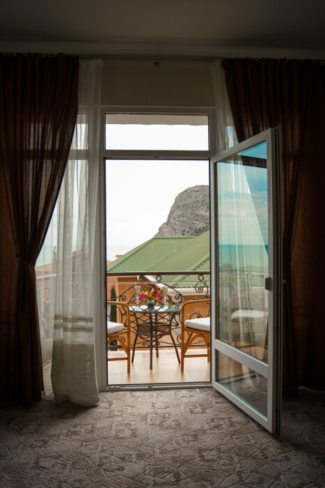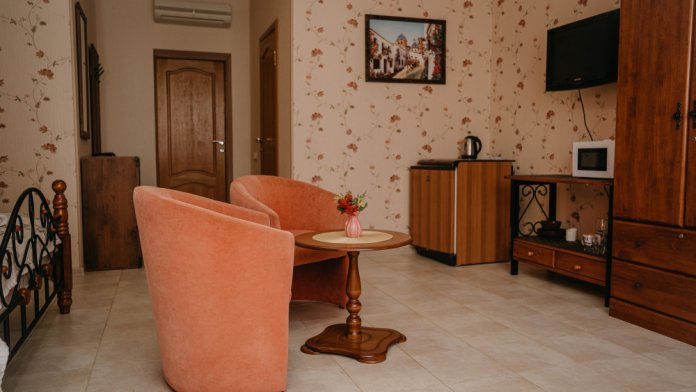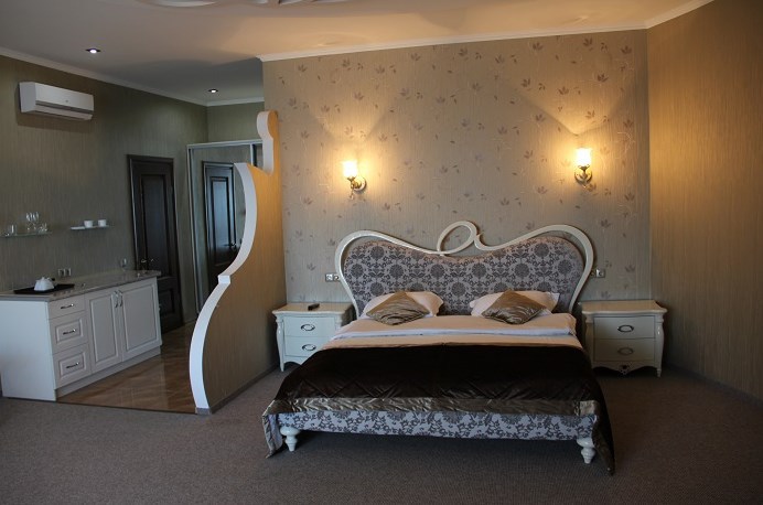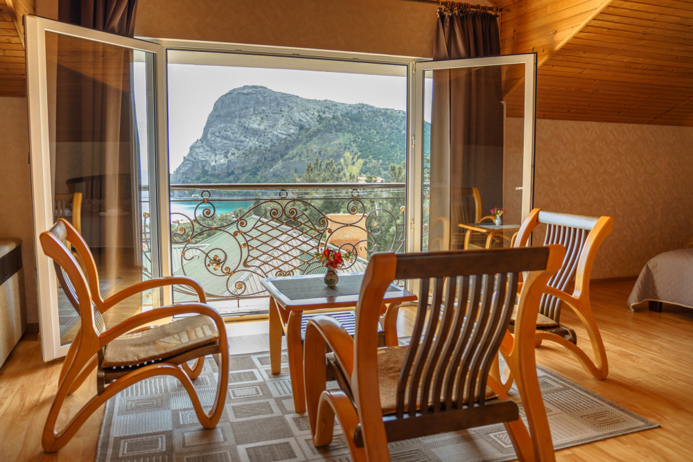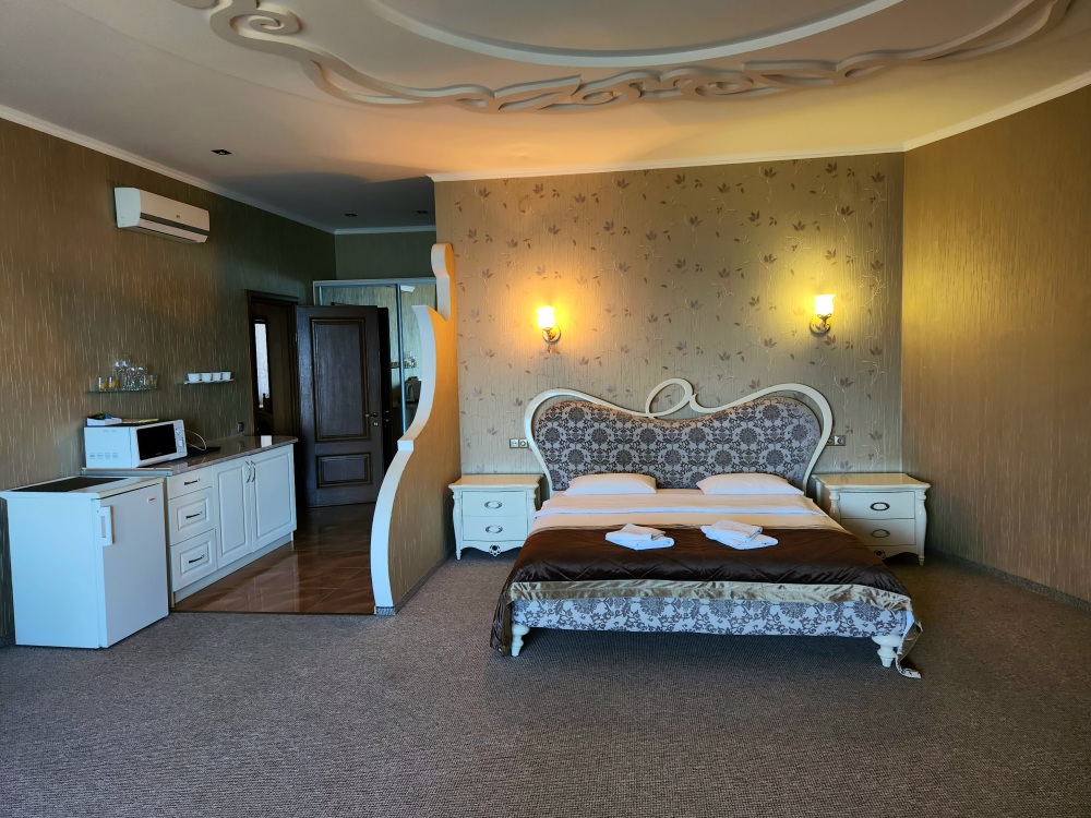 Номер улучшенной планировки площадью 40 кв.м. Просторный номер с французским балконом вид на море. В номере мебель размещена по зонам: кухонный уголок (микроволновая печь, холодильник, электрочайник, набор посуды), зона для отдыха- раскладной мягкий уголок, столик, кресла, двуспальная кровать, шкаф. В номере есть кабельное телевидение, кондиционер, сейф. Санузел-душевая кабина, умывальник, фен. Количество гостей 3+1(дополнительно).