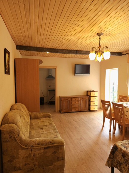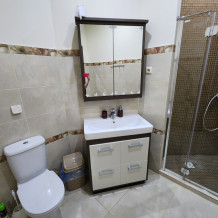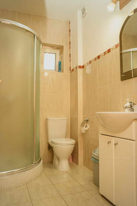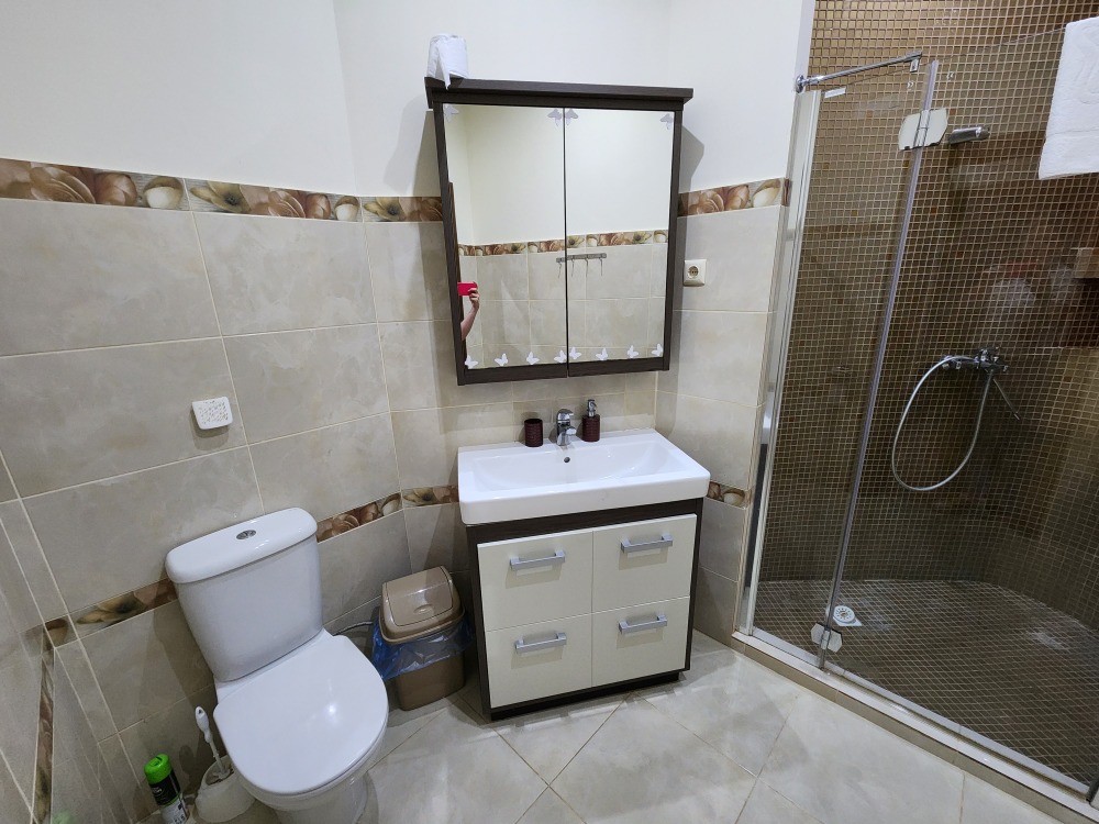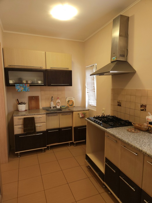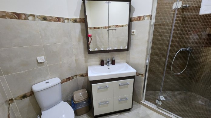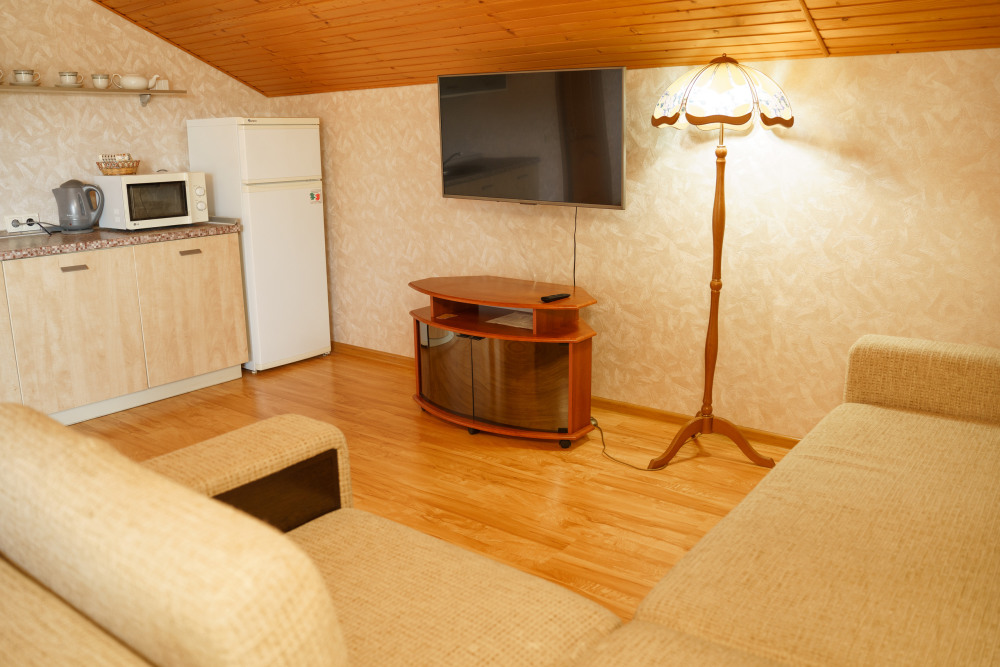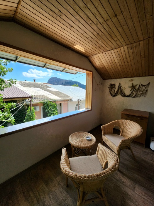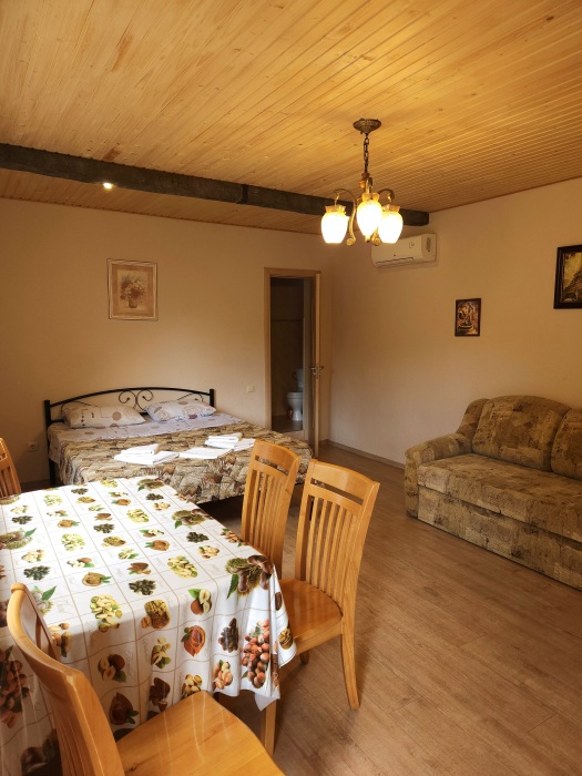 Номер- студия открытой планировки с кондиционером, распологает большой двухспальной кроватью, гостинным уголком с диваном-кроватью, мини-кухней, ванной,в распоряжение гостей собственный балкон с мебелью с которого открывается вид на море.Душевая. Туалет. Мебель в номере новая.