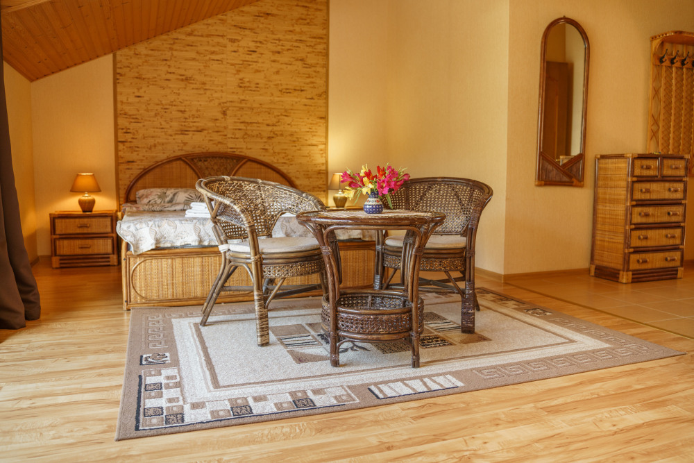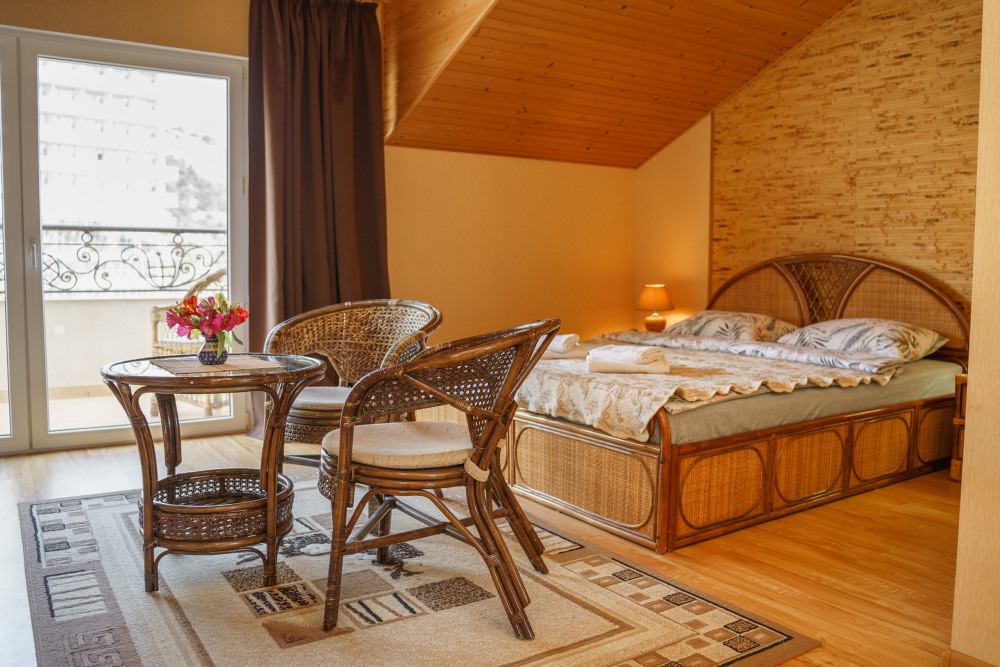Двух местный номер с балконом и видом на море. В номере - двуспальная кровать, два кресла, столик (мебель из ротанга), буфет, холодильник, электрочайник, набор посуды, кабельное телевидение, кондиционер. Санузел-душевая кабина, умывальник, фен.
