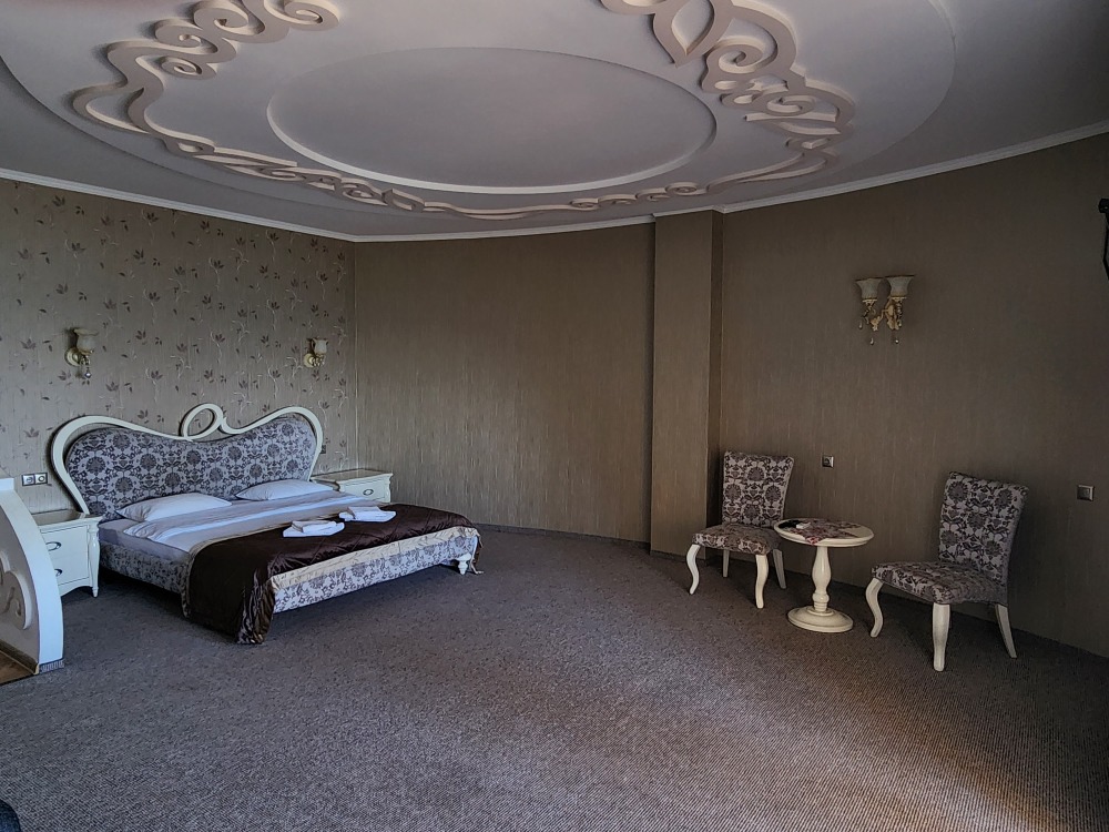 Двух комнатный люкс с балконом. В гостиной - мягкий уголок, сервант, журнальный столик, обеденный стол, стулья, холодильник, телевизор, кондиционер, электрочайник, набор посуды. Напольное покрытие ковролин. В спальне - двуспальная кровать, тумбочки, шкаф, сейф, зеркало. Санузел- душевая кабина, умывальник, фен. Количество гостей 3+1(дополнительно).