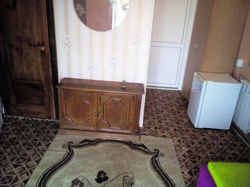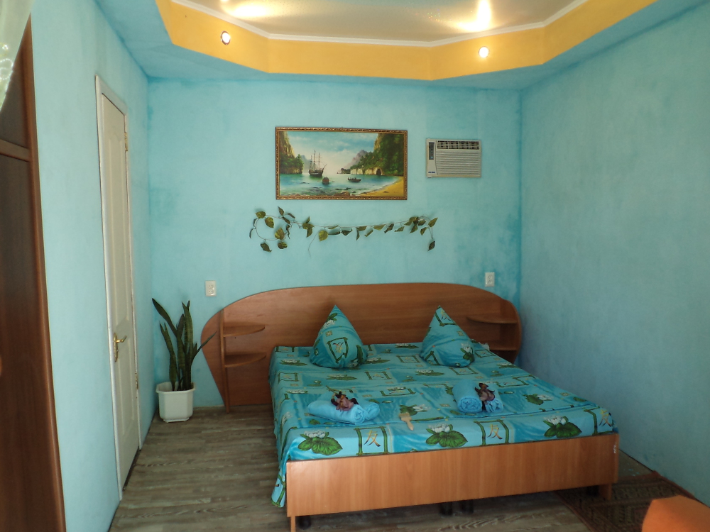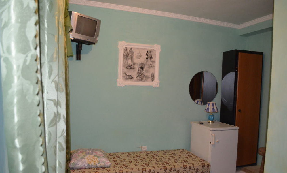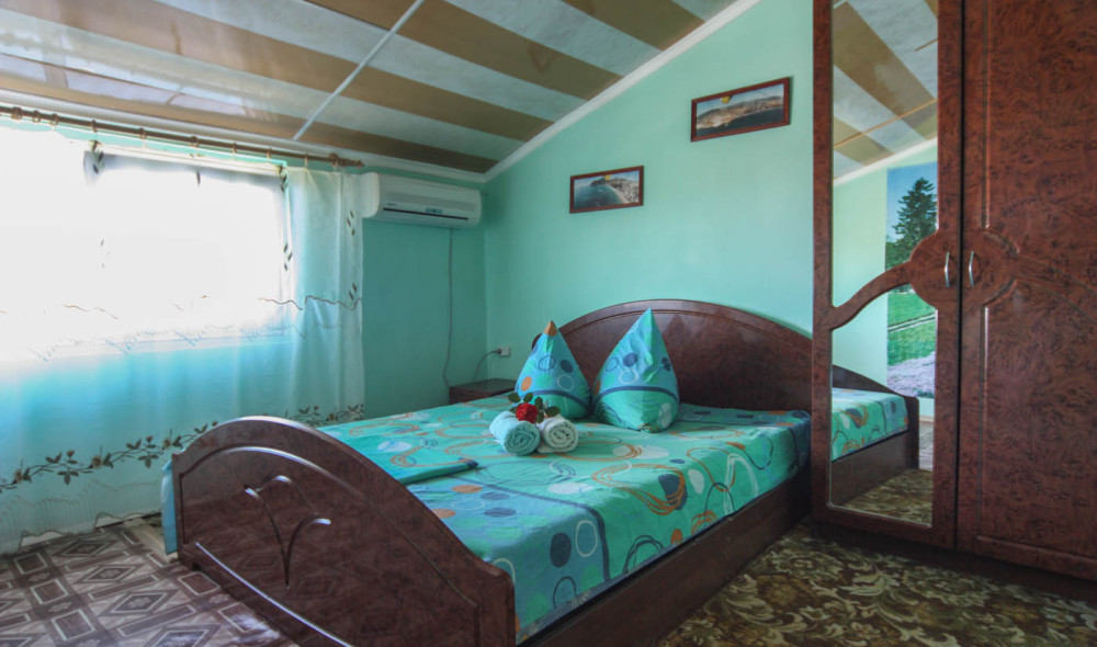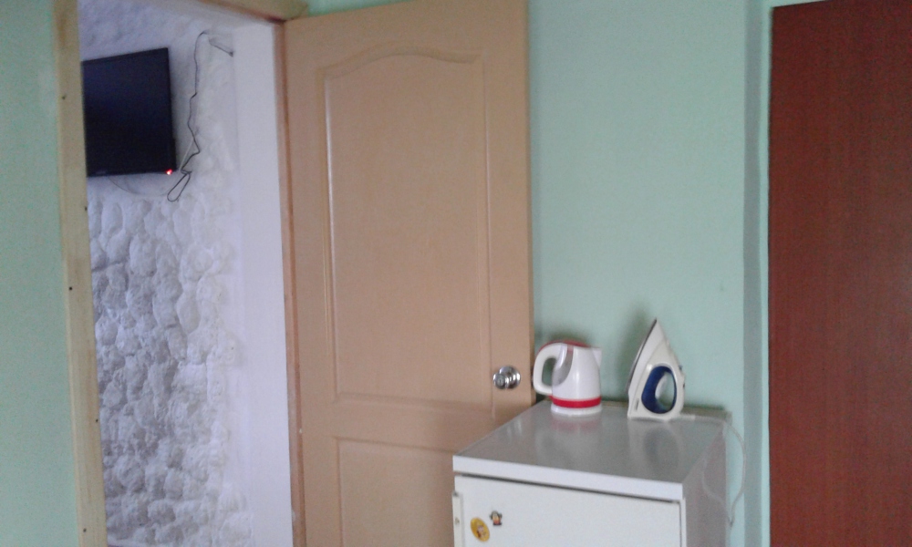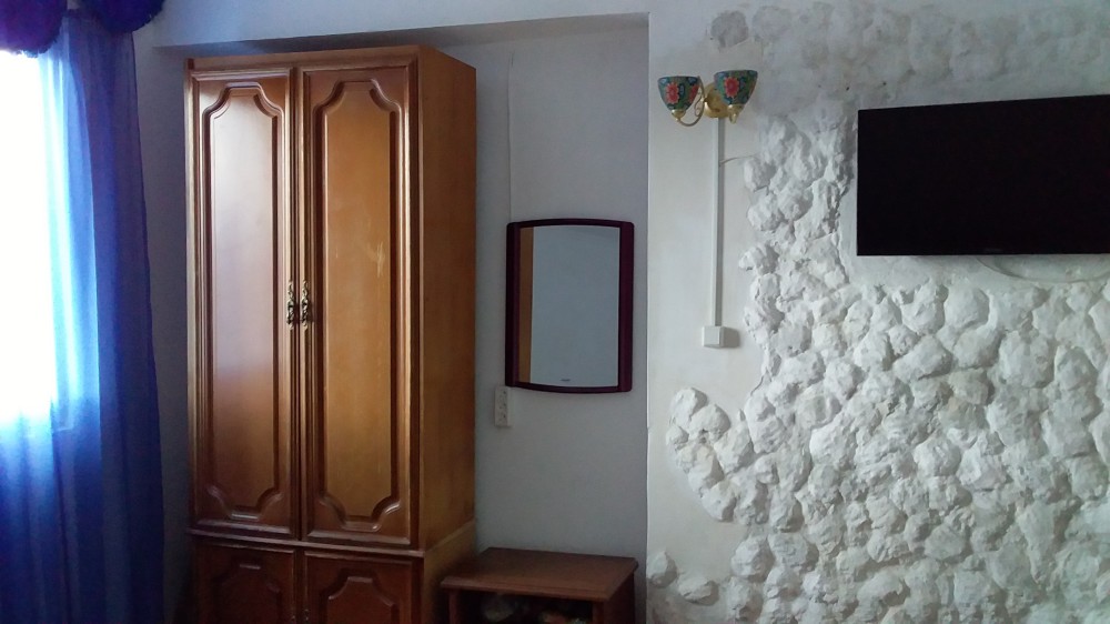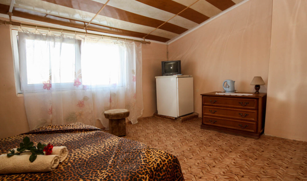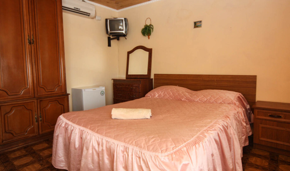 В номере: кровати 1,80 м х 2,00 м и диванчик 1,40 х 1,90, раскладывается вперёд. Шкаф, холодильник, телевизор, кондиционер, тумбочки. Санузел, вода горячая круглосуточно (солнечные батареи). Рядом кухня общего пользования.