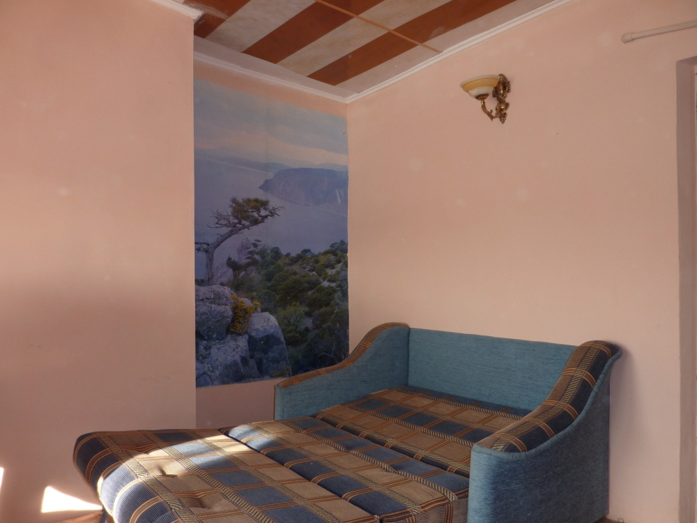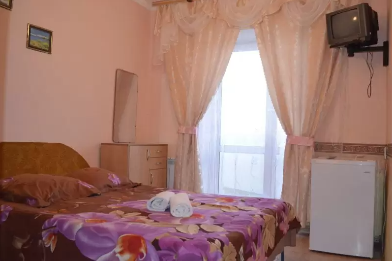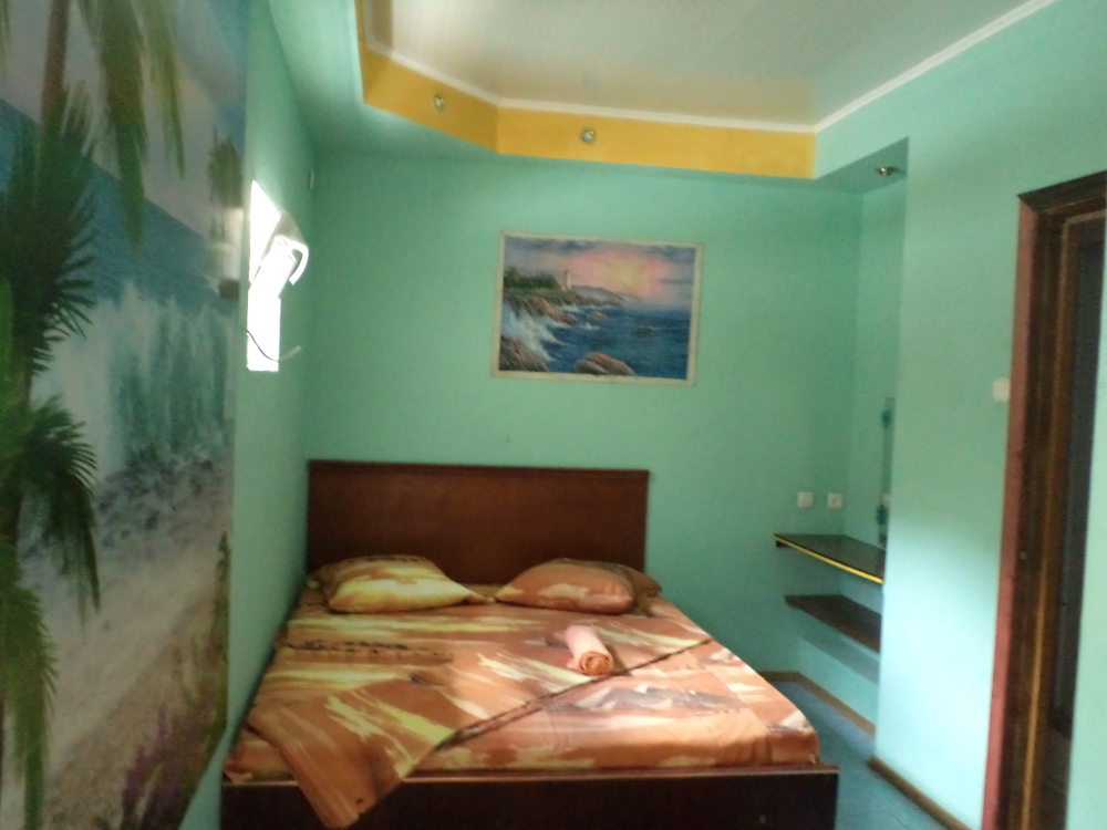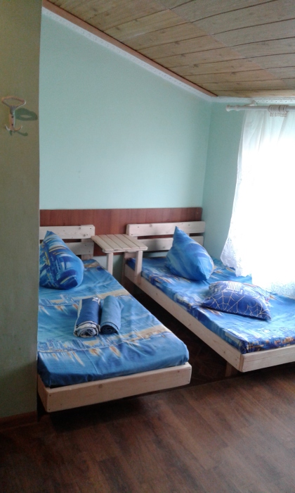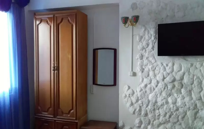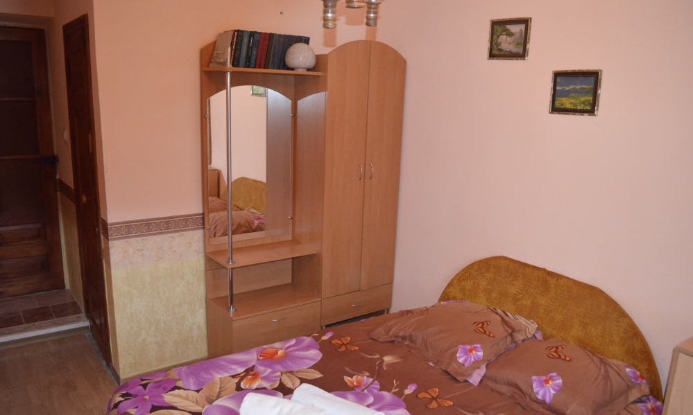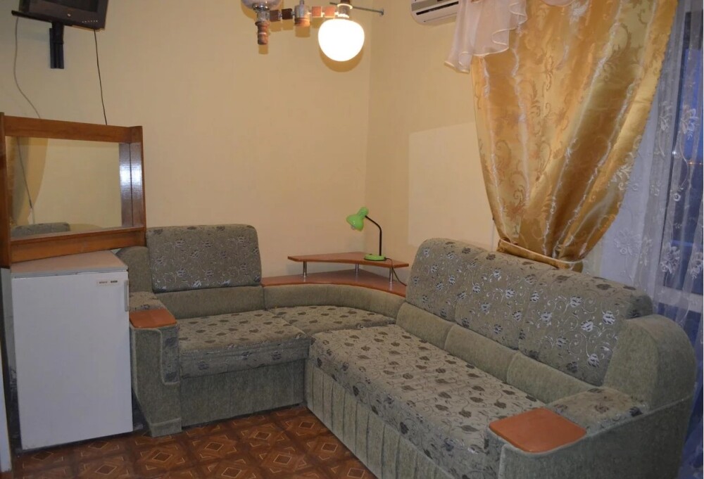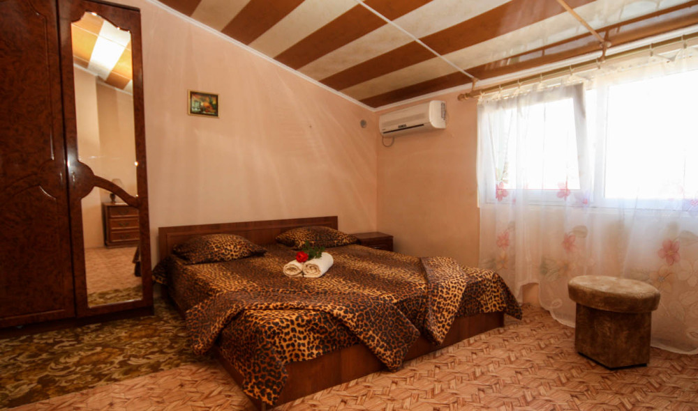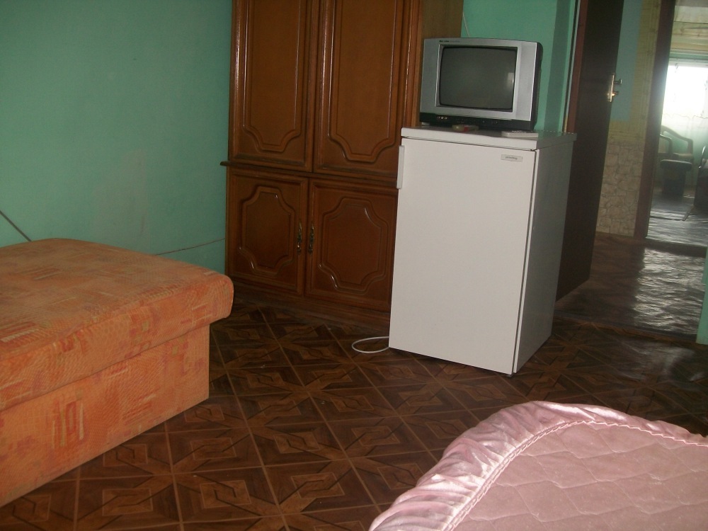В номере: кровати 1,80 м х 2,00 м и диванчик 1,40 х 1,90, раскладывается вперёд. Шкаф, холодильник, телевизор, кондиционер, тумбочки. Санузел, вода горячая круглосуточно (солнечные батареи). Рядом кухня общего пользования.
