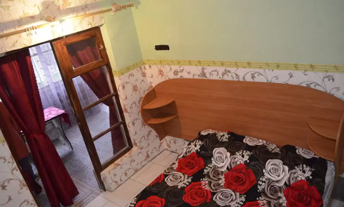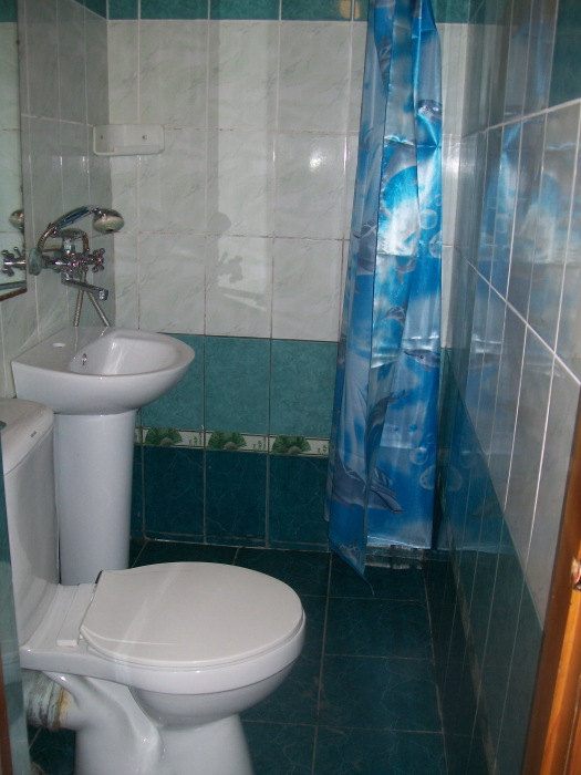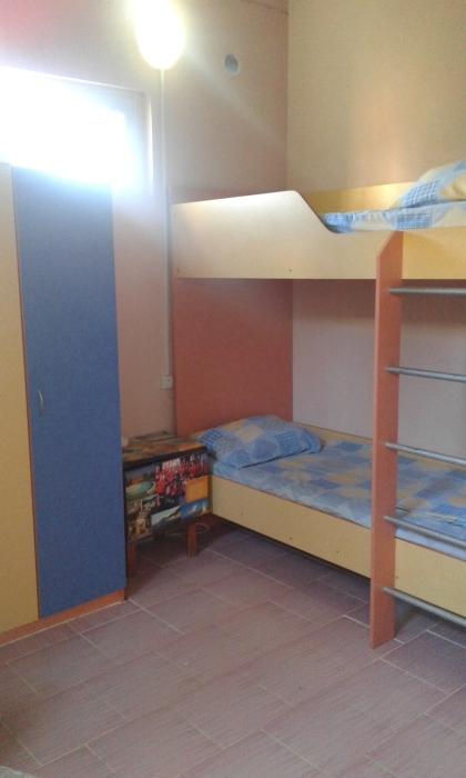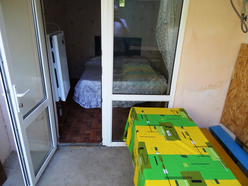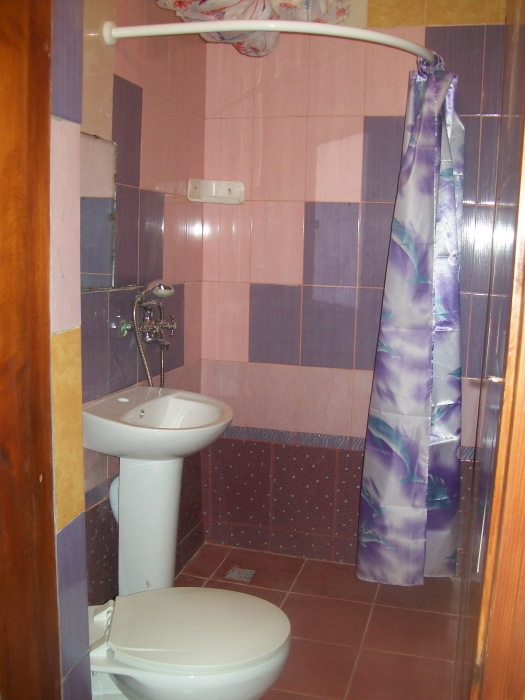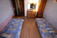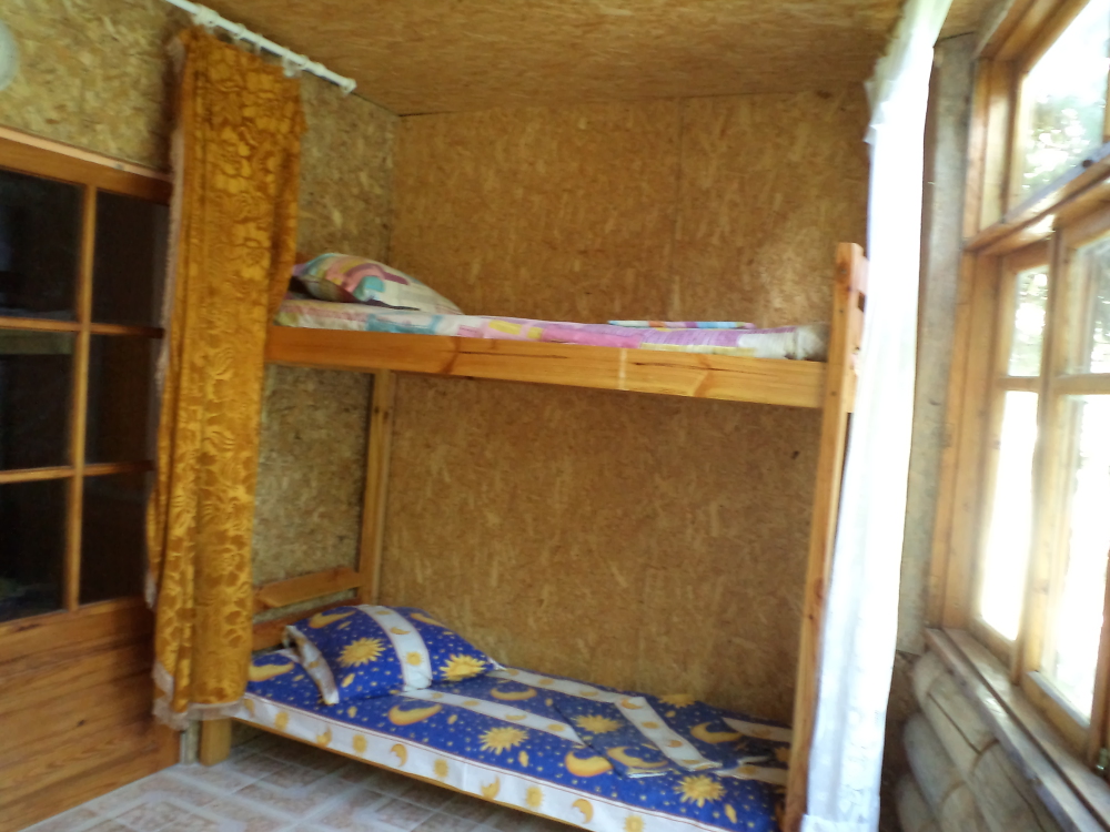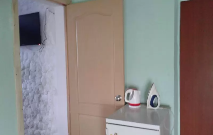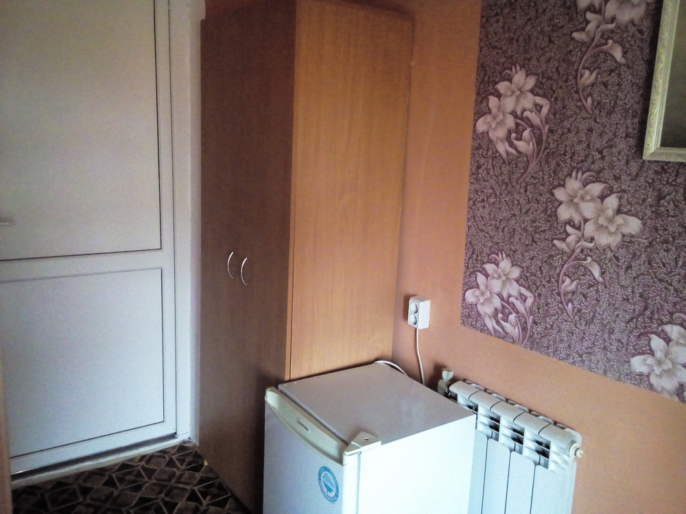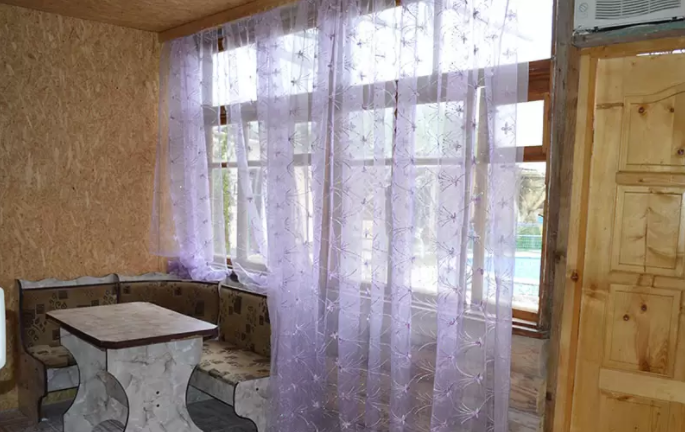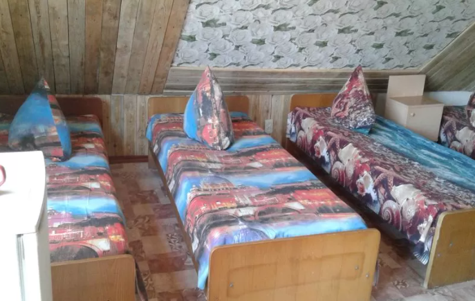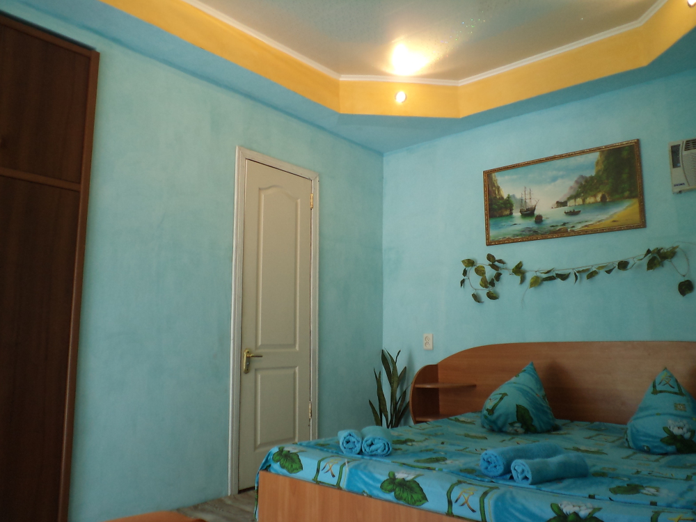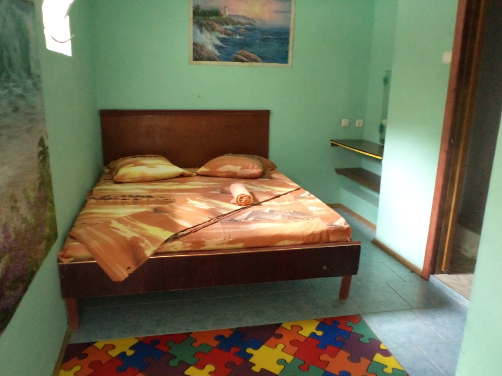 В номере: кровати 1,80 м х 2,00 м и диванчик 1,40 х 1,90, раскладывается вперёд. Шкаф, холодильник, телевизор, кондиционер, тумбочки. Санузел, вода горячая круглосуточно (солнечные батареи). Рядом кухня общего пользования.