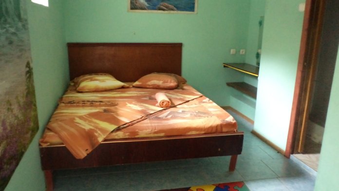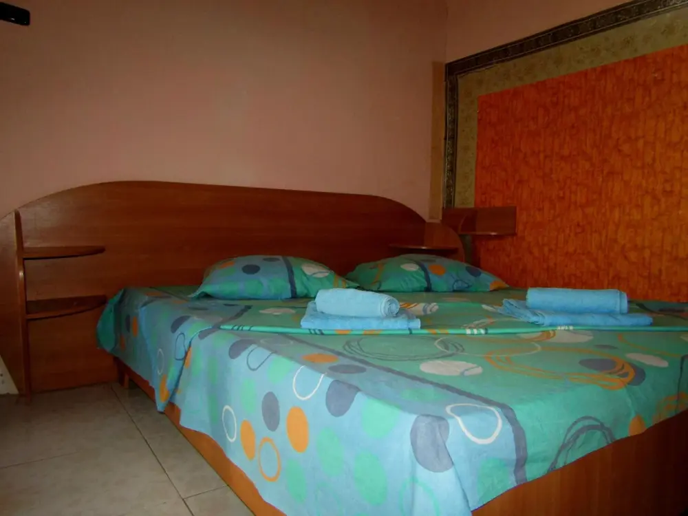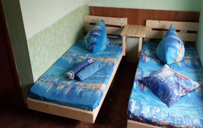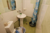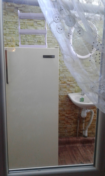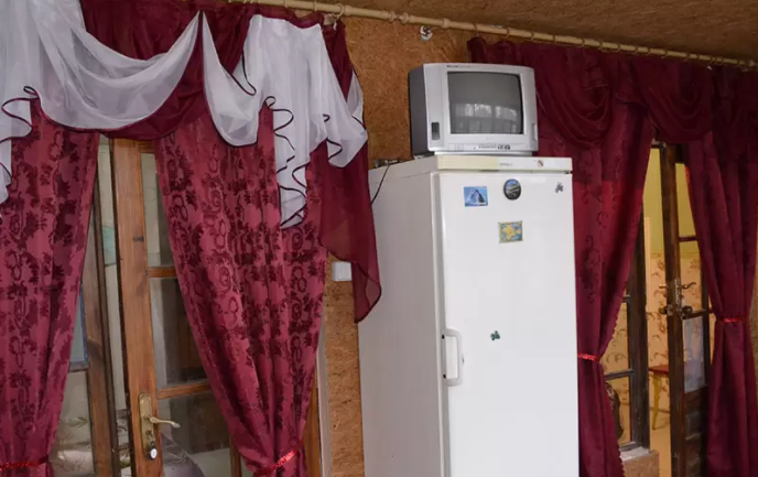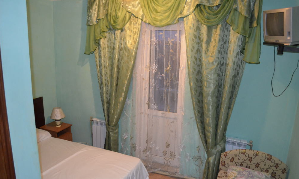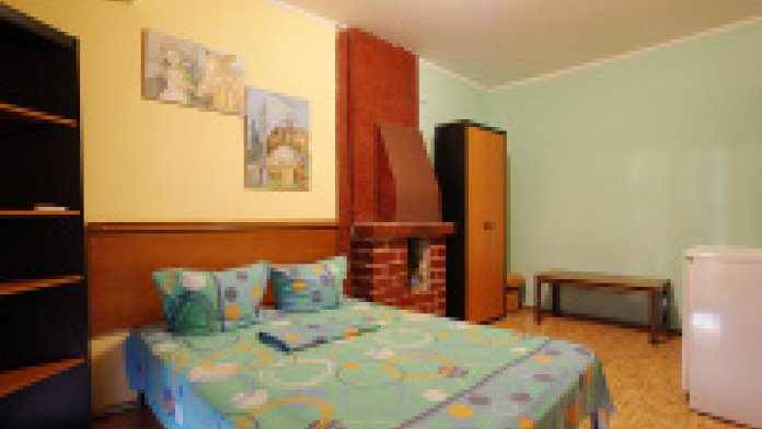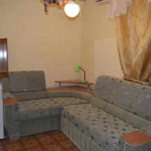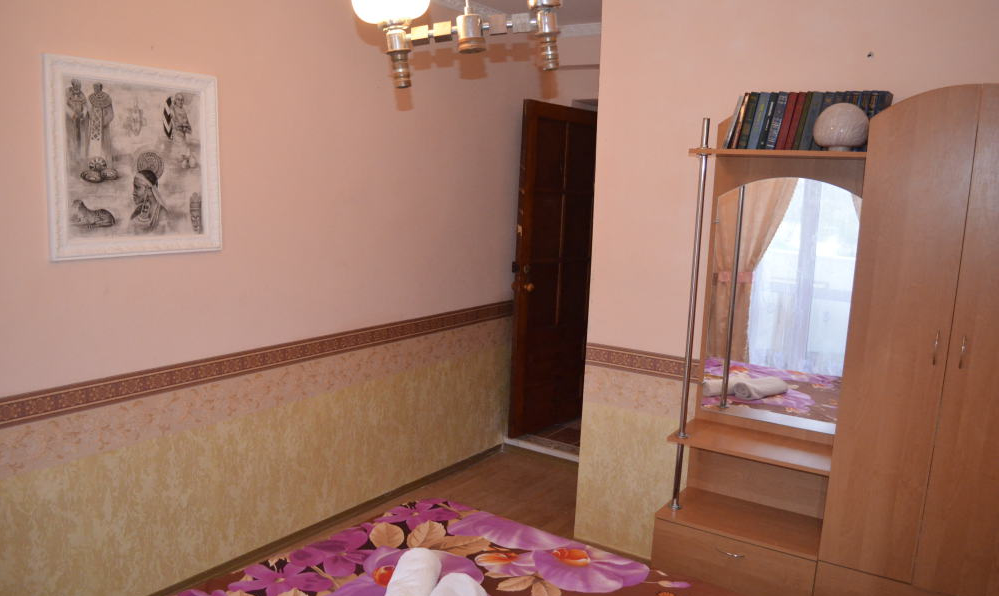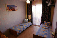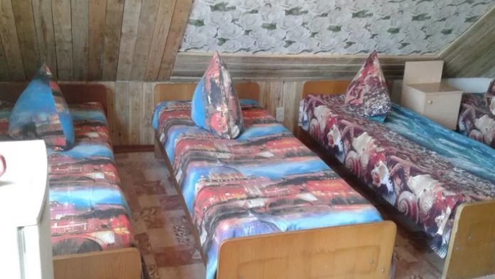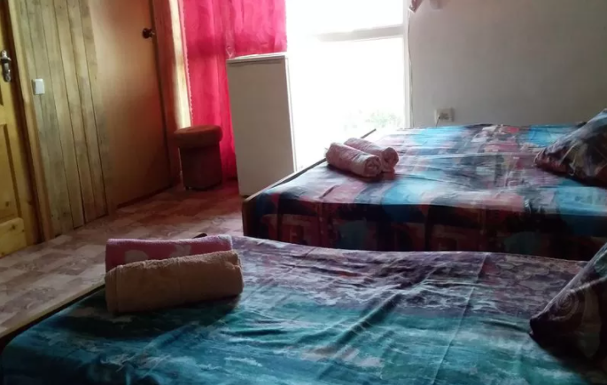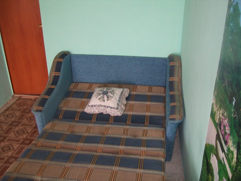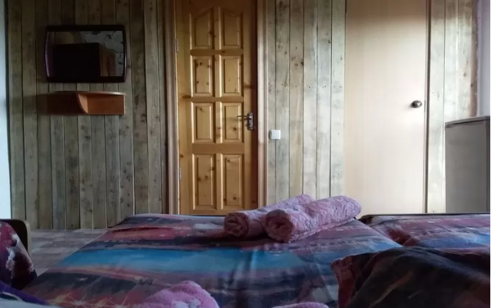 В номере: кровати 1,80 м х 2,00 м и диванчик 1,40 х 1,90, раскладывается вперёд. Шкаф, холодильник, телевизор, кондиционер, тумбочки. Санузел, вода горячая круглосуточно (солнечные батареи). Рядом кухня общего пользования.