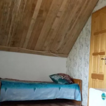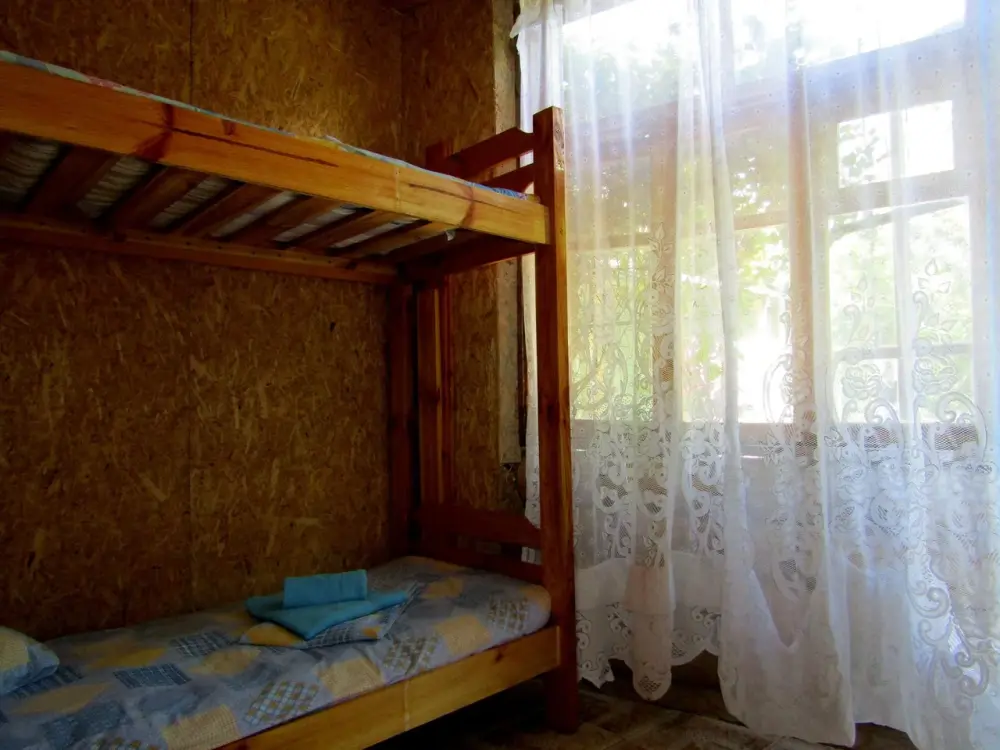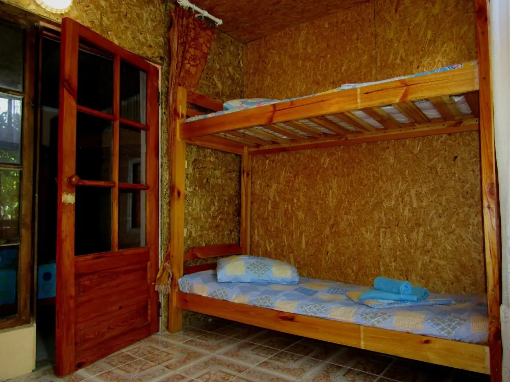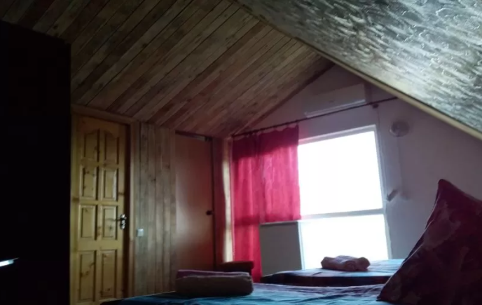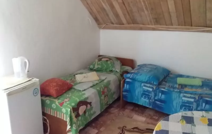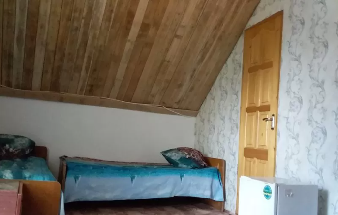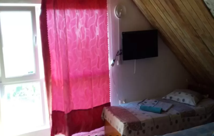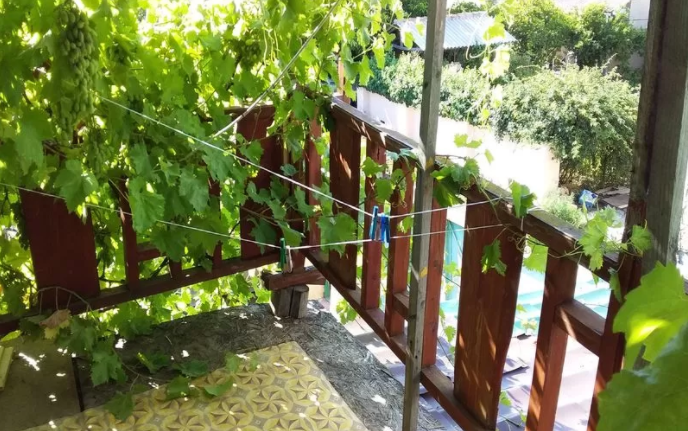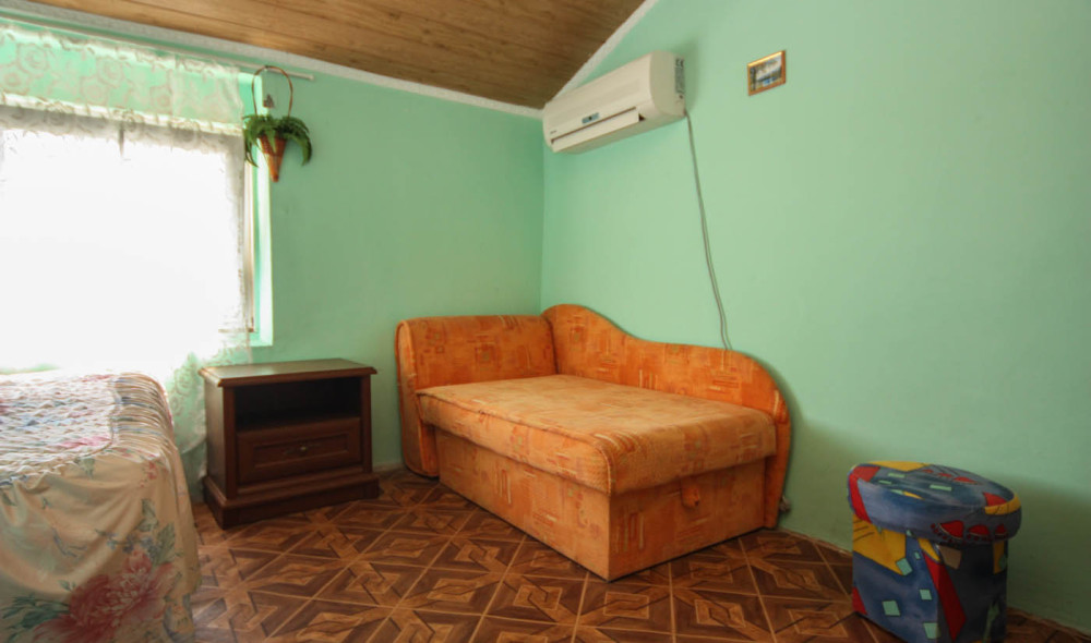 На 2 этаже, в отдельно стоящем летнем домике. Санузел в номере (душ, туалет, умывальник). Кровати: одна общая и две 0,9 х 2 м (можно сдвигать в одну большую), шкаф, тумбочки, зеркало, телевизор, холодильник, кондиционер, чайник. Беседка уютная и удобная только для Вас, завита виноградом. Есть мангал и дрова бесплатно. Кухня общего пользования находится в 10 м от Вашего жилья. Там же бассейн и детская площадка.