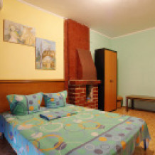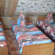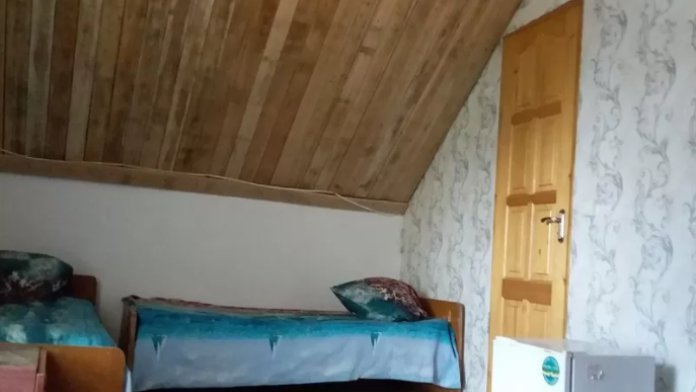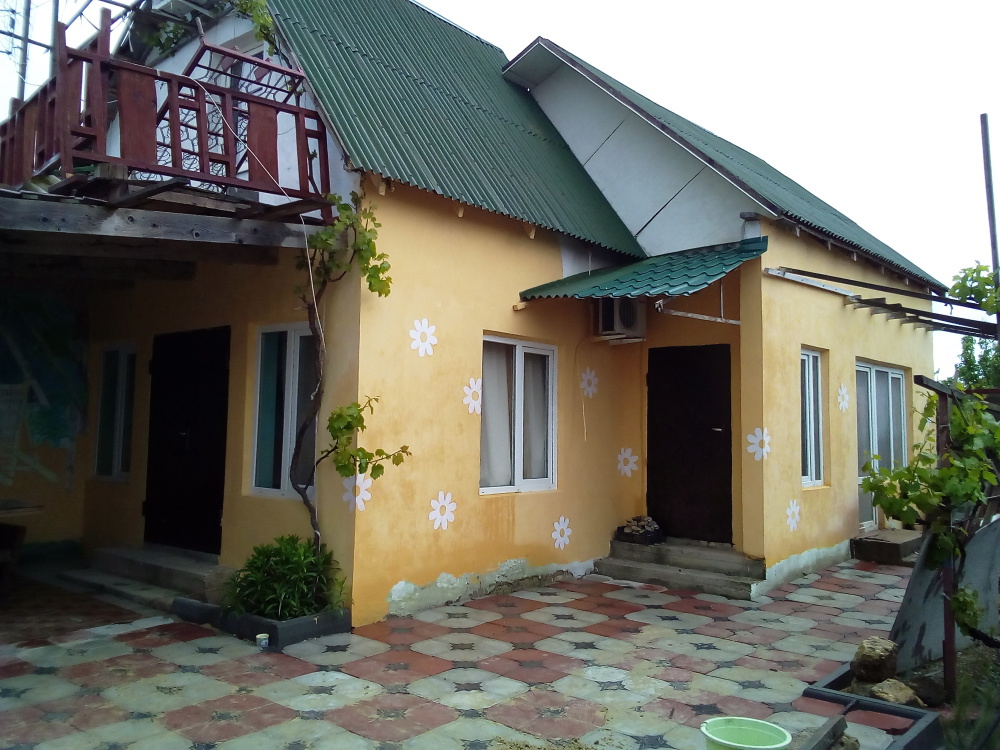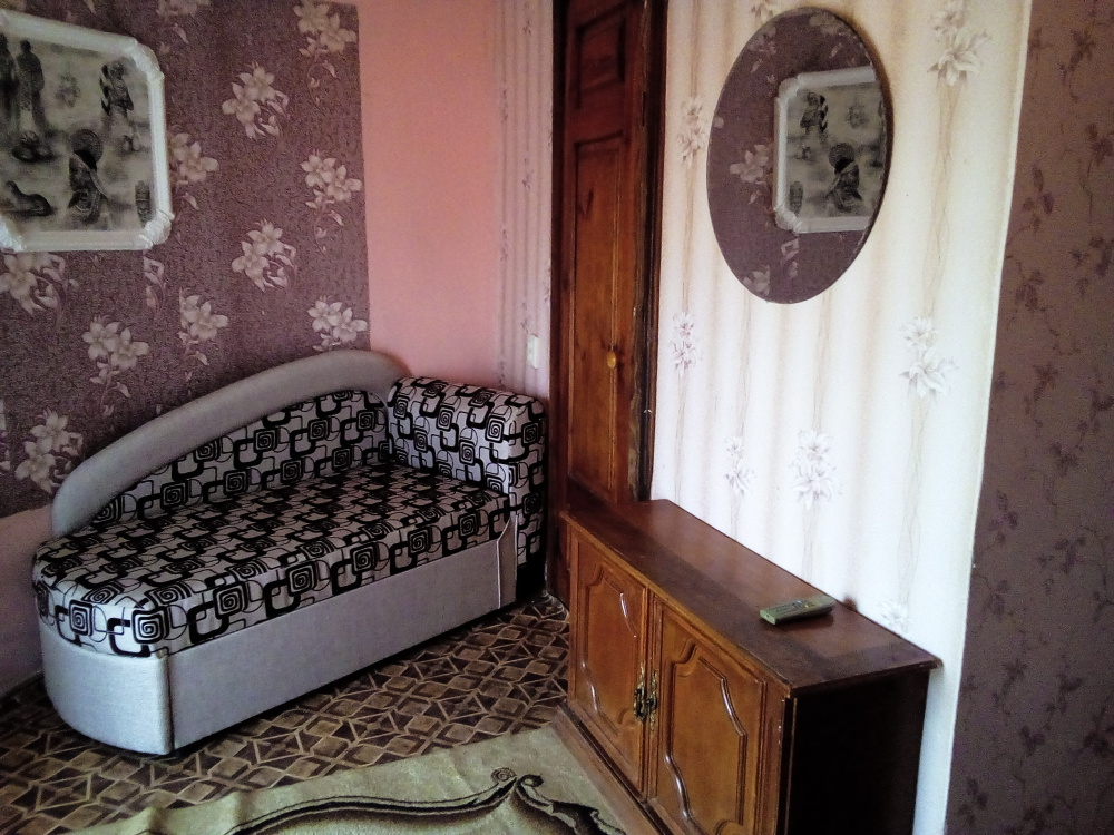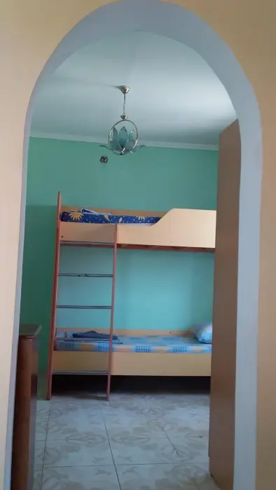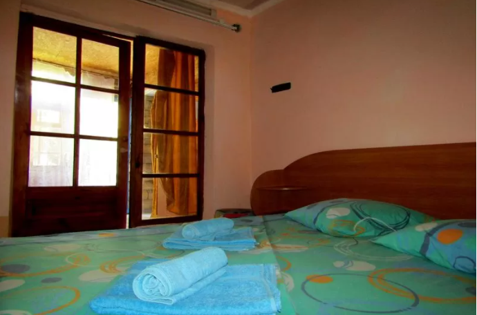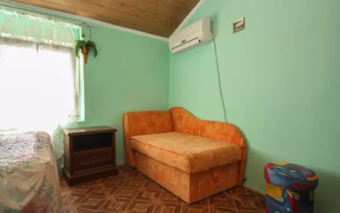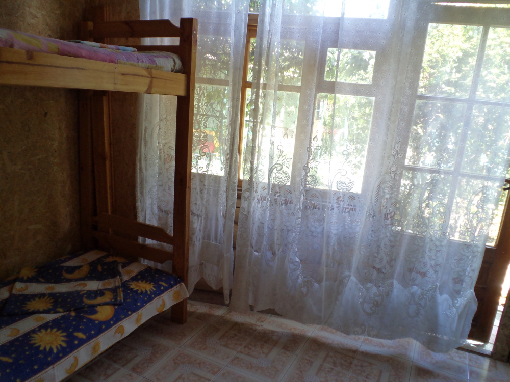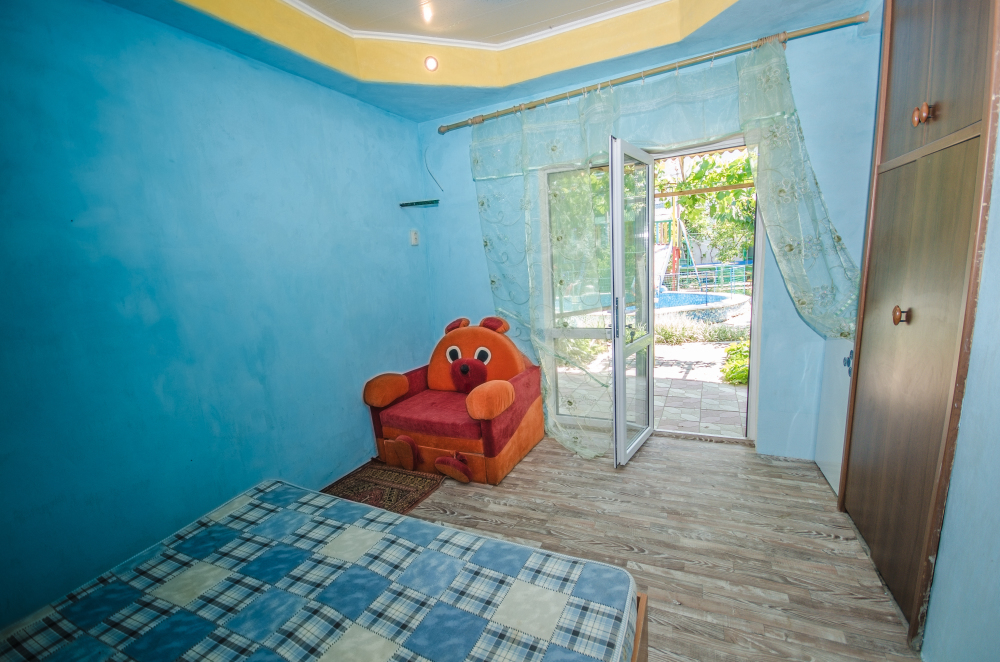 Номер состоит из 2-х комнат с дверью. Одна их комнат проходящая. Кровать широкая 1,8 х 2 м в одной комнате и 2-этажная кровать 0,9 х 2 м для детей в другой комнате. Душевая кабинка, туалет, умывальник. Шкаф, телевизор, холодильник, кондиционер, чайник. Окна завиты виноградом, в комнатах не жарко. Фрукты и овощи можно есть: посажено для Вас дорогие наши Гости.