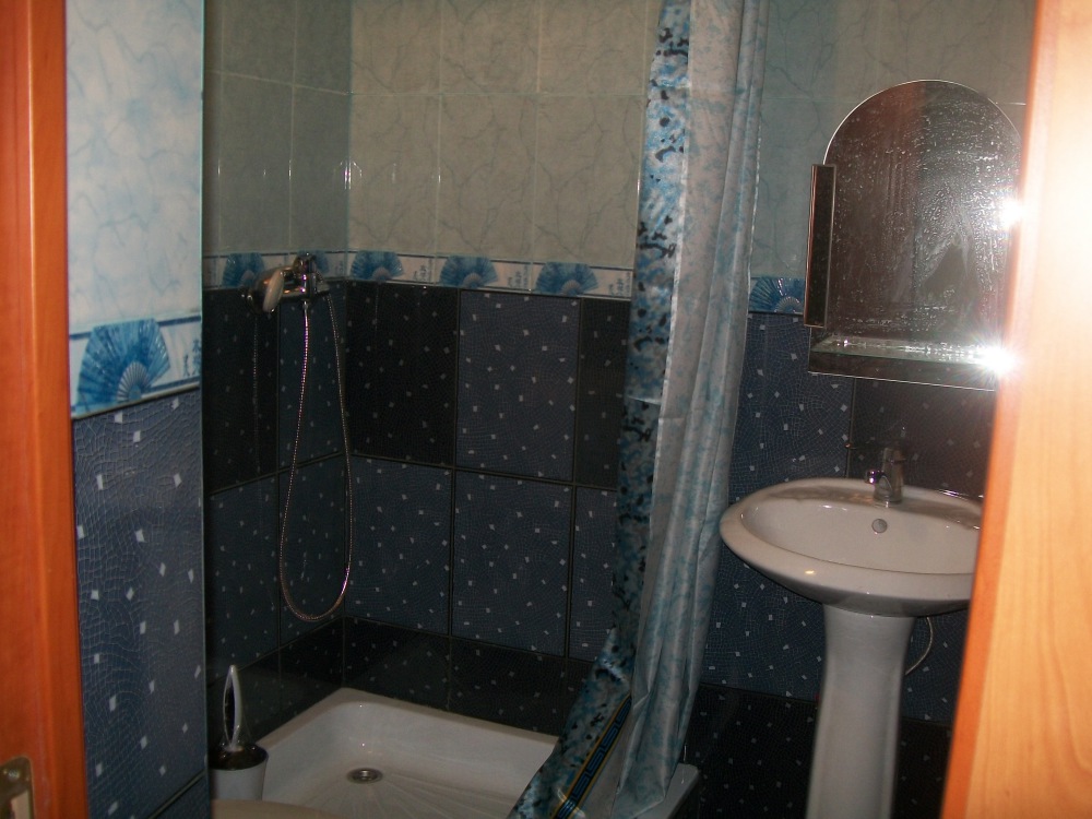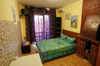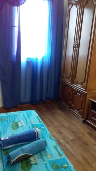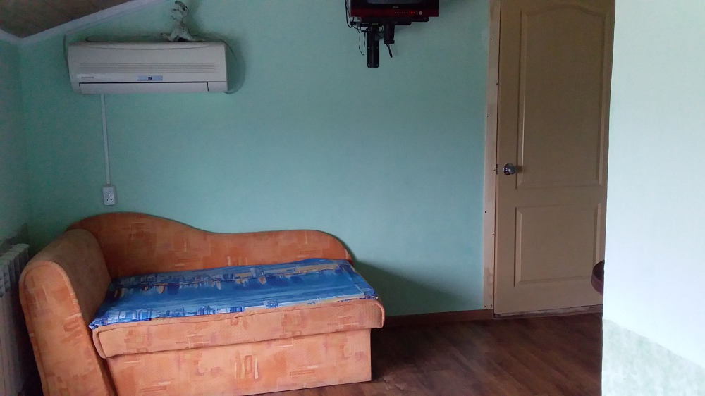 Номер на 3 этаже. Широкая кровать 1,8 м х 1,9 м, диванчик для одного взрослого ребёнка размер 0,8 х 1,9 м и диван 1,4 х 1,9 м раскладывающийся вперёд для 2 взрослых детей. Всего 5 спальных мест. Есть вай-фай. В номере: кондиционер, телевизор, холодильник, чайник, стол, шкаф, тумбочка. Санузел (душ, туалет, умывальник) в номере. Комната находятся в мансарде. Горячая вода круглосуточно. Кухня за стеной.