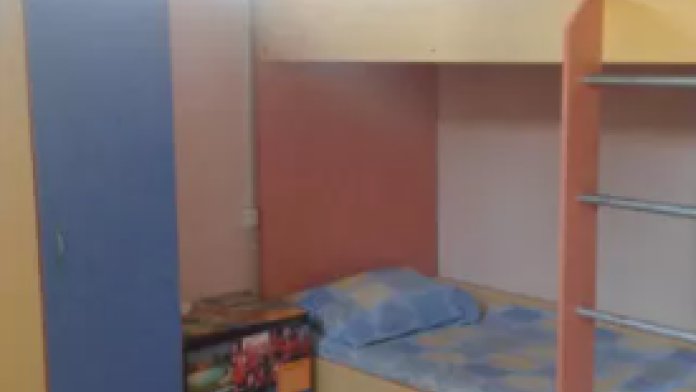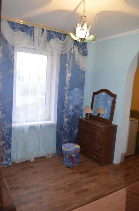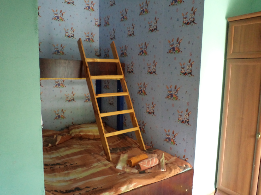На 3 этаже. Санузел в номере. Кровать широкая 1,6 х1,9 м в спальне, вместительный шкаф, зеркало, тумбочка. В детской комнате спальные места для 3 деток: кресло - кровать 0,9 х 2 м длиной (для взрослого или старшего ребёнка) и кроватки для младших детей 0,75 х 1,6 м - 2 шт. 2 телевизора, в каждой комнате, холодильник, кондиционер, чайник. Горячая вода круглосуточно. Комната находятся в мансарде. Кухня напротив Вашей двери.