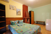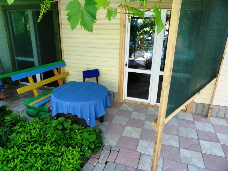 Комната во дворе, находится возле кухни. Кровать 1,80м х 2м и раскладное кресло 0,90 м х 1,70 м, в виде медвежонка для ребёнка подросткового возраста. Есть холодильник, телевизор, кондиционер, шкаф, тумбочки, прикроватные коврики. Санузел с душевой кабинкой. Дворик - столовая с лавочкой, столом и стульями.